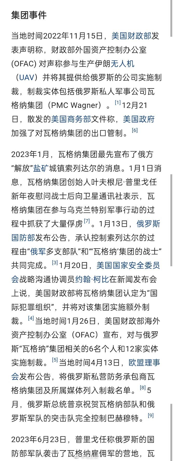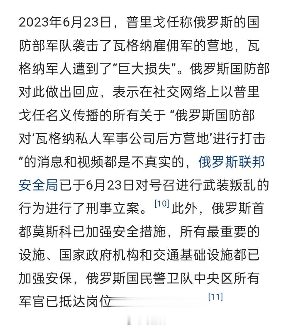 大事件,#俄罗斯#发布声明称,瓦格纳集团领导人普里戈任在社交平台传播的关于 “俄罗斯对‘瓦格纳私人军事公司后方营地’进行打击 ”的消息和视频都是不真实的,是一种信息挑衅。俄罗斯联邦已对普里戈任号召叛 乱进行立案。