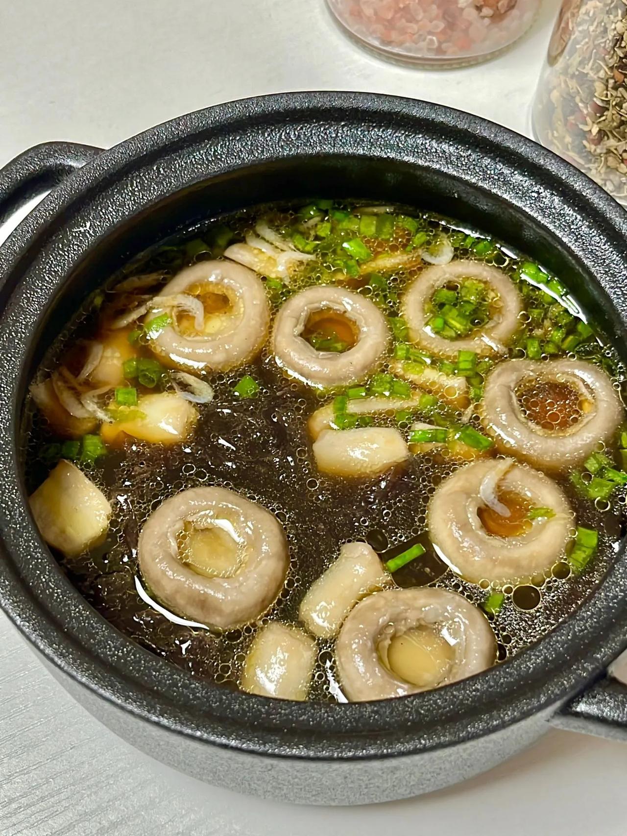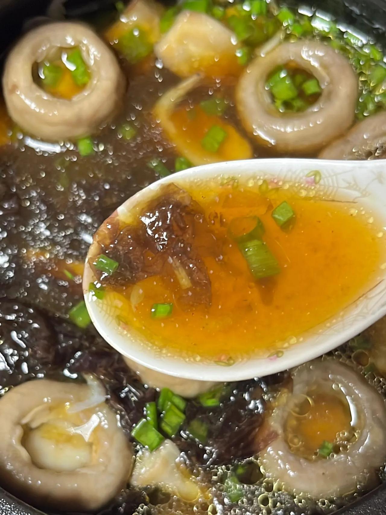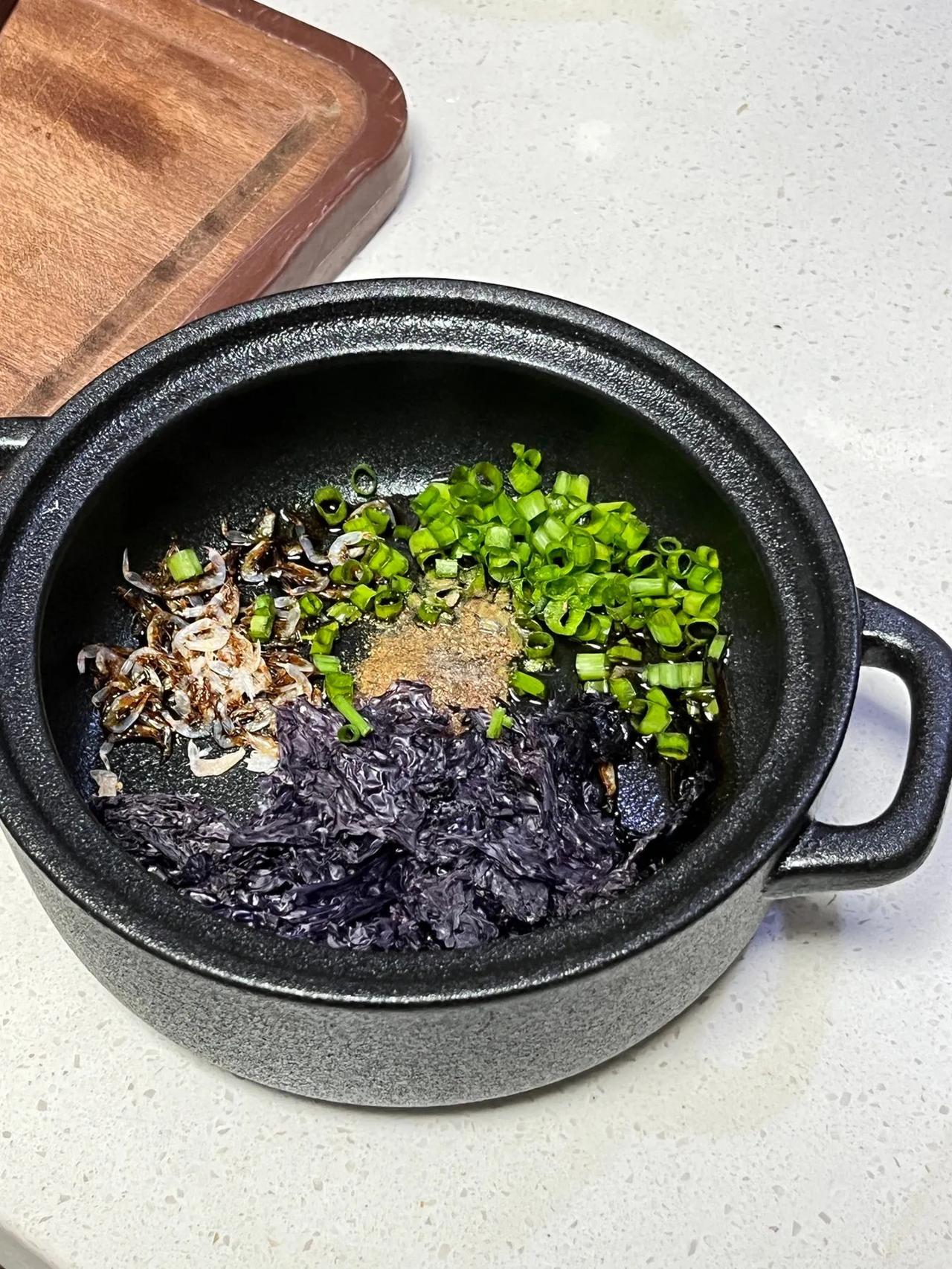 今天喝口蘑紫菜汤,太鲜了! 做法: 1、碗里放紫菜、虾皮、葱花儿、香油、生抽、白胡椒和少许盐; 2、把口蘑口朝上煎出汁水,再加一碗水烧开盛到碗里即可。