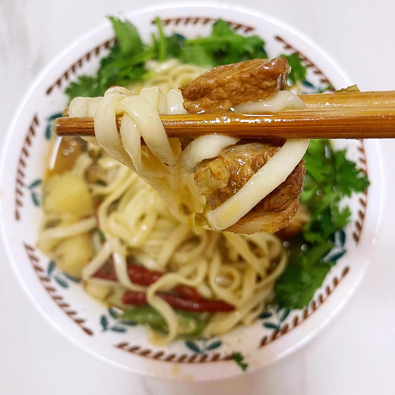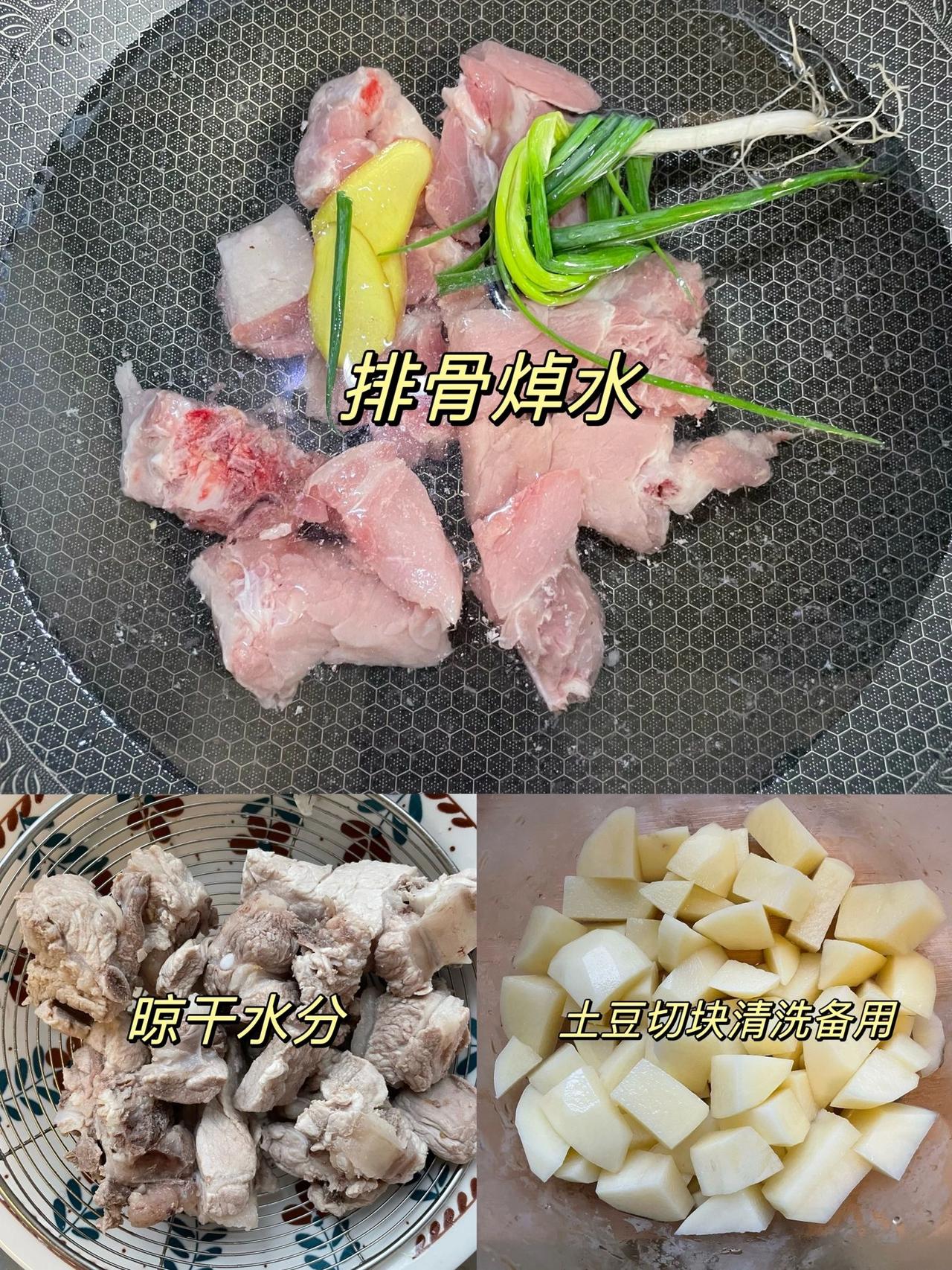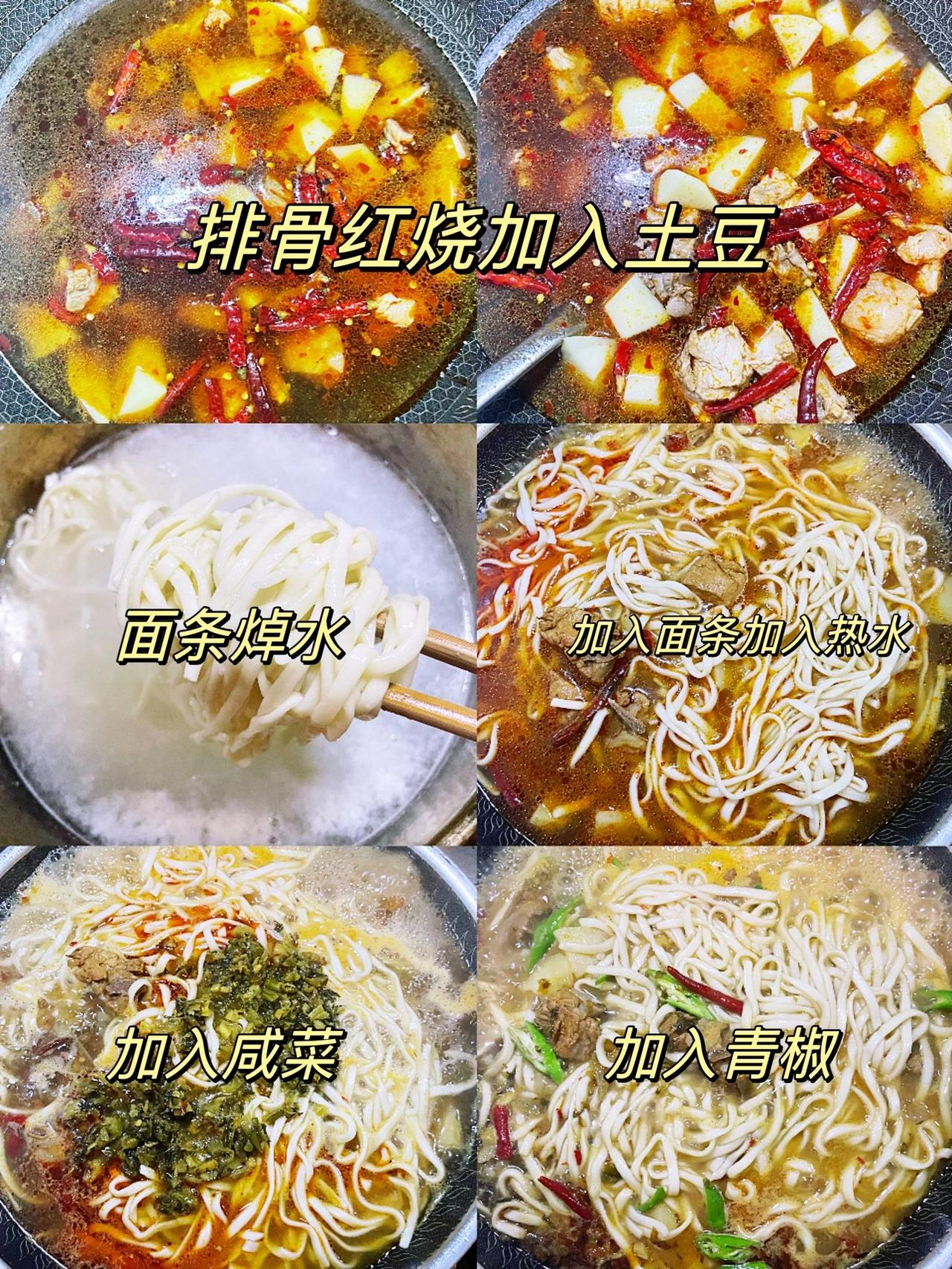排骨土豆面!20°的浙江需要给男女朋友来上一碗热腾腾的排骨面暖暖身子! 食材:手工面两人份,干辣椒,排骨一节,香菜一把,土豆两个。 1、菜市场买手工面现成的4块钱,排骨一节切小段加入去腥三件套焯水晾干,香菜切断备用,干辣椒切断,土豆切块清洗干净。 2、冷锅下油加入一勺豆瓣酱炒出红油,排骨稍微煎一下,倒入一勺生抽,半勺老抽,一勺蚝油,一勺白糖快速翻炒,加入没过排骨的水分,加入土豆块,小火闷煮40分钟 。 3、面条焯水捞出,加入锅中,再加一些热水,煮2分钟,加入咸菜,加入线椒段。 4、锅中加入盐鸡精调味,盛出,在里面上加一点香菜末,一点醋,美味的土豆排骨面就搞定了! 真的太香了,给20°的浙江暖暖身子,酸酸辣辣太美味拉!快艾特你的男女朋友来学给你做!