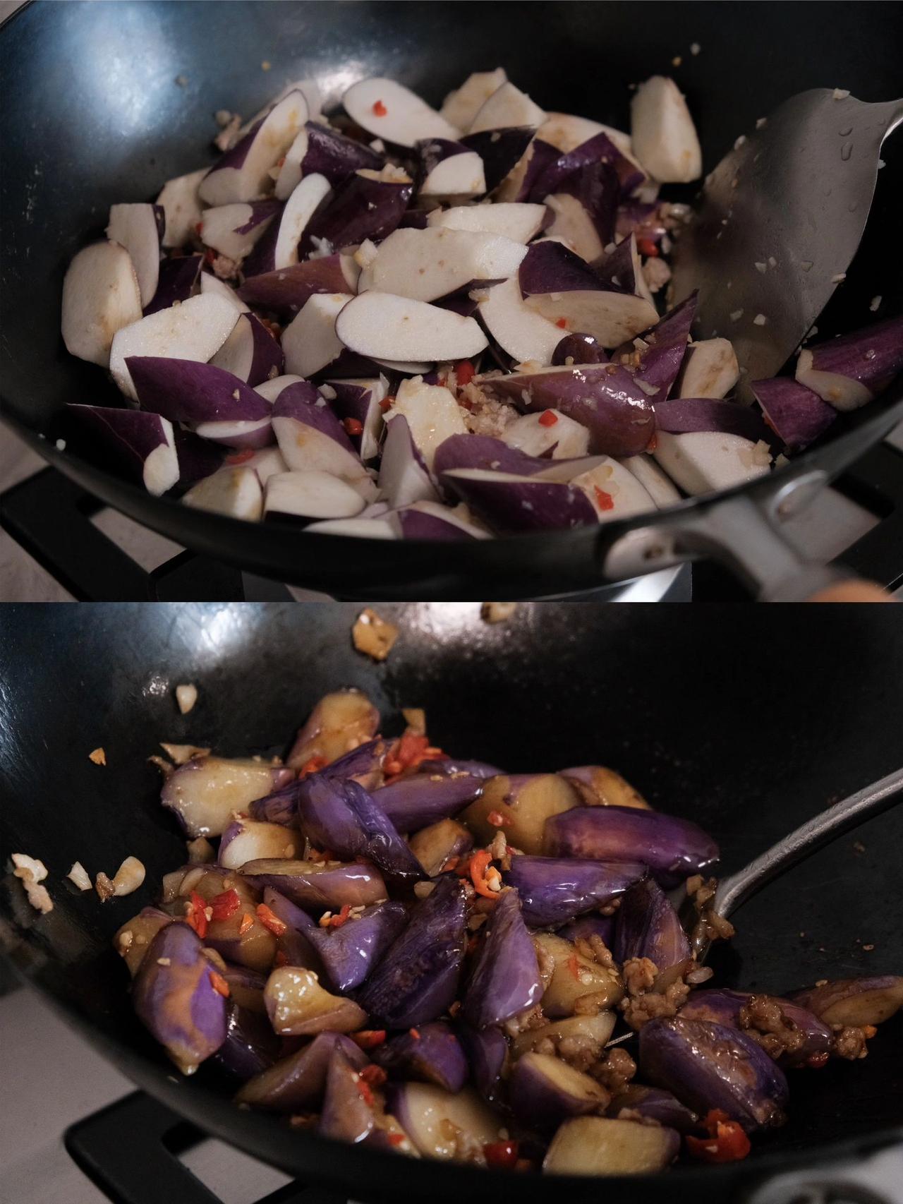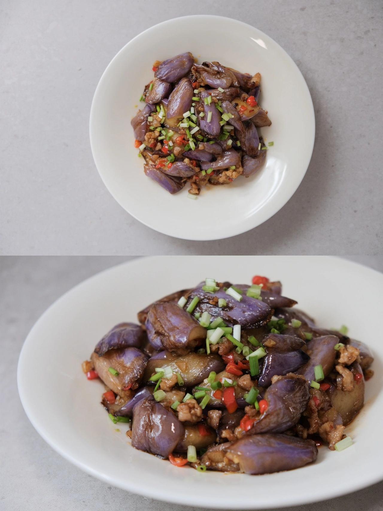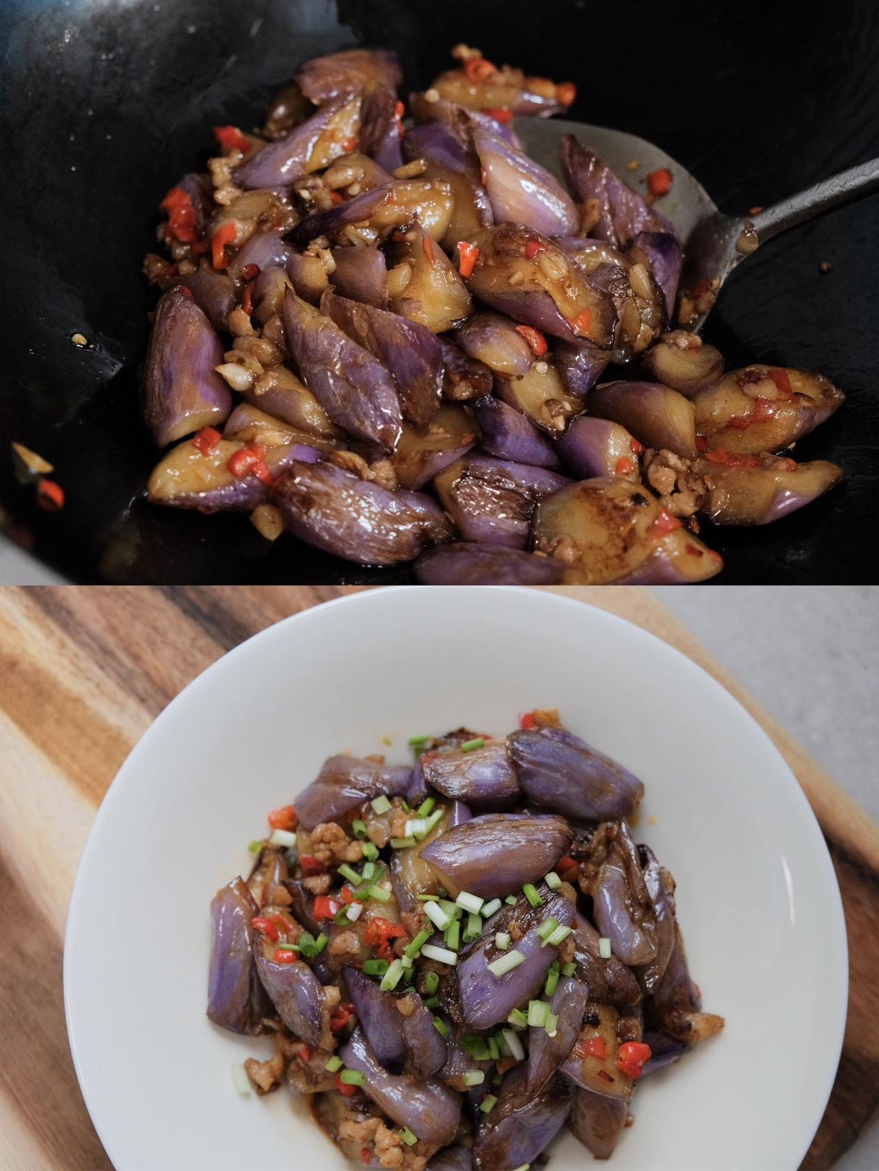 顺时而食,应季菜单,肉末茄子 一到夏季菜市场的茄子就多起来了,小时侯家里只吃线茄,第一次见到长茄圆茄还有点吃惊,都试过后还是最爱线茄,总感觉其他品种的皮有点厚 食材:线茄2-3根、瘦肉、蒜、小米椒适量 做法:1、茄子切滚刀块,盐水浸泡15分钟,用手挤压沥干水份,肉剁肉末,放一点料酒腌制一会,蒜、小米椒切碎备用。 2、热锅下油,先把蒜末小米椒爆香,再倒入肉末炒散,然后下茄子不停翻炒,一边炒一边用锅铲压茄子,炒至茄子变软。 3、生抽从锅边淋入,加少许蚝油,翻炒均匀撒上一点葱花即可。(喜欢吃很软烂的可以盖上锅盖稍微焖一会)