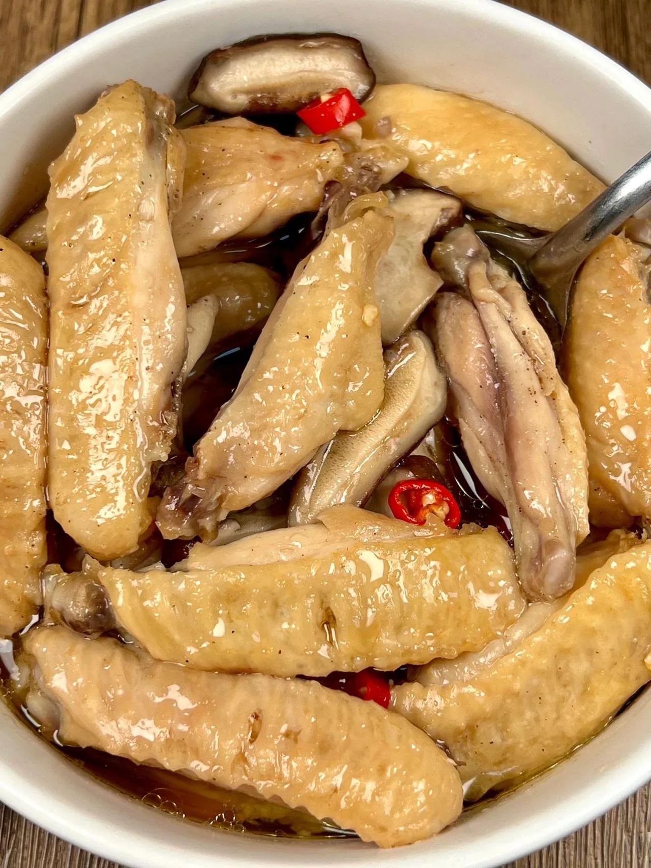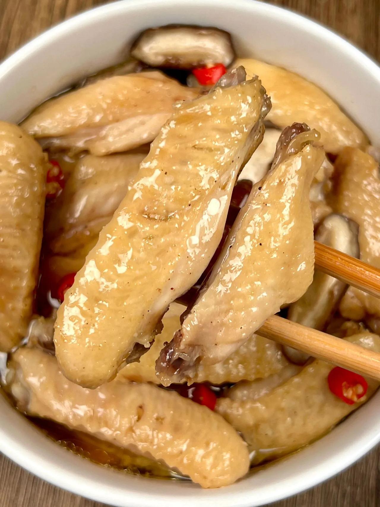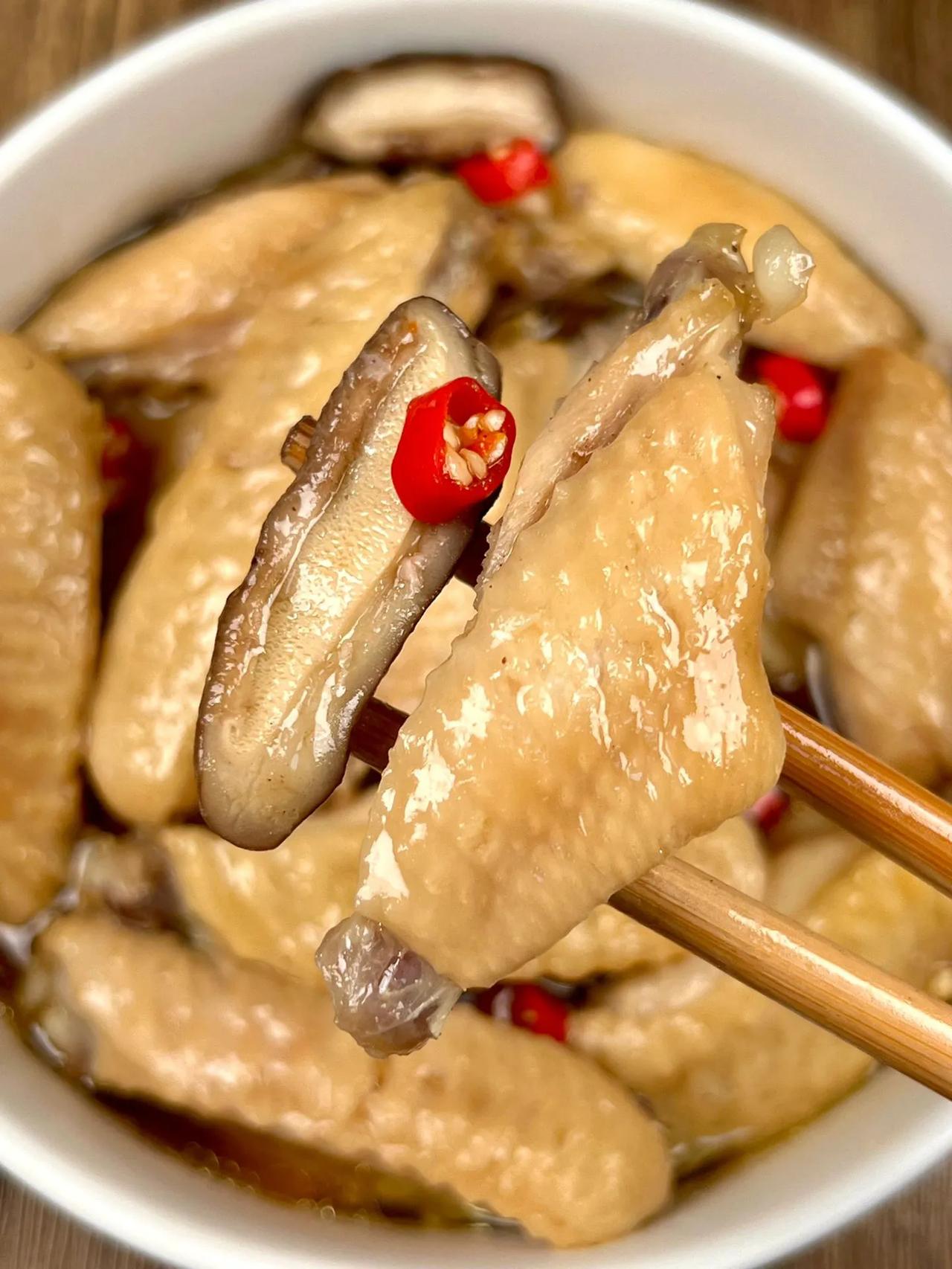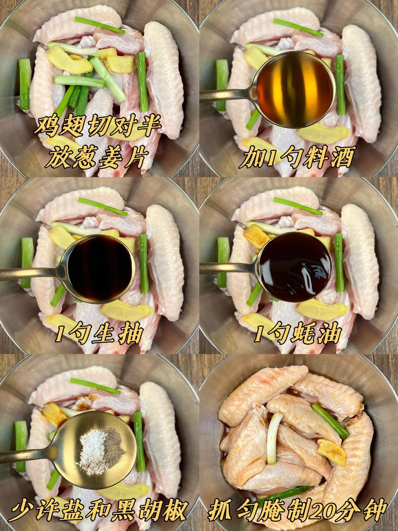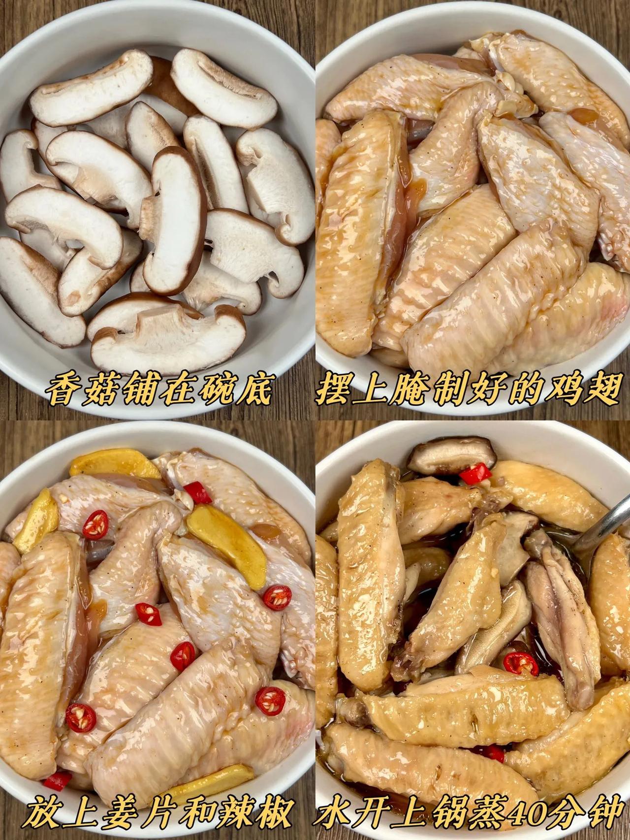 无油蒸鸡翅,有肉有菜,方便低卡还好吃! 做法: 1、鸡翅切对半放葱姜片,加1勺料酒、1勺生抽、1勺蚝油、少许盐、黑胡椒抓匀腌制20分钟; 2、香菇铺在碗底,摆上腌制好的鸡翅,放上姜片和辣椒,水开上锅蒸40分钟即可。