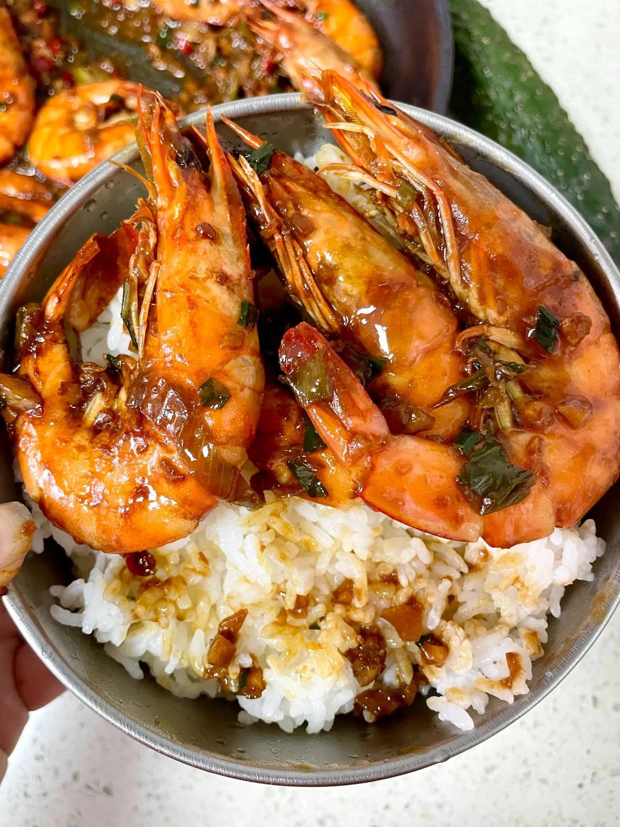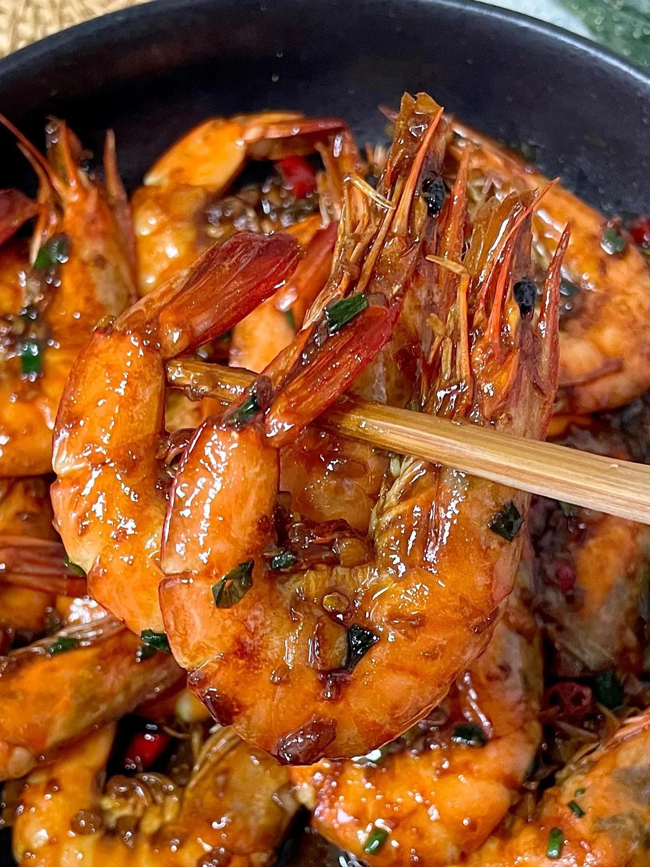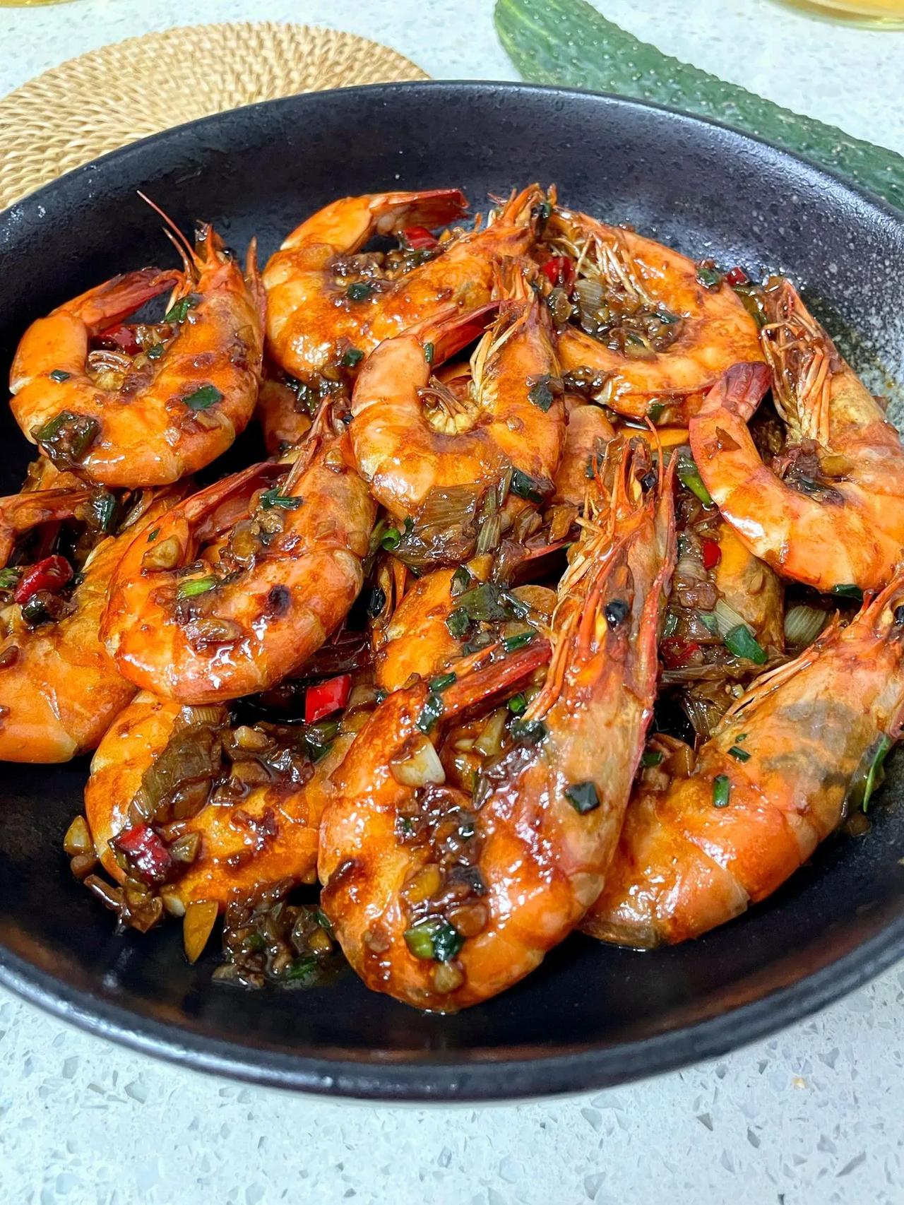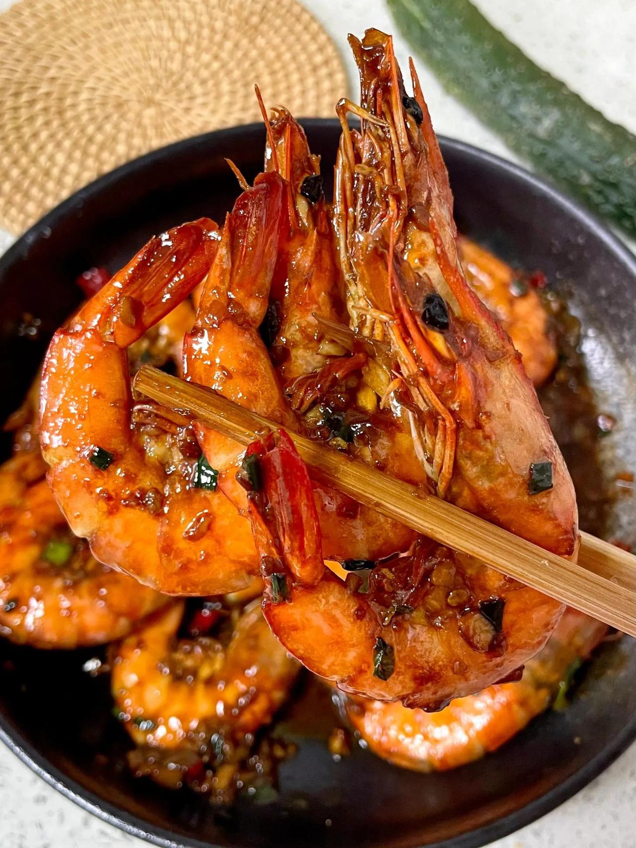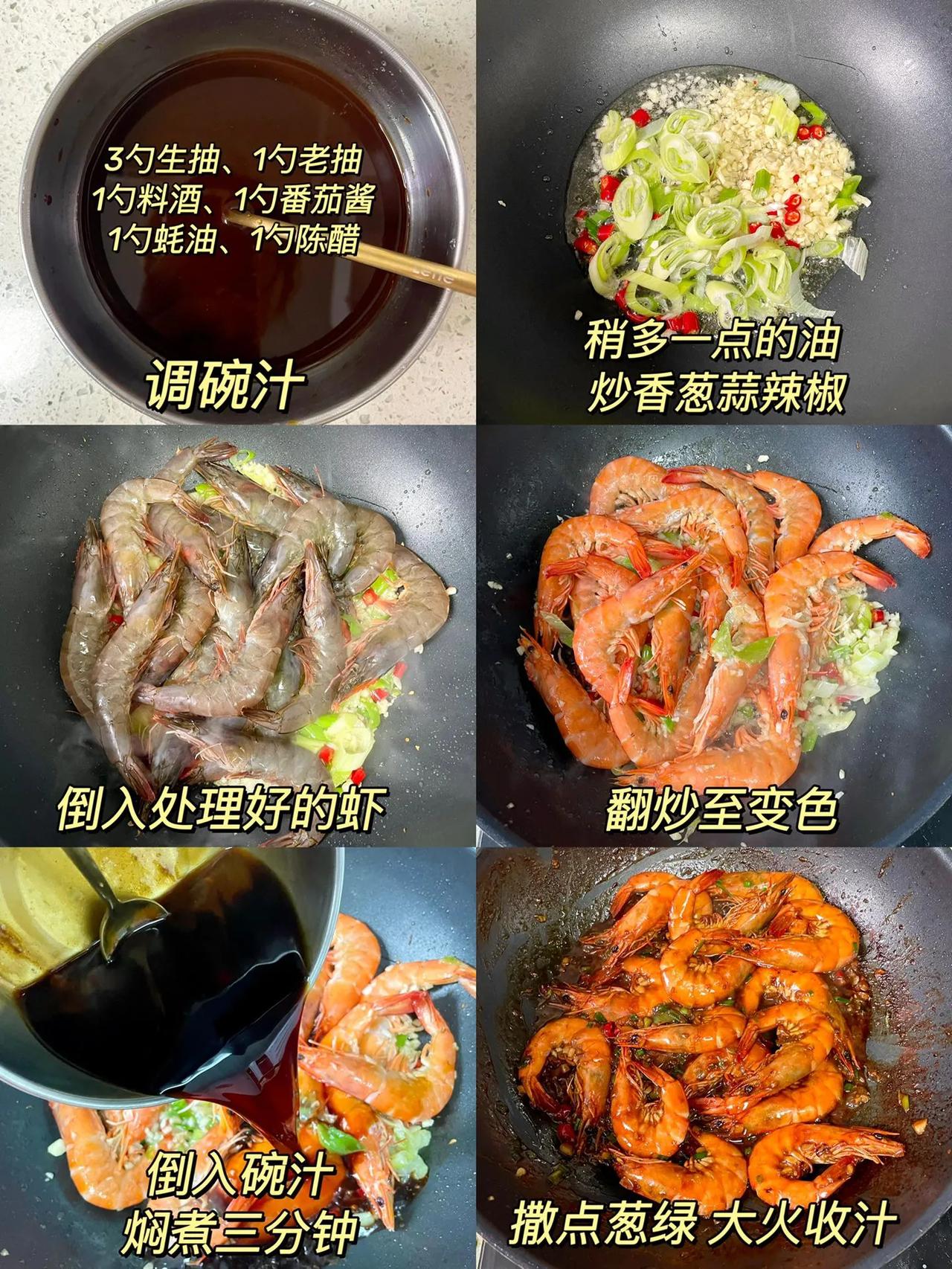 这个油焖虾我家一周都会吃三次太赞了! 做法: 1、调碗汁:碗中放3勺生抽、1勺老抽、1勺料酒、1勺番茄酱、1勺蚝油、1勺陈醋搅匀备用; 2、锅里放稍多一点的油,炒香葱蒜、辣椒 ,倒入处理好的虾翻炒至变色; 3、倒入碗汁焖煮三分钟,撒点葱绿大火收汁即可。