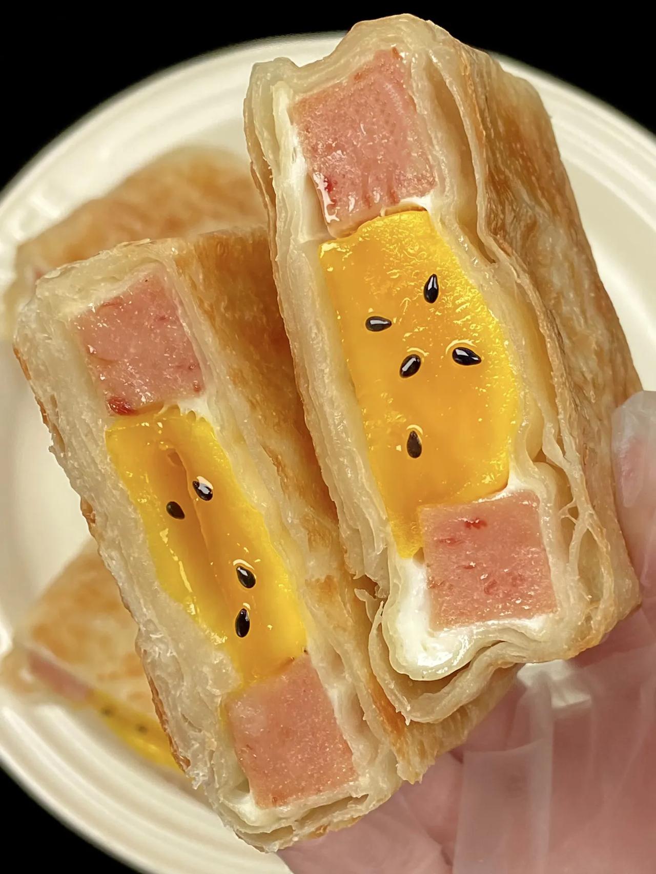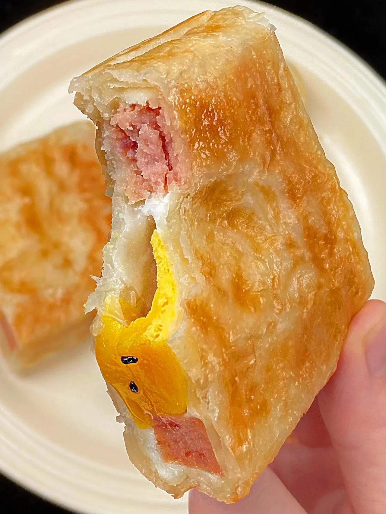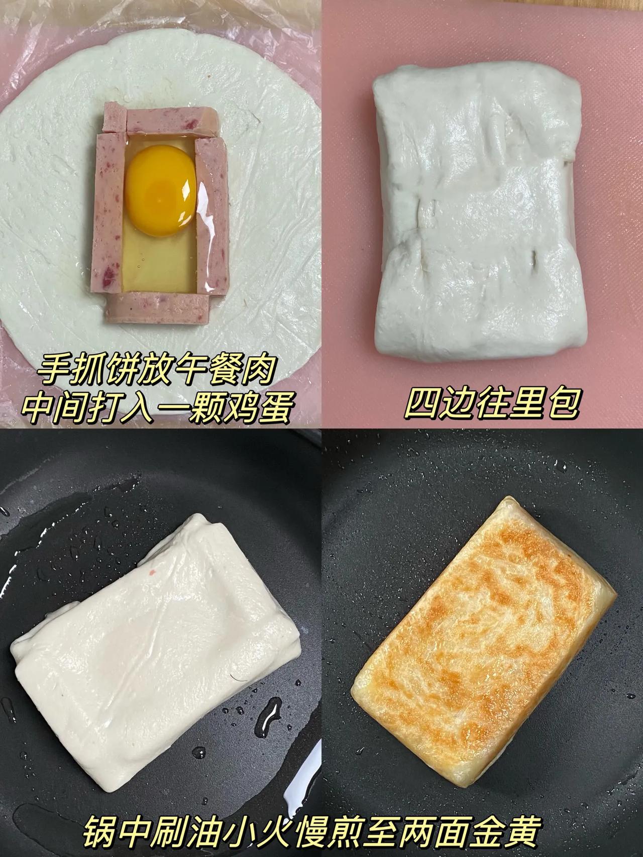 传下去,手抓饼以后都这么吃! 刷到的时候真的馋到我了!忍不住复刻了! 外面的手抓饼酥脆掉渣,里面鸡蛋鲜嫩,午餐肉油润,这也太好吃了叭! 做法: 1、手抓饼放午餐肉,中间打入一颗鸡蛋 四边往里包; 2、锅中刷油小火慢煎至两面金黄即可。