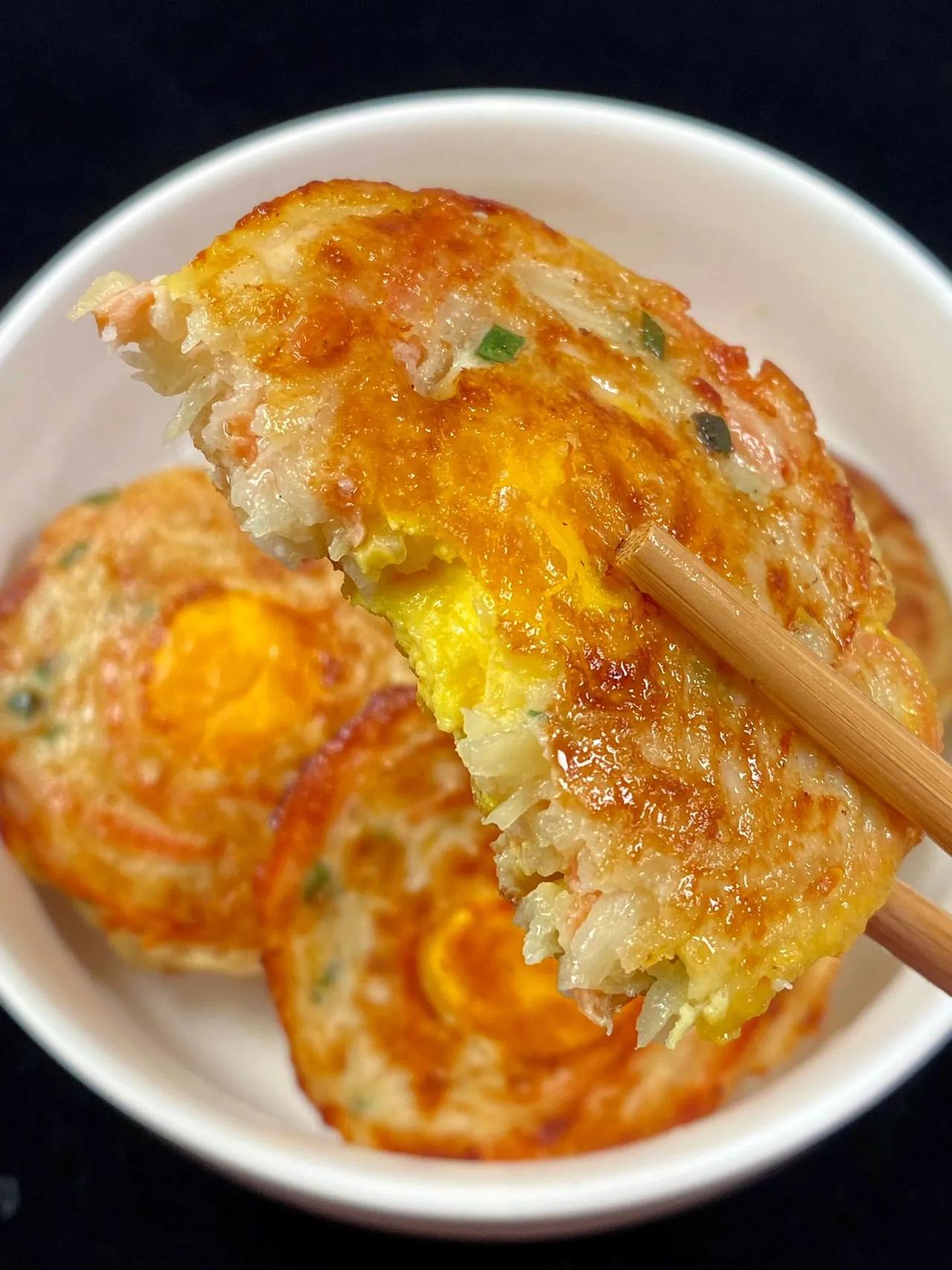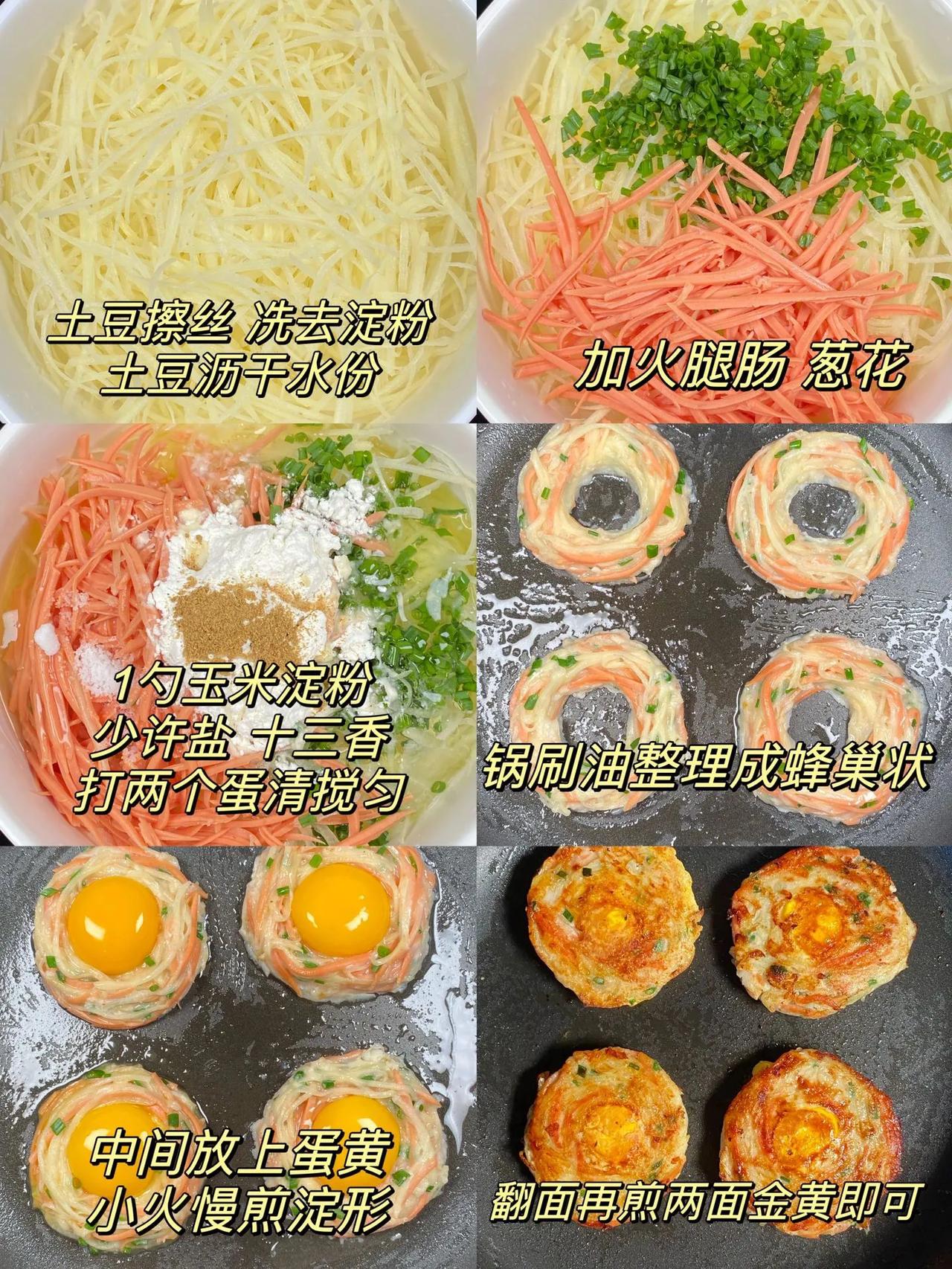 孩子的早餐一定要吃的有营养,有土豆就能搞定的土豆饼,做法简单孩子爱吃! 做法: 1、土豆擦丝冼去淀粉,土豆沥干水份,加火腿肠 、葱花、1勺玉米淀粉、少许盐、十三香,打两个蛋清搅匀; 2、锅刷油放入土豆整理成蜂巢状; 3、中间放上蛋黄,小火慢煎定形,翻面再煎两面金黄即可。