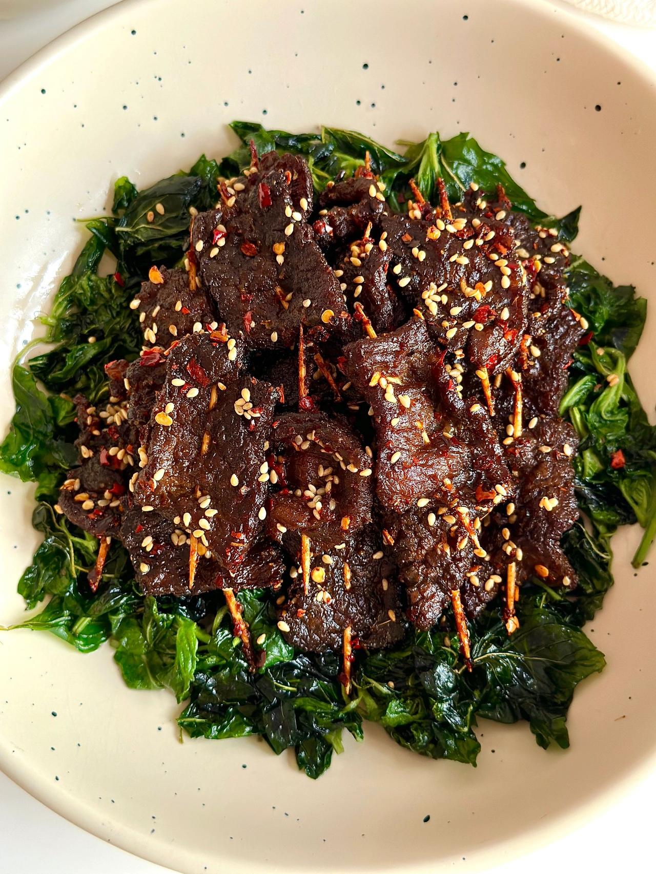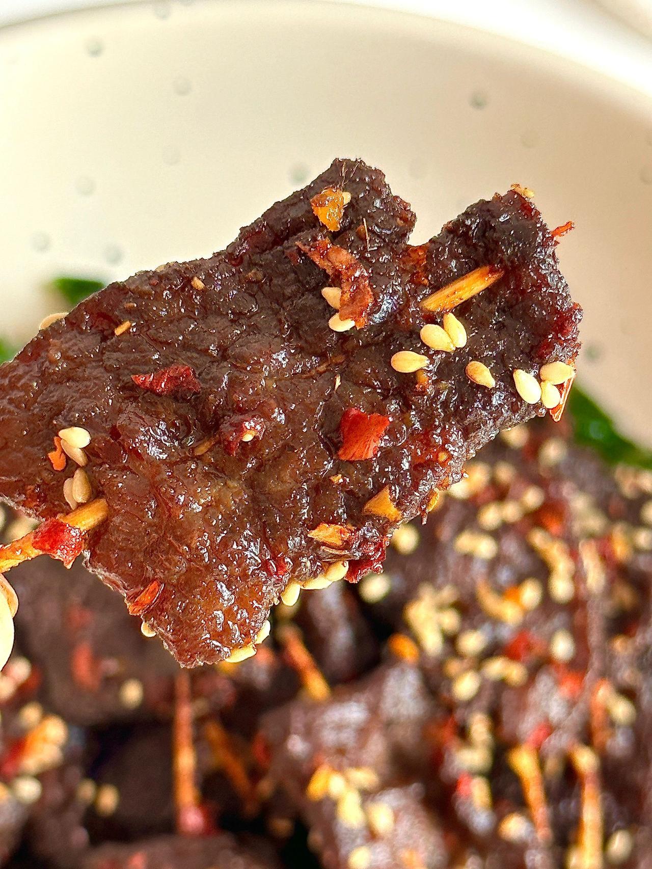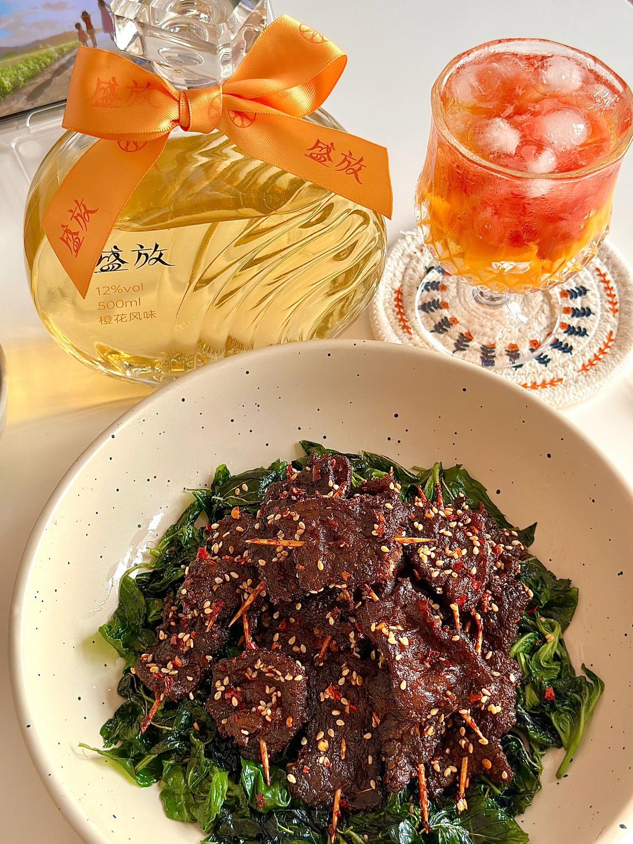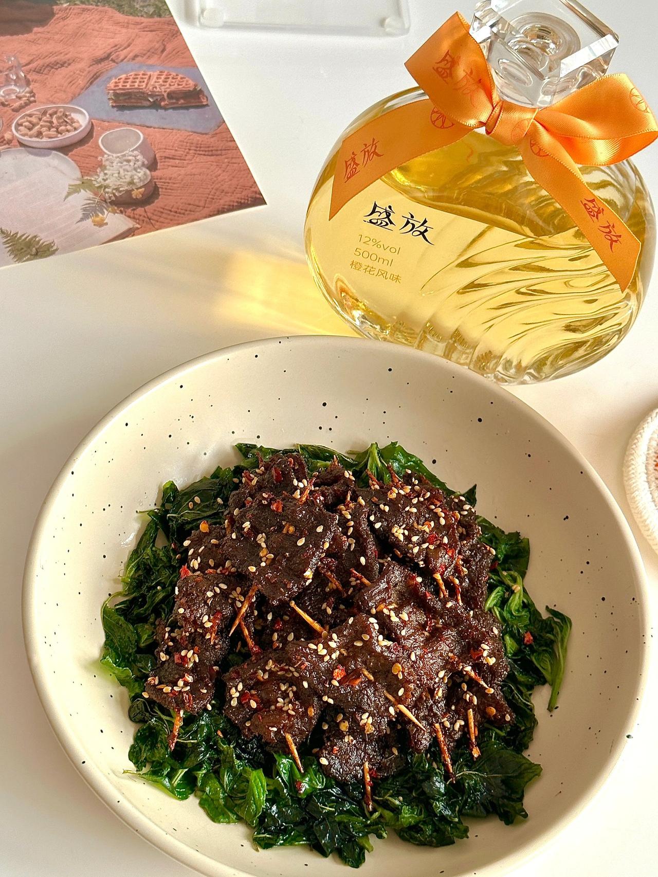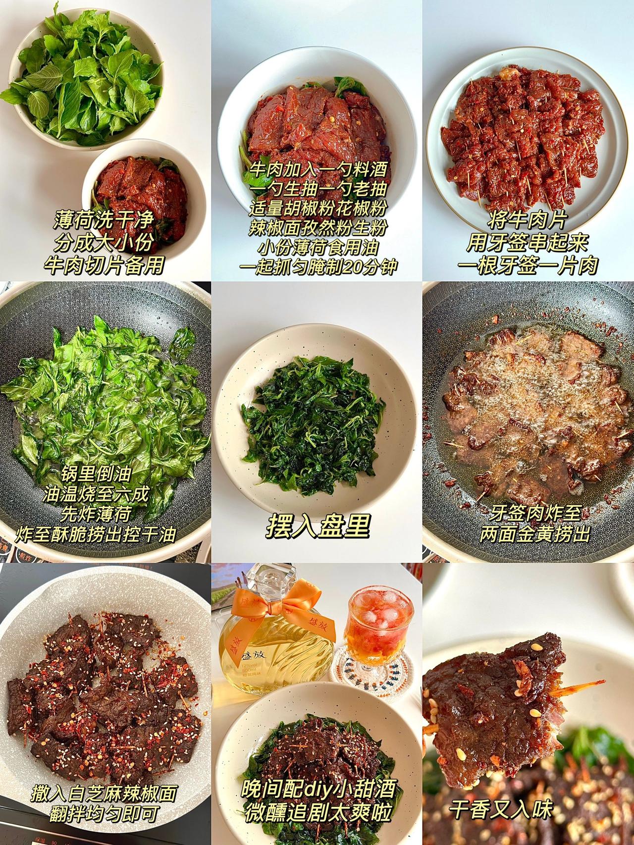 晚间微醺,云南薄荷牙签牛肉+橙花小甜酒 今天很想喝点小酒,一个人也要很有仪式感。一般就很喜欢夜晚自己在家一边追剧看电影一边安静地喝点小酒(明天还要上班就不喝白酒啦,喝点其他的),喜欢这种微醺的感觉。今天做了道云南菜“薄荷牙签牛肉”当下酒小零食 做法:薄荷分成大小份洗干净,牛肉切片,放入一勺料酒一勺生抽一勺老抽,适量胡椒粉、花椒粉、辣椒面、孜然粉、生粉加入小份薄荷食用油抓拌均匀腌制二十分钟备用。 将肉片用牙签串起来,一根牙签一片肉 锅里倒油烧至六成热,先炸薄荷,炸至酥脆捞出控干油,摆入盘里!牙签肉炸至两面焦黄捞出,撒入白芝麻,辣椒面,翻拌均匀即可