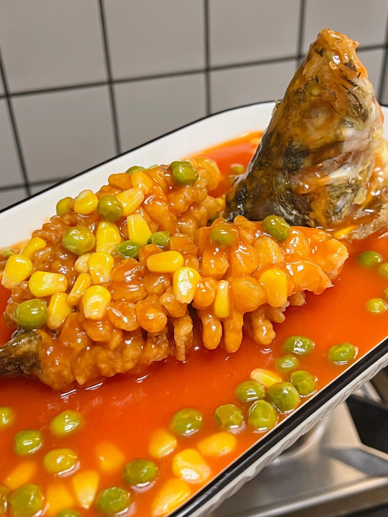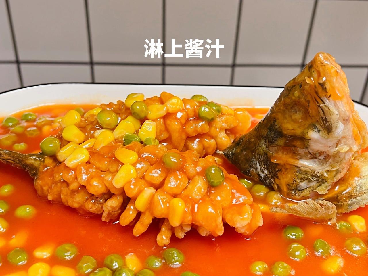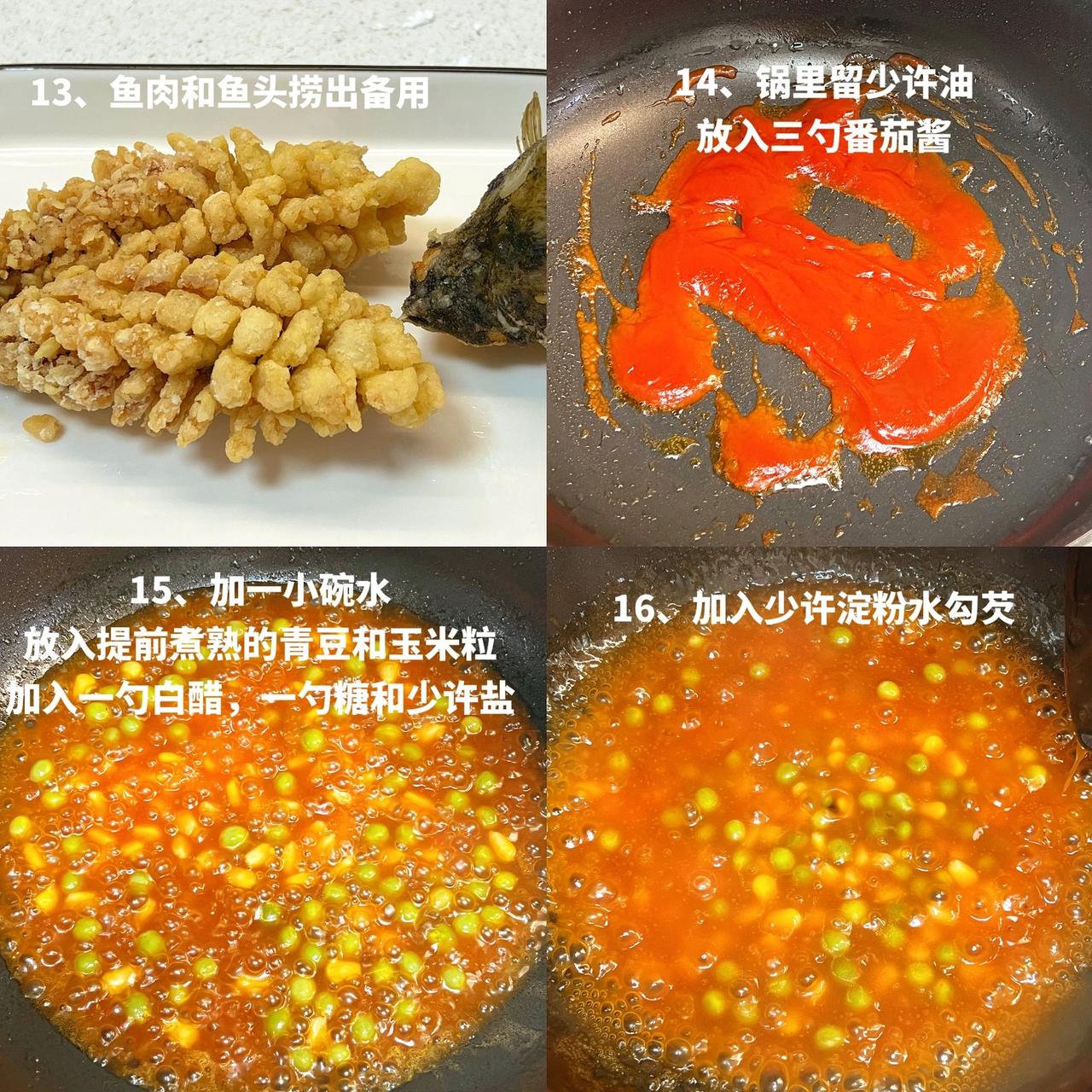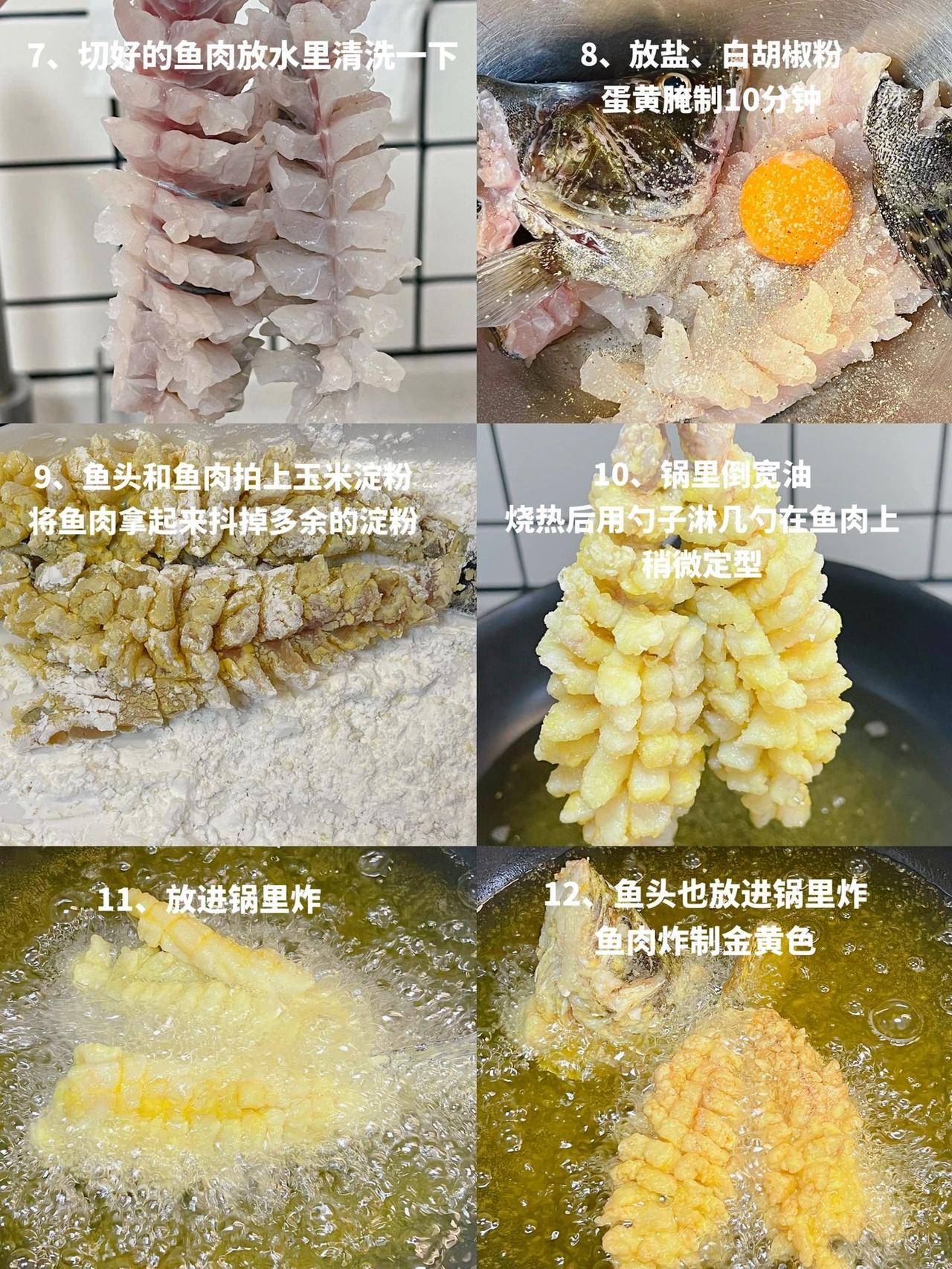 松鼠桂鱼,小学生的米饭杀手,好吃到舔盘子 随着暑假生活的正式开始,现在不仅仅要给小学生做早餐,还得一日三餐了 小家伙念叨这道菜很久了,今天终于给她做啦,好吃到舔盘子!我用的比较小的桂鱼,今天没有买到大一点的,这条只有300克左右,这道菜其实要1斤多点的做出来才好看,肉多炸出来才漂亮! 步骤:1、桂鱼去内脏清洗干净,头切下来。 2、沿着鱼骨将鱼肉片下来,连着尾巴的地方不要切断,鱼骨切下来不要。 3、将鱼肚上的大刺片下来不要。 4、再去如图所示将鱼肉切好,放入清水里清洗一下。 5、放盐、白胡椒粉和一个蛋黄将鱼肉和鱼头腌制10分钟。 6、鱼头和鱼肉拍上玉米淀粉,将多余的淀粉抖掉。 7、锅里倒宽油烧热,先用勺子淋几勺油在鱼肉上定型,再将鱼肉放进锅里炸制金黄,鱼头也放进去炸。 8、锅里留一点油,放入番茄酱,加一小碗水,放入提前煮好的青豆和玉米粒,加入白糖、白醋和盐煮几分钟。 9、再放入淀粉水勾芡。 10、最后淋在鱼肉上就好啦。 腌制鱼肉的时候加一个蛋黄,这样炸出来颜色很漂亮,切鱼肉的时候一定要注意别切断了,番茄酱、白醋和糖可以尝一下再来调整用量,毕竟每个人口味不同,根据自己喜欢的来。酸酸甜甜的小朋友超爱,鱼肉吃起来也没有刺,今天这条鱼小家伙一顿就吃完了,还吃了一大碗饭,养不起啊养不起