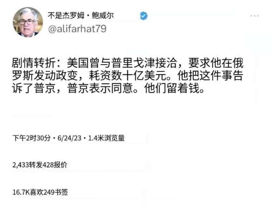 瓦格纳哗变最新剧情:美国中情局给了普里戈任数十亿美元让他叛变,兵变搞了普京。厨子毕竟多年亲自烧菜给普京吃,有感情基础,就把这事告诉了晋凉公。两人一合计,等钱到账,就把钱分了,再配合演出好戏。所以,美国说提前知道瓦格纳要行动是真的!当然,信不信由你……[二哈][二哈][二哈]