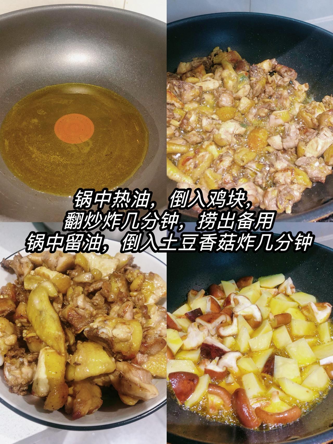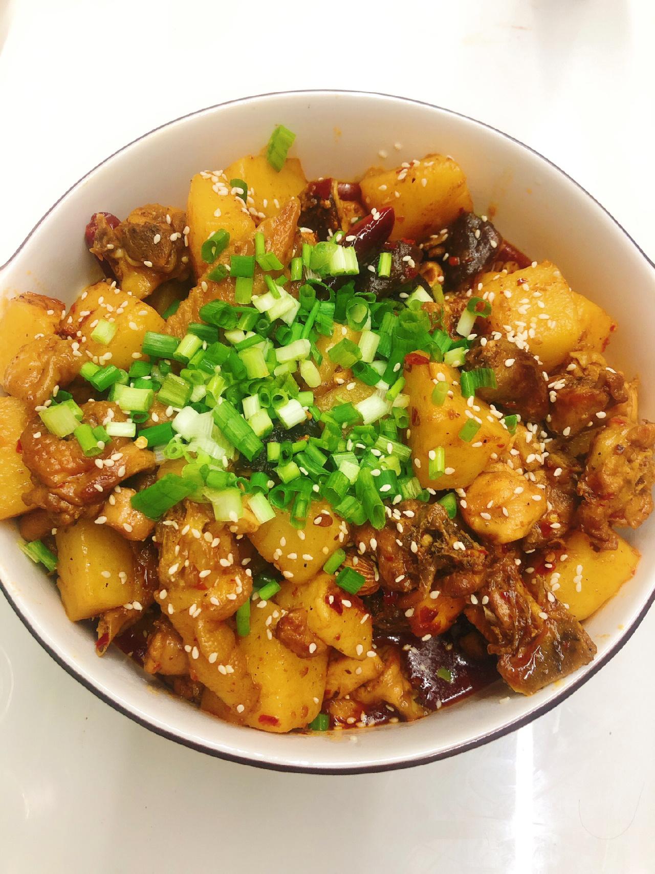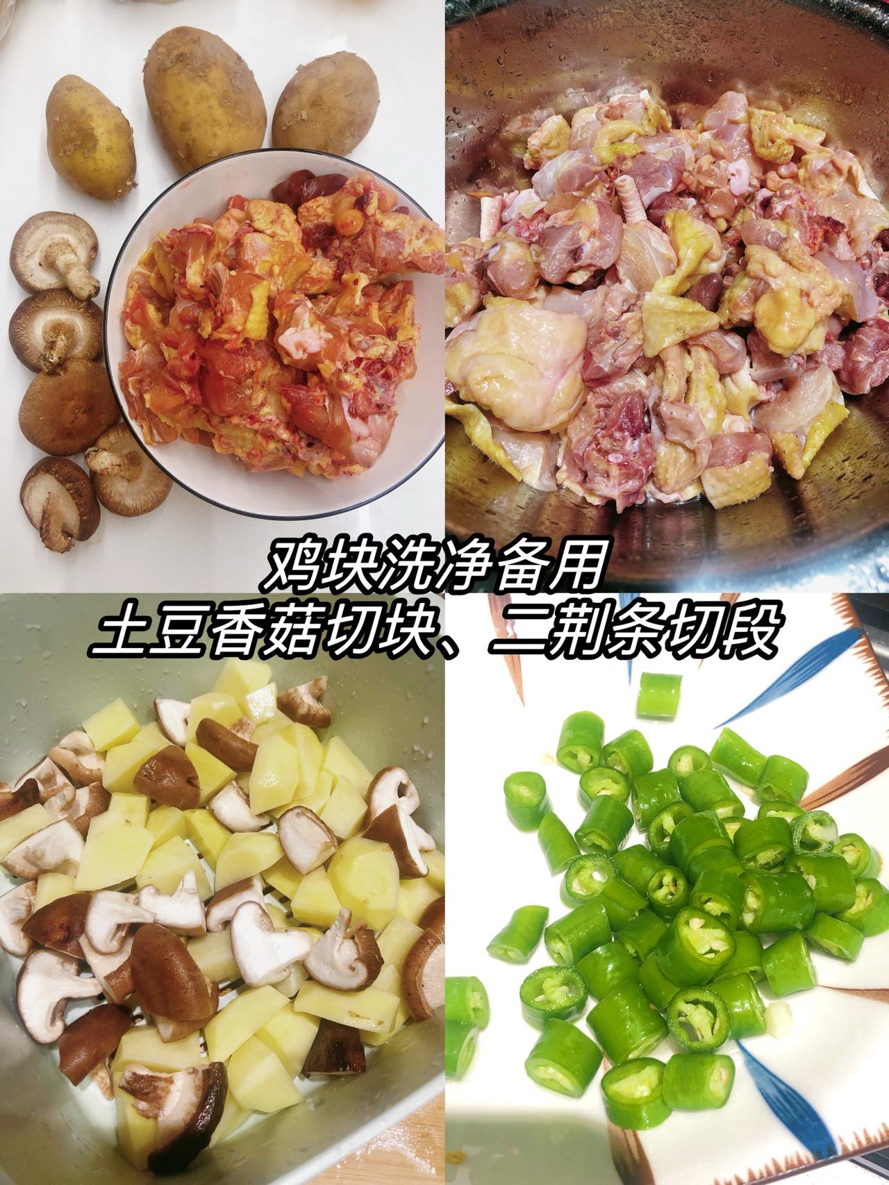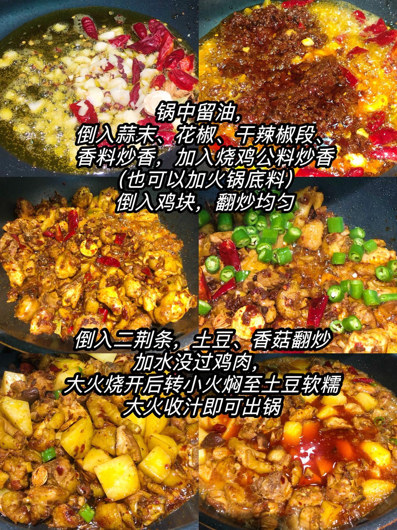 干饭人,家庭版巨巨巨好吃的烧鸡公 超级下饭的硬菜get,很开心 食材准备:鸡肉、土豆、香菇、二荆条(可以换成喜欢的配菜) 配料准备:蒜末、花椒、干辣椒段、香料、烧鸡公料(火锅料也可以) 1、鸡块洗净,土豆香菇切块,二荆条切段备用 2、锅中热油,倒入鸡块翻炒,几分钟后捞出备用,倒入土豆香菇(其他喜欢吃的配菜)翻炒炸几分钟捞出。 3、锅底留油,倒入花椒、蒜末、干辣椒段、香料,再倒入烧鸡公料(火锅料也可)炒香,倒入鸡块翻炒均匀 4、倒入二荆条翻炒,后倒入土豆香菇翻炒几下,加入清水没过鸡肉,水烧沸后转小火继续烧至土豆熟后,大火收汁出锅,撒上葱花芝麻即可!