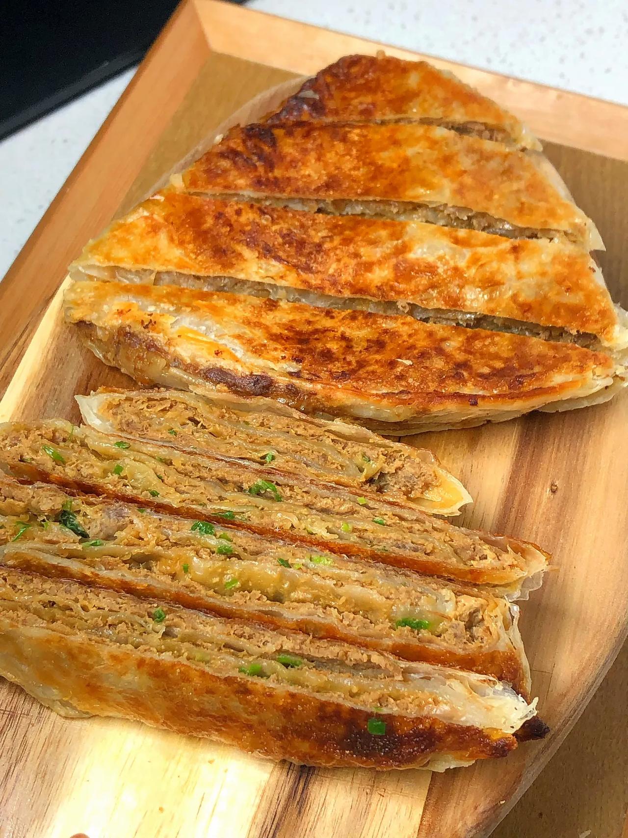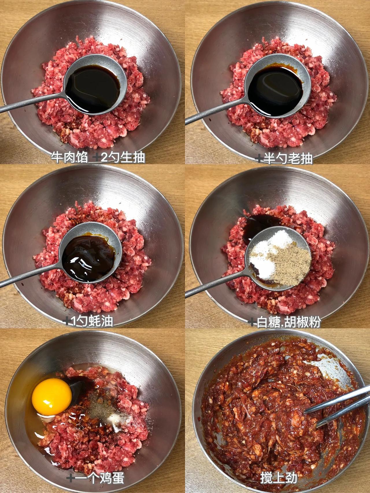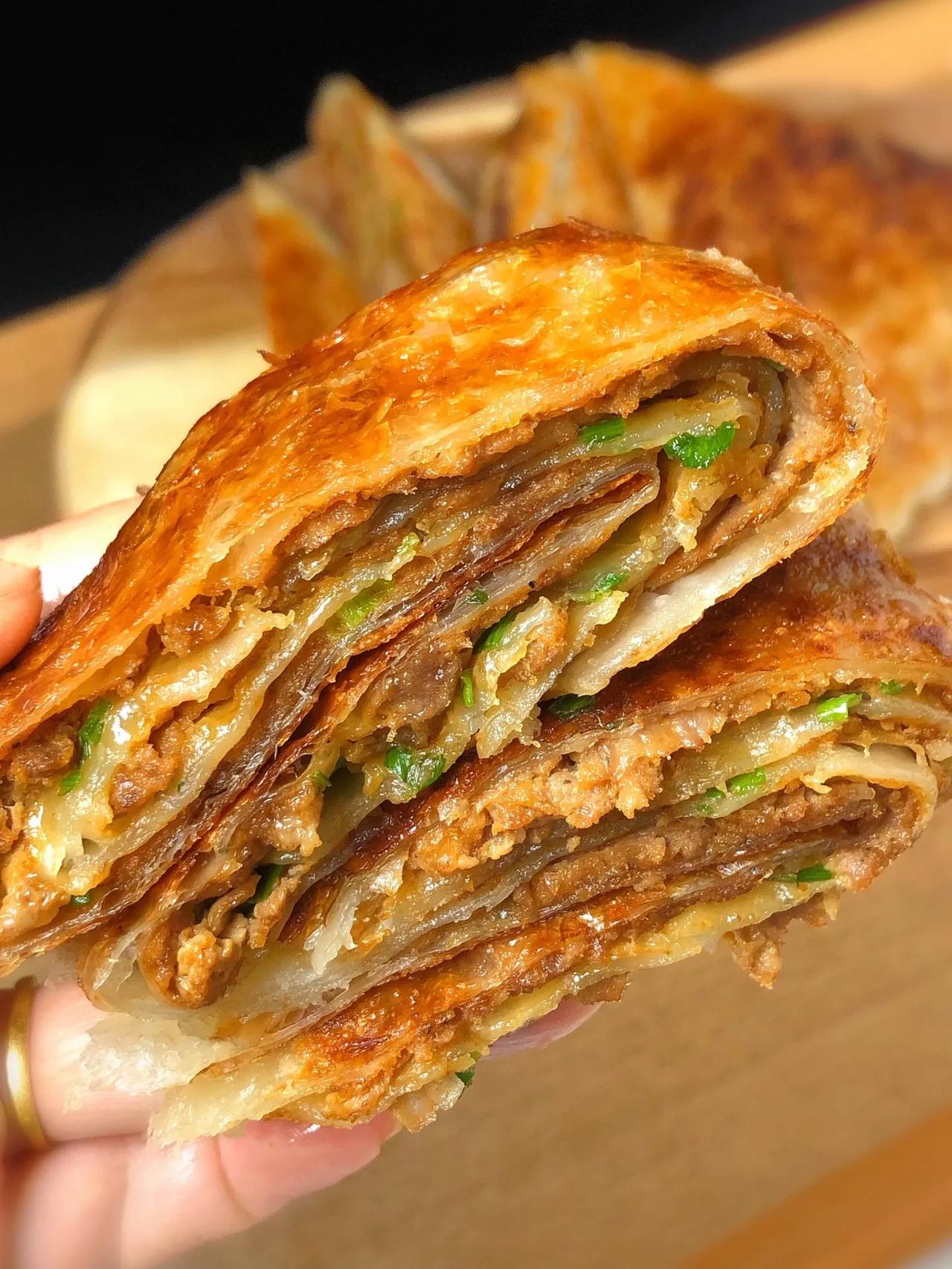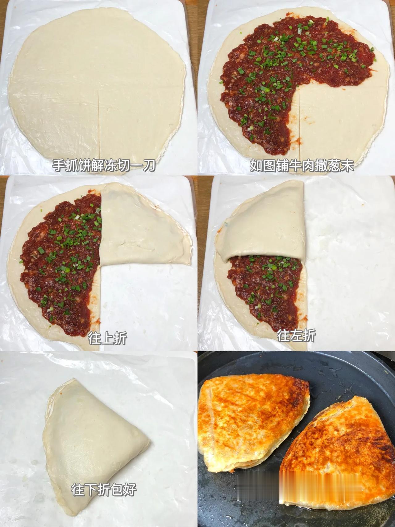 早餐分分钟就能搞定的牛肉馅饼,咬一口还能爆汁~ 做法: 1、牛肉馅加2勺生抽、半勺老抽、1勺蚝油、白糖、胡椒粉,1个鸡蛋 搅上劲; 2、手抓饼解冻切一刀,如图5铺牛肉撒葱末,往上折,往左折,往下折包好,按扁在锅里煎熟即可。
