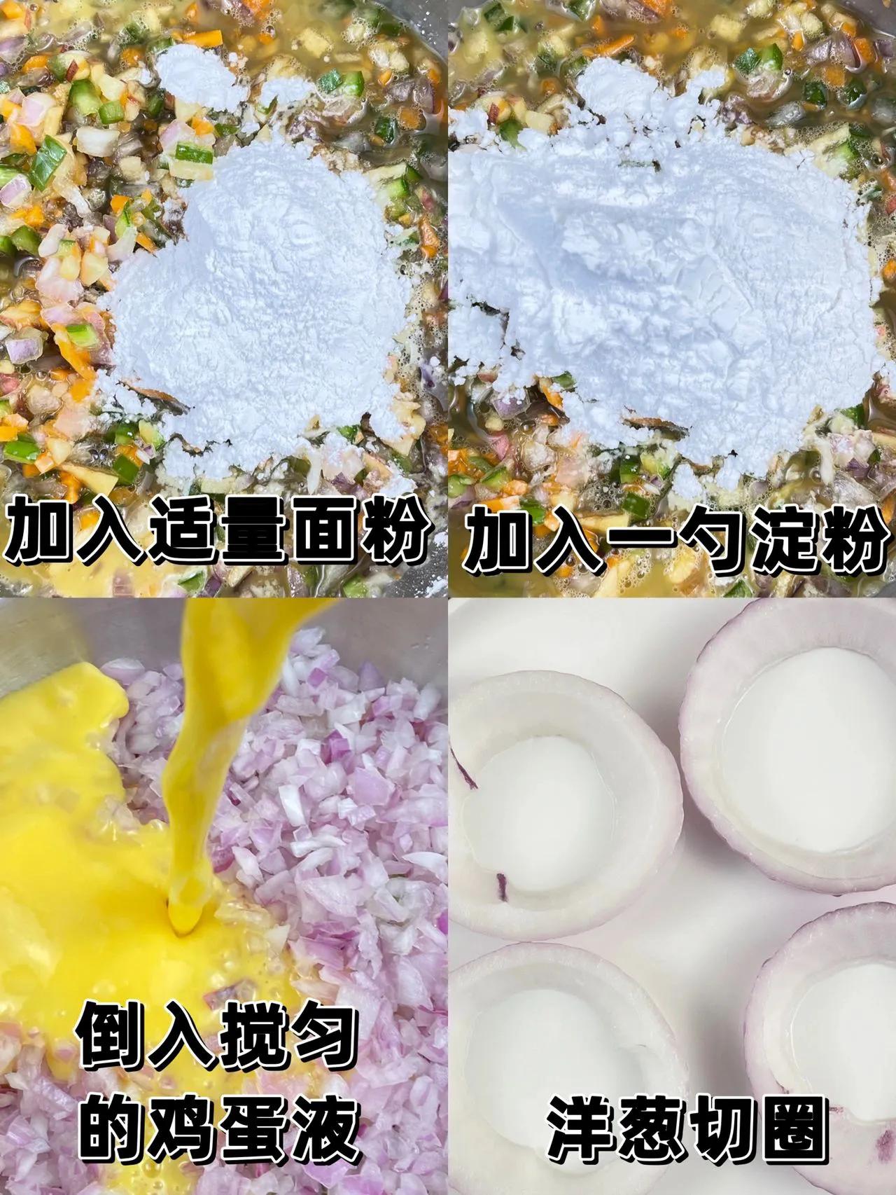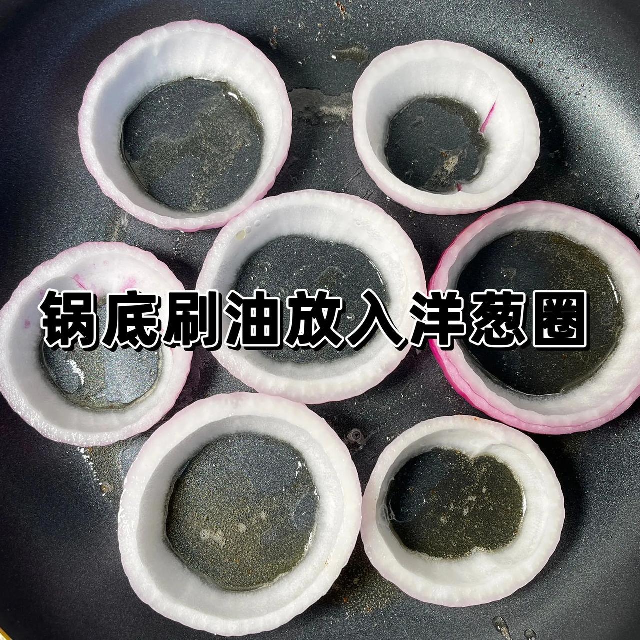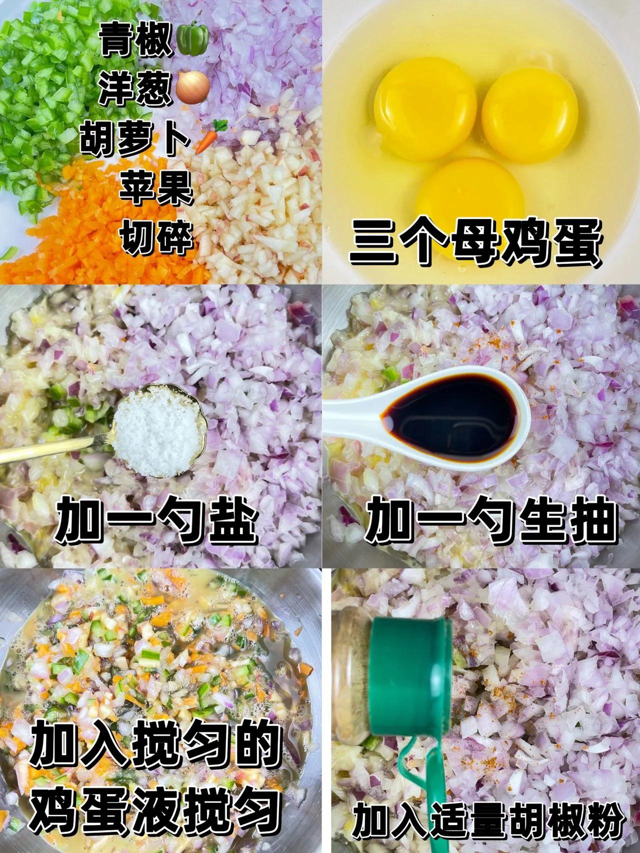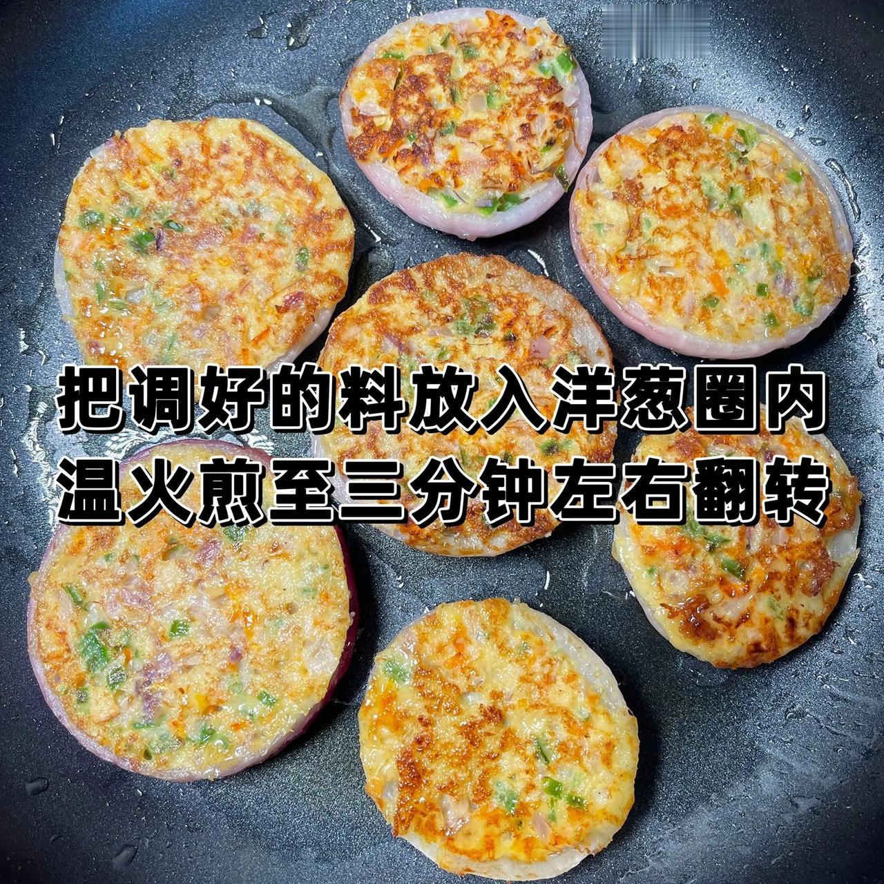 孩子早餐不知道吃什么就做这个洋葱鸡蛋饼,好吃又简单。 做法: 1、三个鸡蛋搅匀备用; 2、青椒、洋葱、胡萝卜、苹果切碎,加一勺盐、一勺生抽,加入搅匀的鸡蛋液搅匀,再加入适量胡椒粉、适量面粉、一勺淀粉搅匀; 2、洋葱切圈,锅底刷油放入洋葱圈,把调好的料放入洋葱圈内,温火煎至三分钟左右翻转即可。