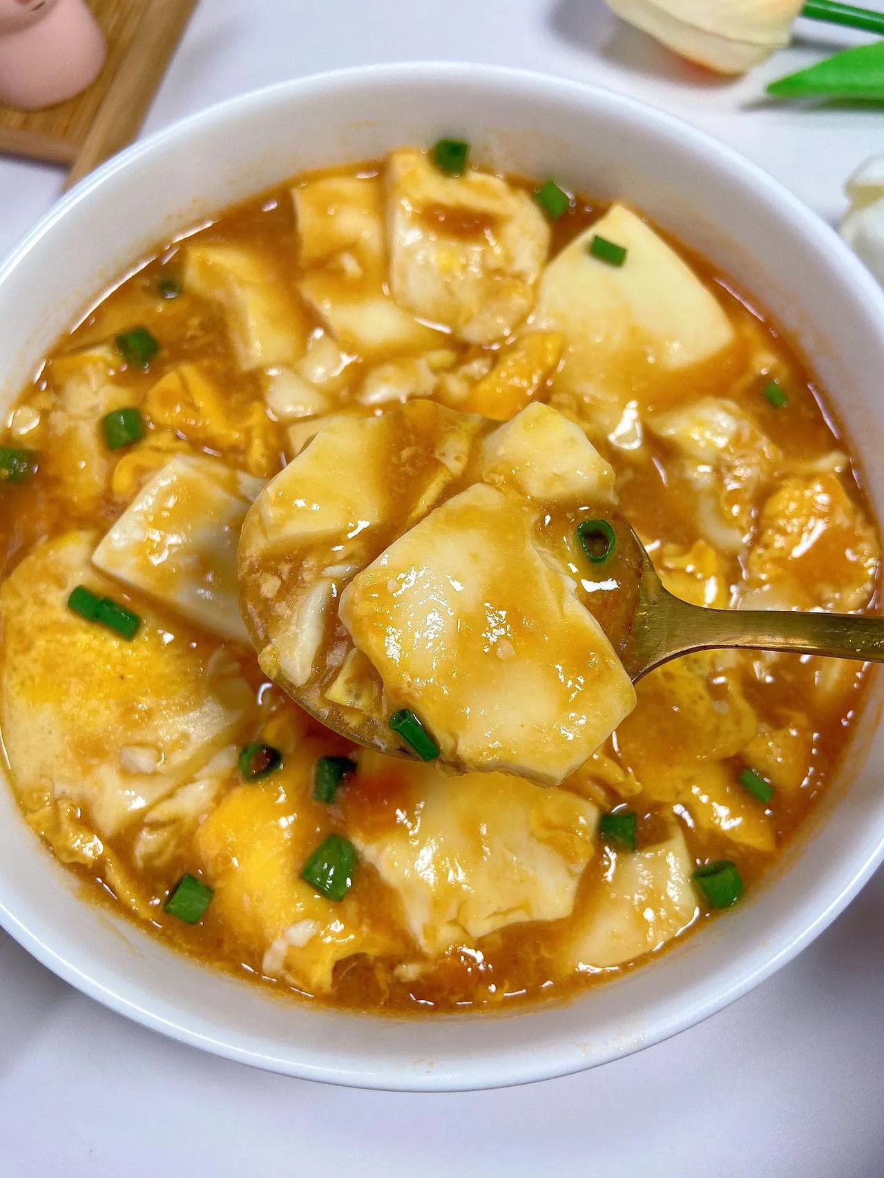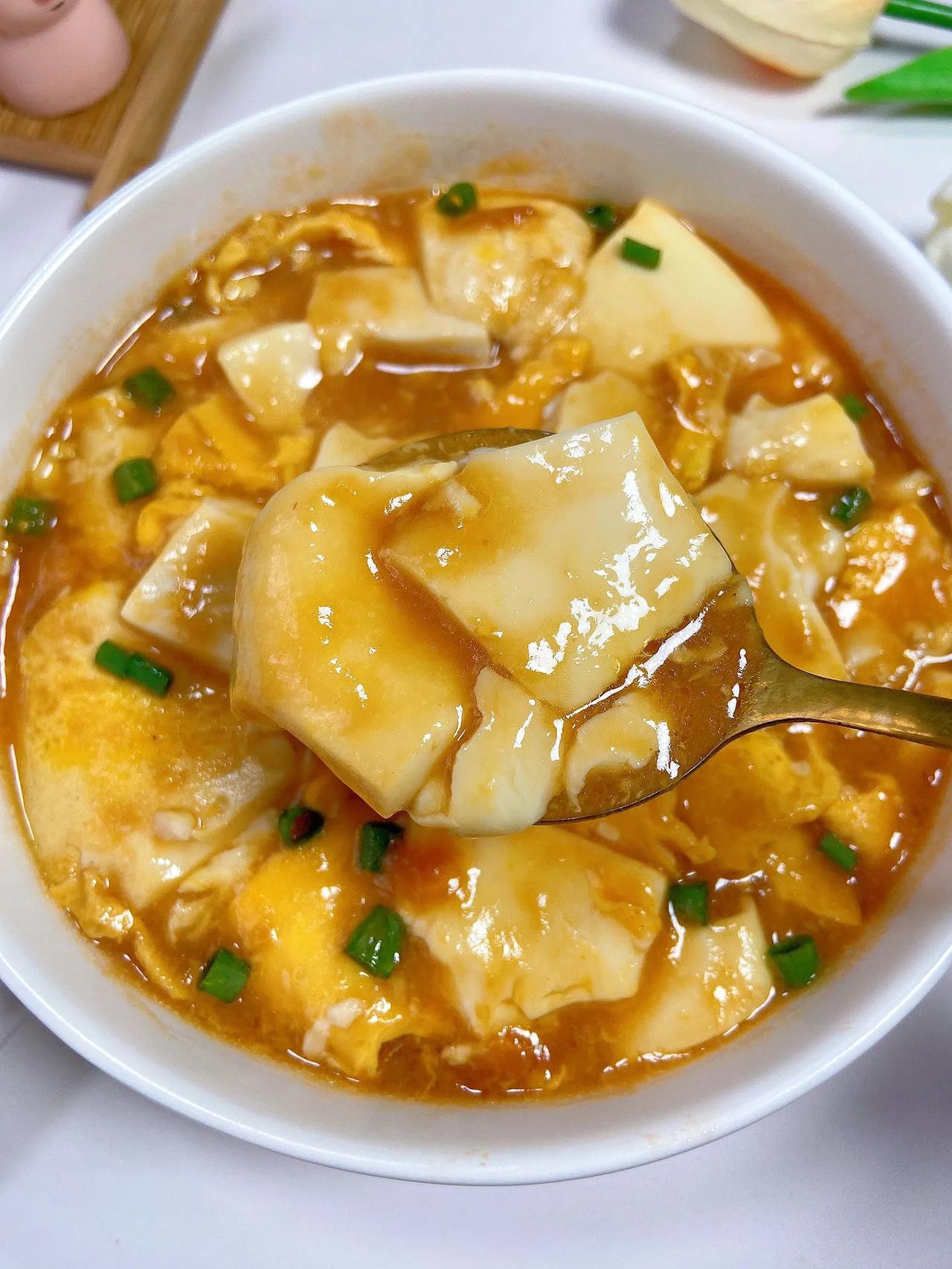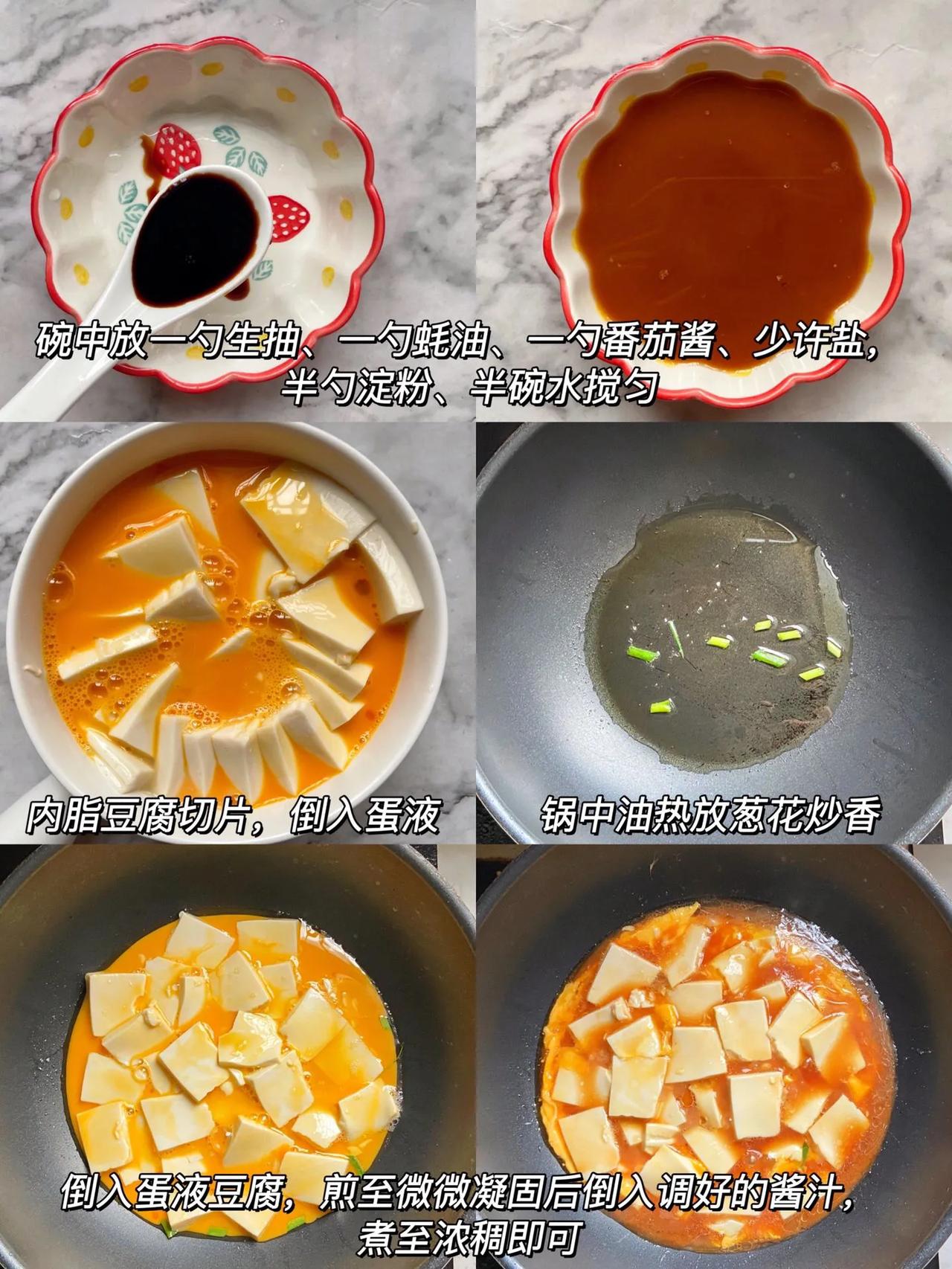建议所有的女孩子把晚餐换成它! 相信我!这个真的巨掉秤!!这个豆腐鸡蛋巨好吃!鲜香嫩滑,高蛋白低卡饱腹感又强!做法简单,一次就成功~减脂的姐妹快来试试吧! 做法: 1、调酱汁:碗中放一勺生抽、一勺蚝油、一勺番茄酱、少许盐、半勺淀粉、半碗水搅匀; 2、内脂豆腐切片,倒入蛋液; 3、锅中油热放葱花炒香,倒入蛋液豆腐,煎至微微凝固后倒入调好的酱汁,煮至浓稠即可。