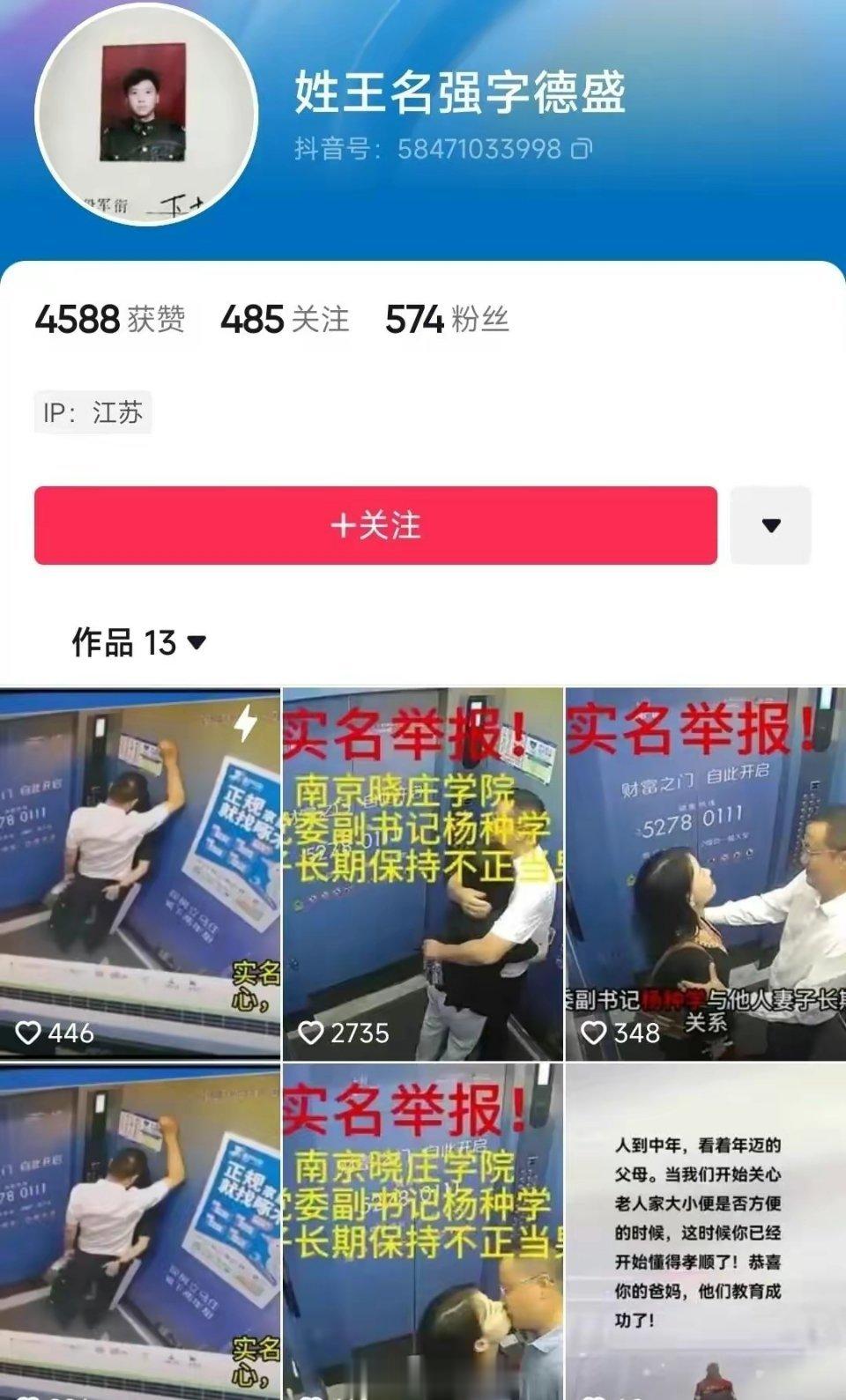 #男子举报妻子出轨南京一高校领导#一男子实名举报南京晓庄学院副书记杨种学与自己妻子长期保持不正当男女关系,并晒出多个监控视频。对此,校方回应表示,已成立调查组。其实,对于晓庄学院,这已经不是第一起类似事件了。