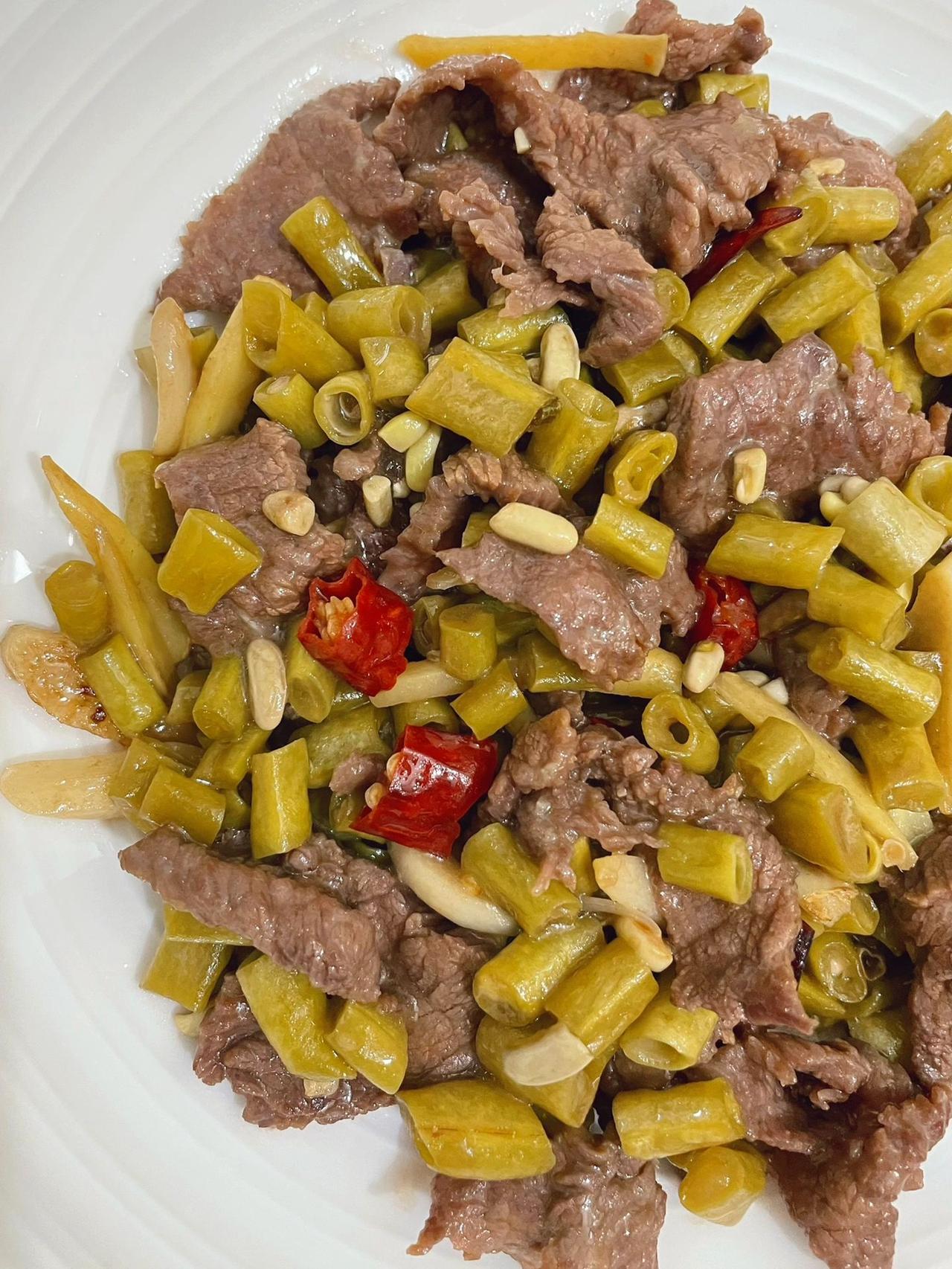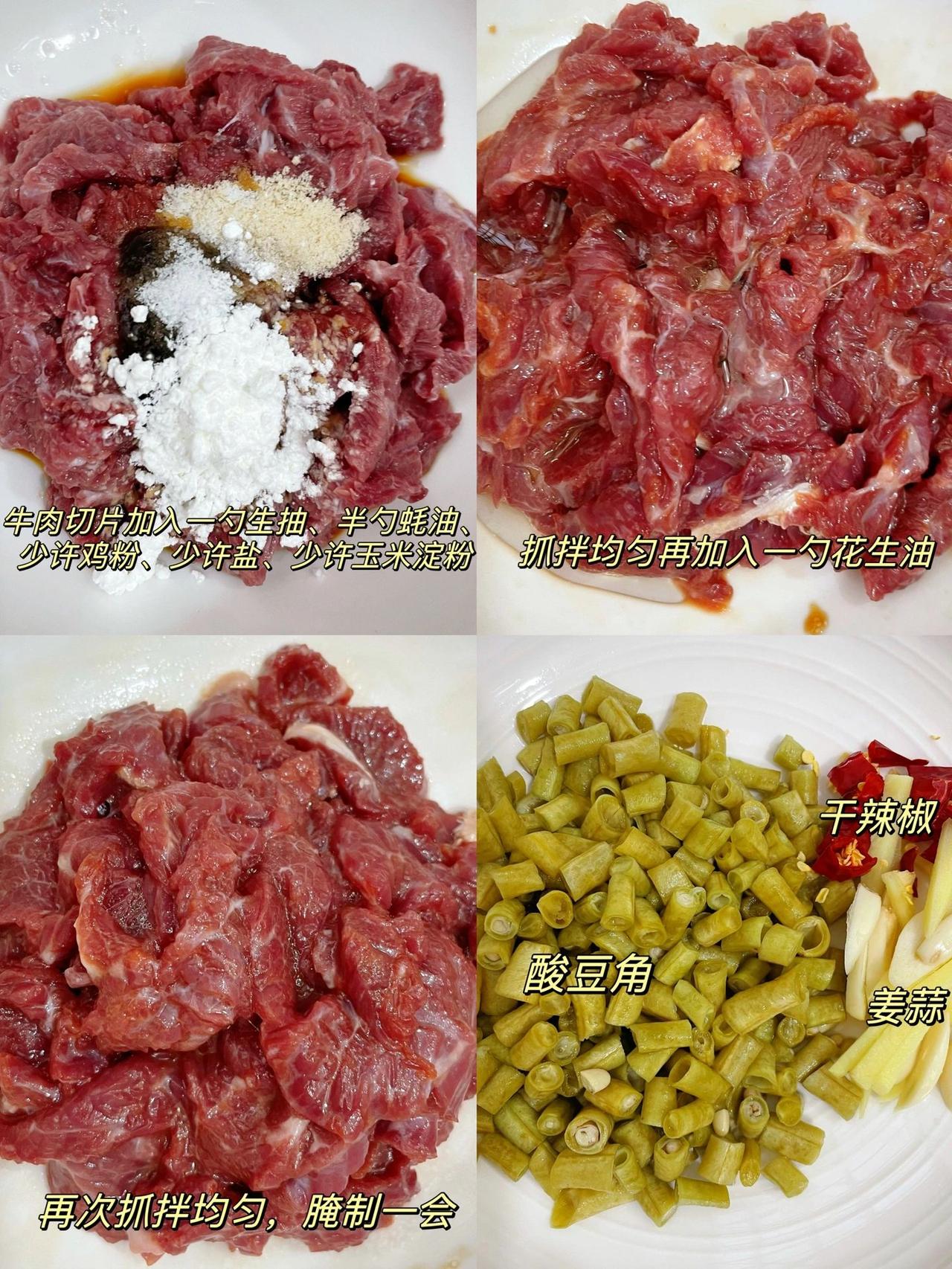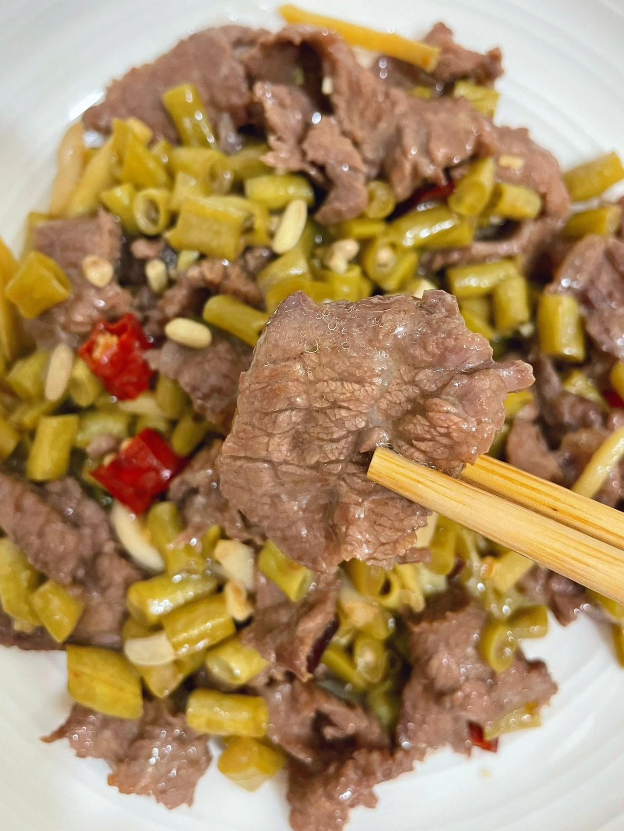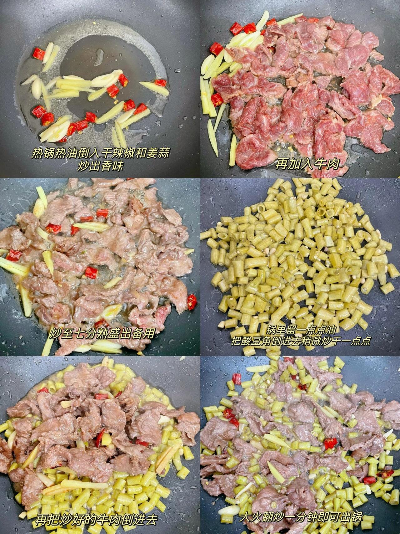 一次能干两碗饭的酸豆角炒牛肉!! 端午假期腌制了一点酸豆角,今天可以吃啦,酸豆角炒牛肉真的超级超级下饭呀!! 食材:牛肉、酸豆角、蒜、姜、干辣椒。 做法:1、牛肉洗干净切片,加入一勺生抽、半勺蚝油、少许鸡粉、少许盐、少许鸡粉,抓拌均匀。 2、再加入一勺花生油,抓拌均匀腌制一会。 3、酸豆角用清水冲洗干净,姜蒜辣椒切好。 4、热锅热油倒入干辣椒和姜蒜,炒出香味后倒入牛肉炒至七成熟,盛出备用。 5、锅里留一点点油,把酸豆角放进去炒干水分,再把牛肉倒进去一起翻炒,大火翻一分钟左右即可出锅。