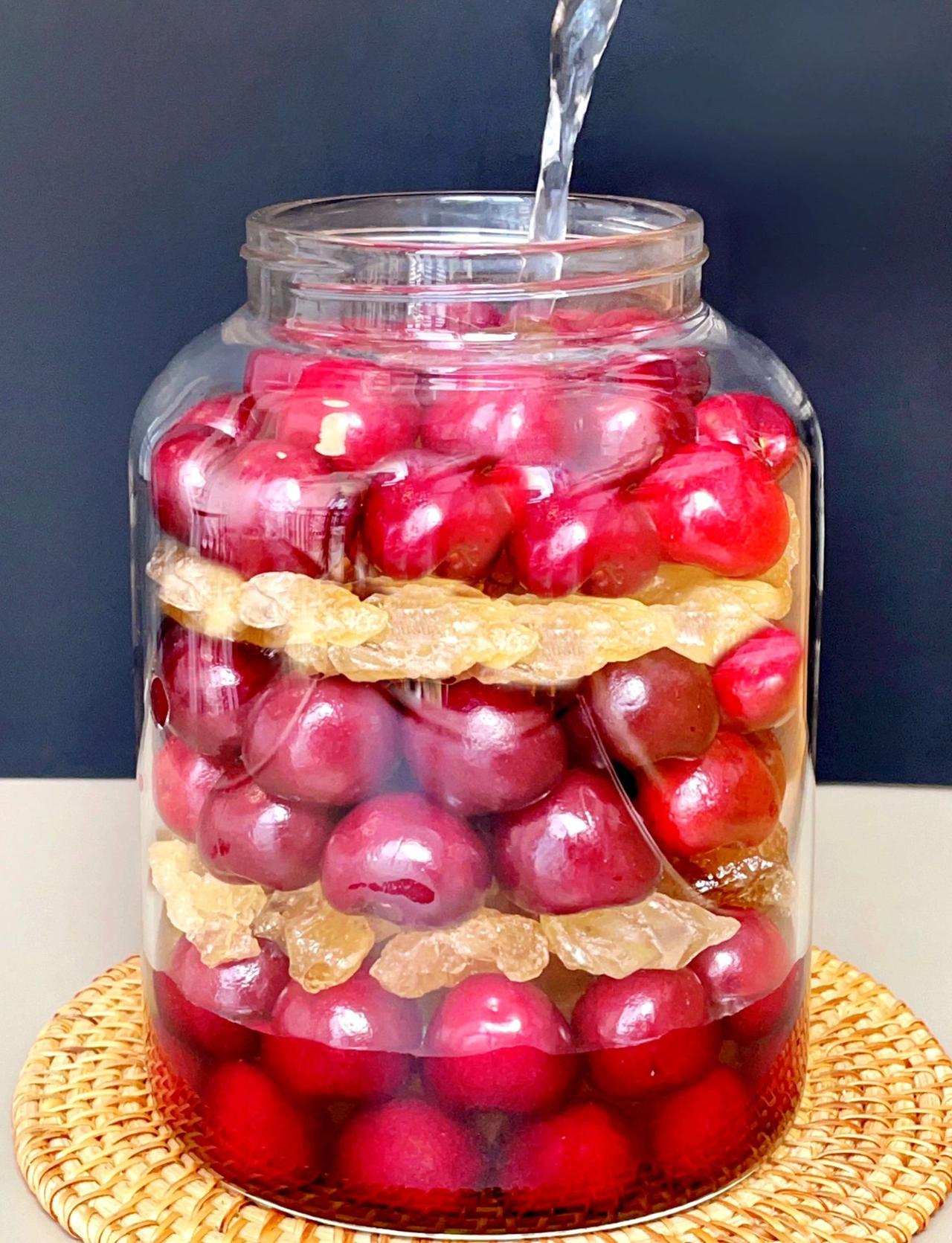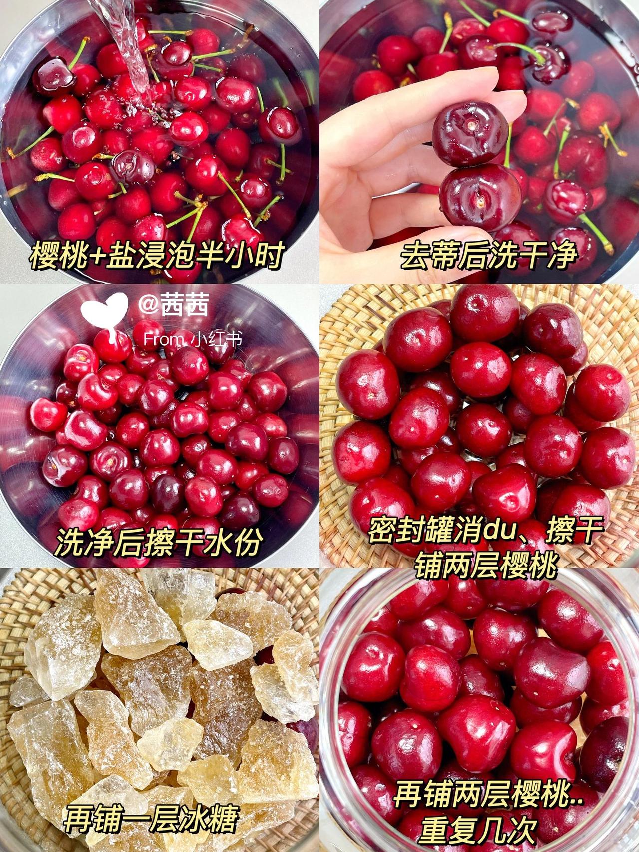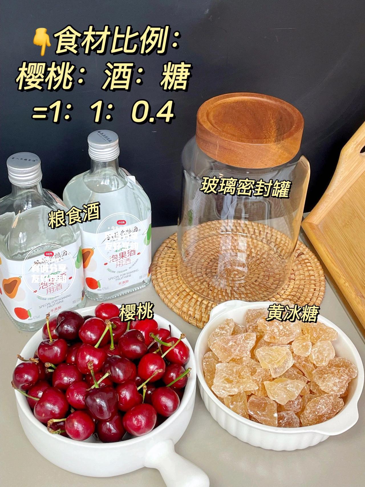 因为这个!!我被亲戚朋友被狠狠夸了… 泡了一个多月的樱桃酒… 今天家里请客开封了,没想到这么好喝!! 酒香中带着樱桃的酸甜和独特香味,清新自然!亲戚朋友们喝完都一顿夸!! 这么热的天气,微醺一杯真滴太舒服了! 准备:500g樱桃、500ml粮食酒、200g黄冰糖(比例就是1:1:0.4) 做法:樱桃+盐浸泡半小时,捞出去蒂洗干净,擦干水份 密封罐消du、擦干,铺两层樱桃、一层糖..重复几次 食材铺到九分满,倒入粮食酒密封,放在阴凉处保存 正常等1个月就可以喝了,有耐心的话也可以等到3个月,味道会更好,度数也会更低~ 酒可以选泡水果专用的粮食酒,泡出来的酒口感会更好,也不容易失败!