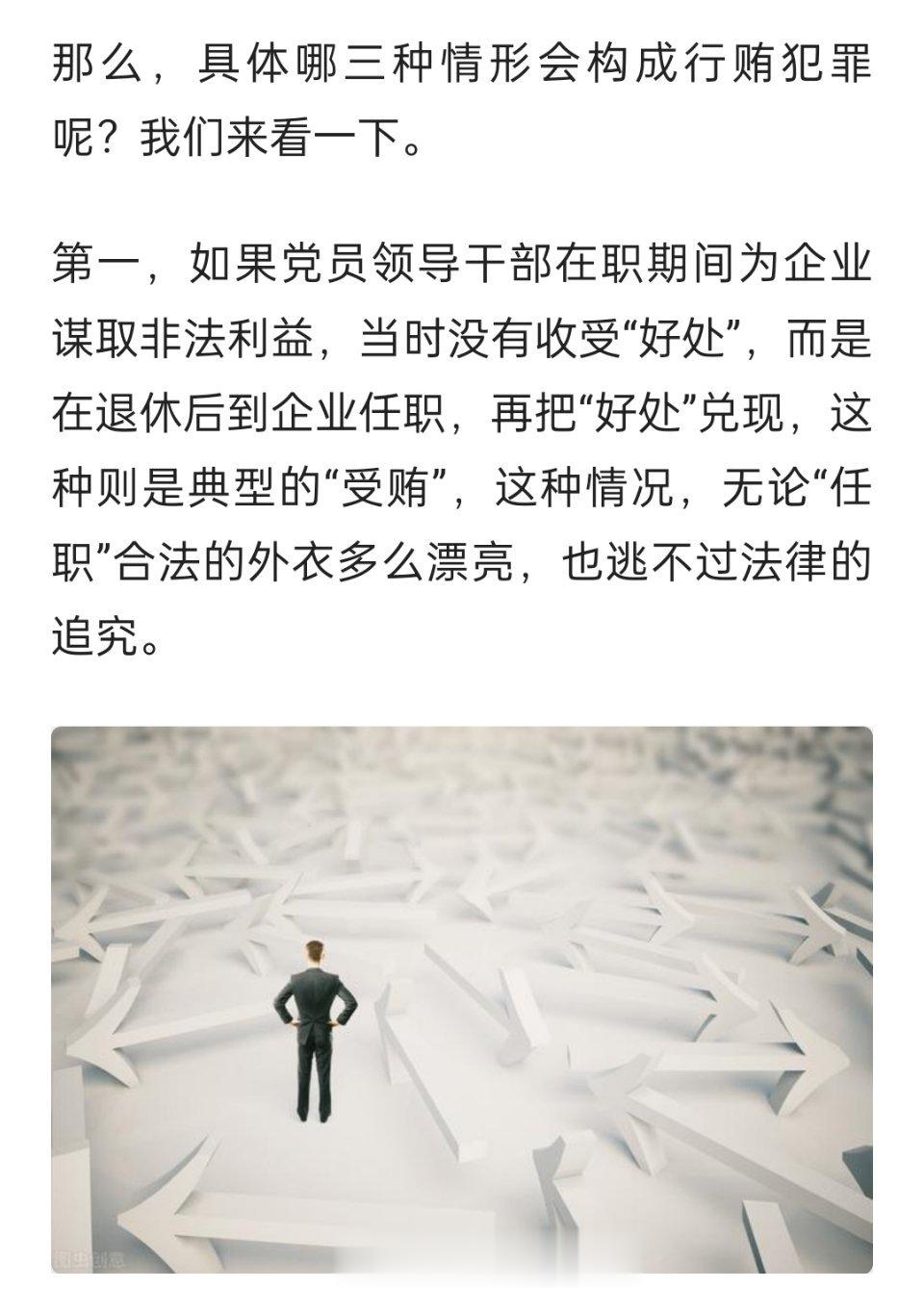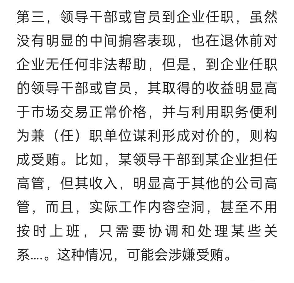 #胡锡进在多家公司任职高管#第一,领导干部退休后可以到企业任职吗?县处级退休要三年以内不得从事与原业务相关的活动,老胡有很大的违规嫌疑;第二,退休后到企业任职,怎样才构成受贿犯罪、应被追究情形?有三种,胡锡进可能涉嫌第三种。