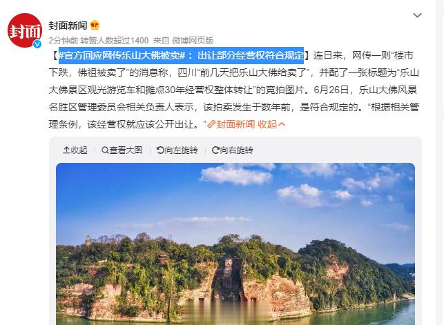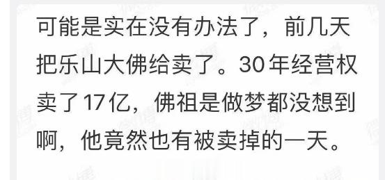 #官方回应网传乐山大佛被卖# :出让部分经营权,符合规定。居然是真的……不过想想也正常,很多景点在官方手上经营不好,换一手反而能风生水起。比如乌镇当年也是整体打包给他人经营才名声鹊起。只要不是搬走大佛让网友坐上去,我想乐山大佛也没啥意见…[二哈]