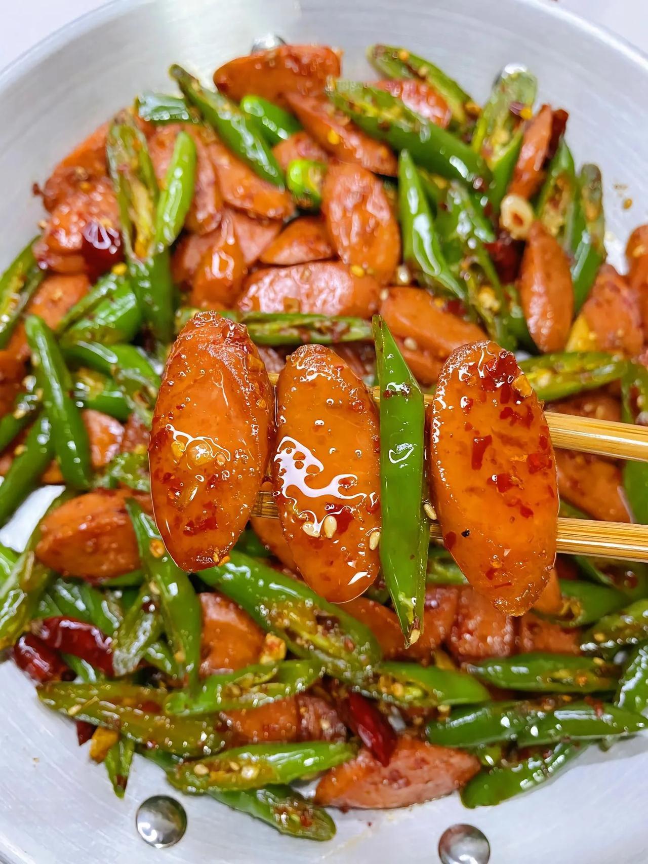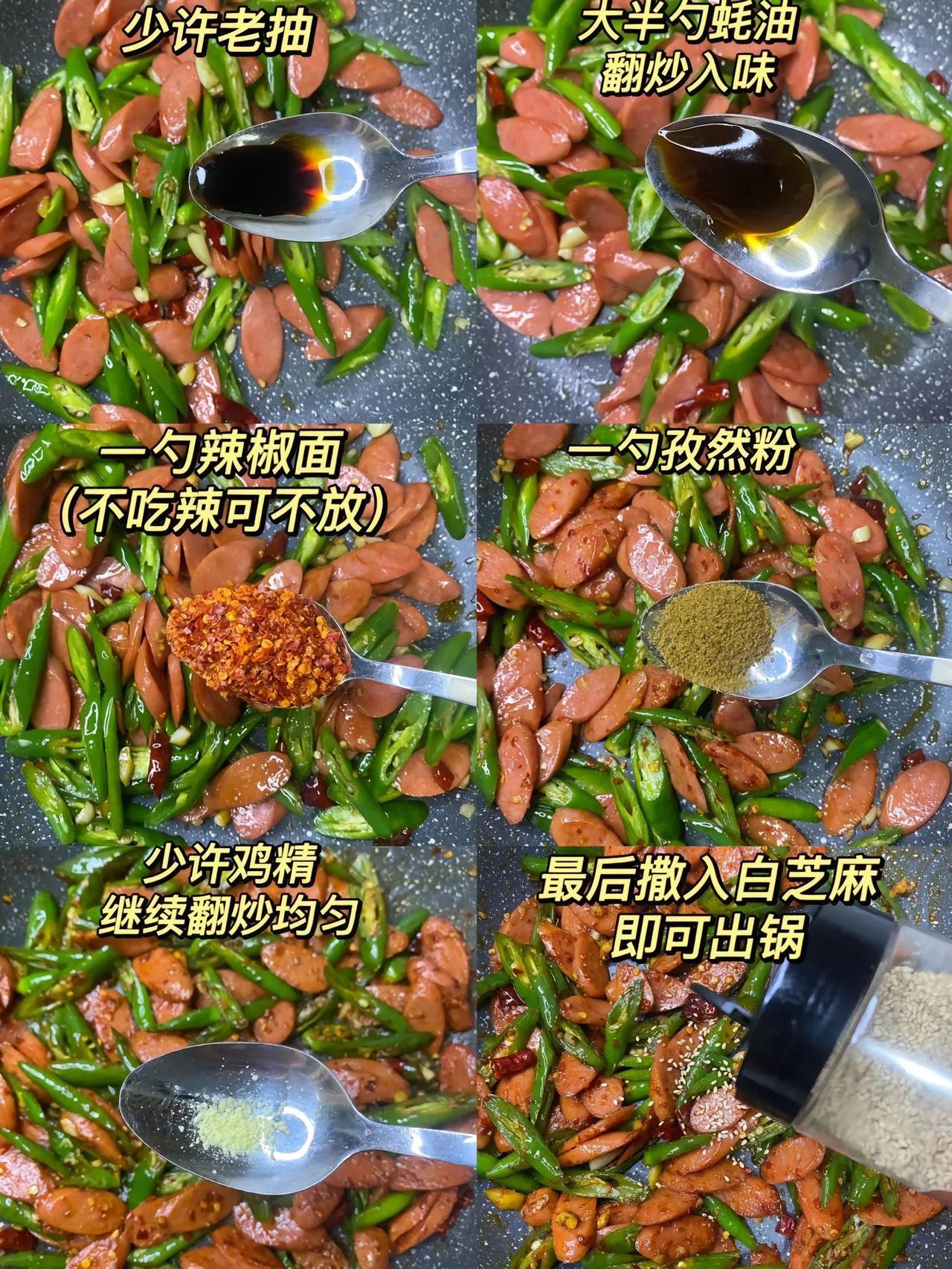 拒绝外卖…自己做的辣椒炒火腿肠! 辣椒炒火腿又快又简单还很好吃 食做法: 1、锅中适量油,油热下入火腿肠煎至微焦盛出备用; 2、锅中少许油, 油热下入蒜末和干红辣椒炒香; 3、下入青辣椒炒至断生,倒入煎好的火腿肠,放一勺生抽、少许老抽、大半勺蚝油翻炒入味; 4、放一勺辣椒面、一勺孜然粉、少许鸡精继续翻炒均匀,最后撒入白芝麻即可。