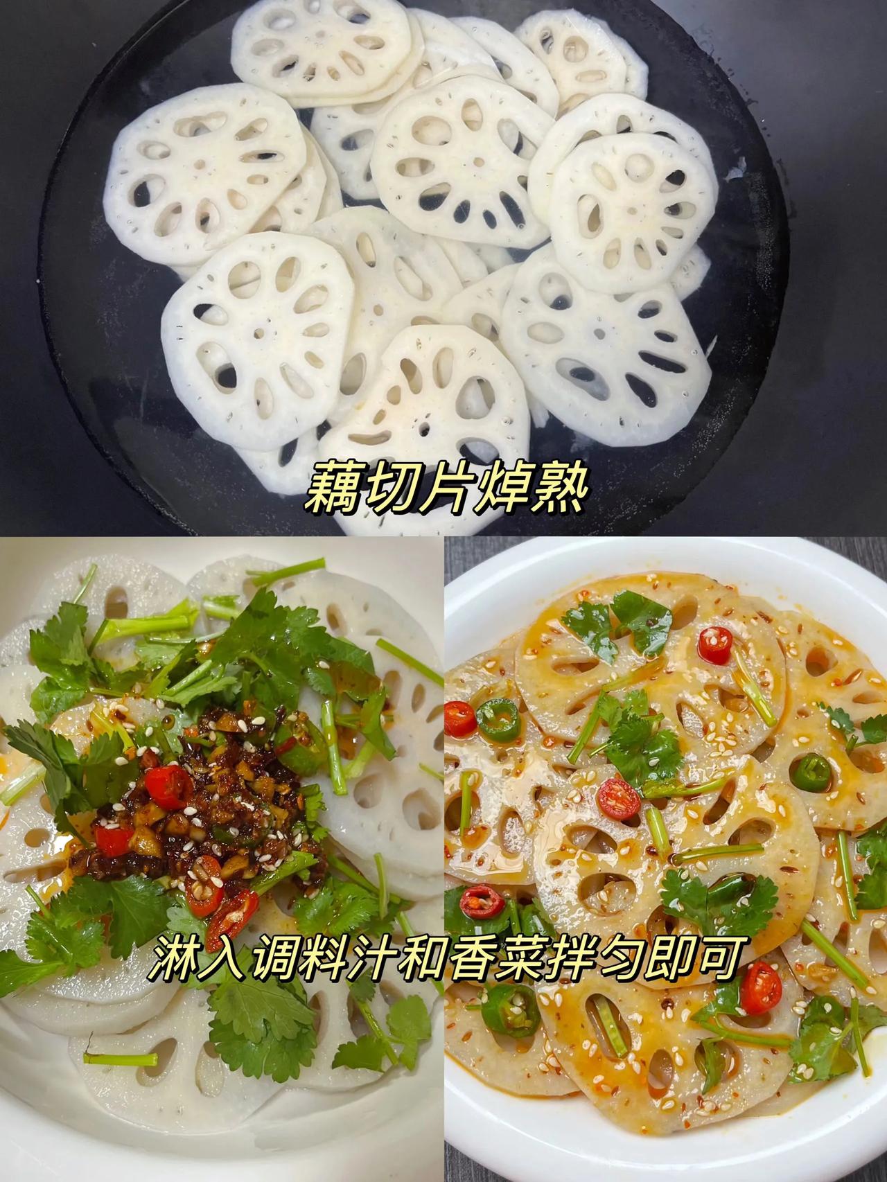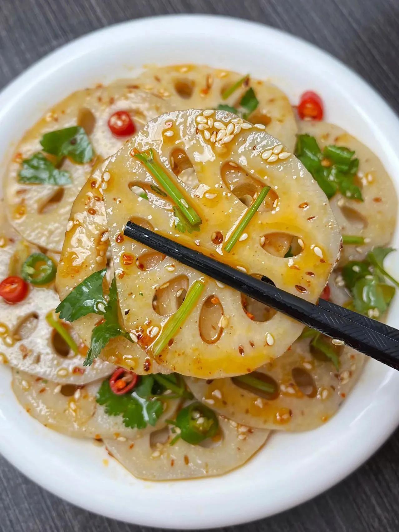 建议女孩子把晚餐换成这个! 今天分享一道凉拌酸甜藕片~藕片薄薄的又脆脆的,香香辣辣、酸酸甜甜~ 做法: 1、调料汁:碗中放芝麻、辣椒粉、蒜末、小米辣、葱花,淋1勺热油激发出香味后,再加1勺生抽、1勺香醋、1勺蚝油、少许盐和白糖拌匀; 2、藕切片焯熟,淋入调料汁和香菜拌匀即可。
