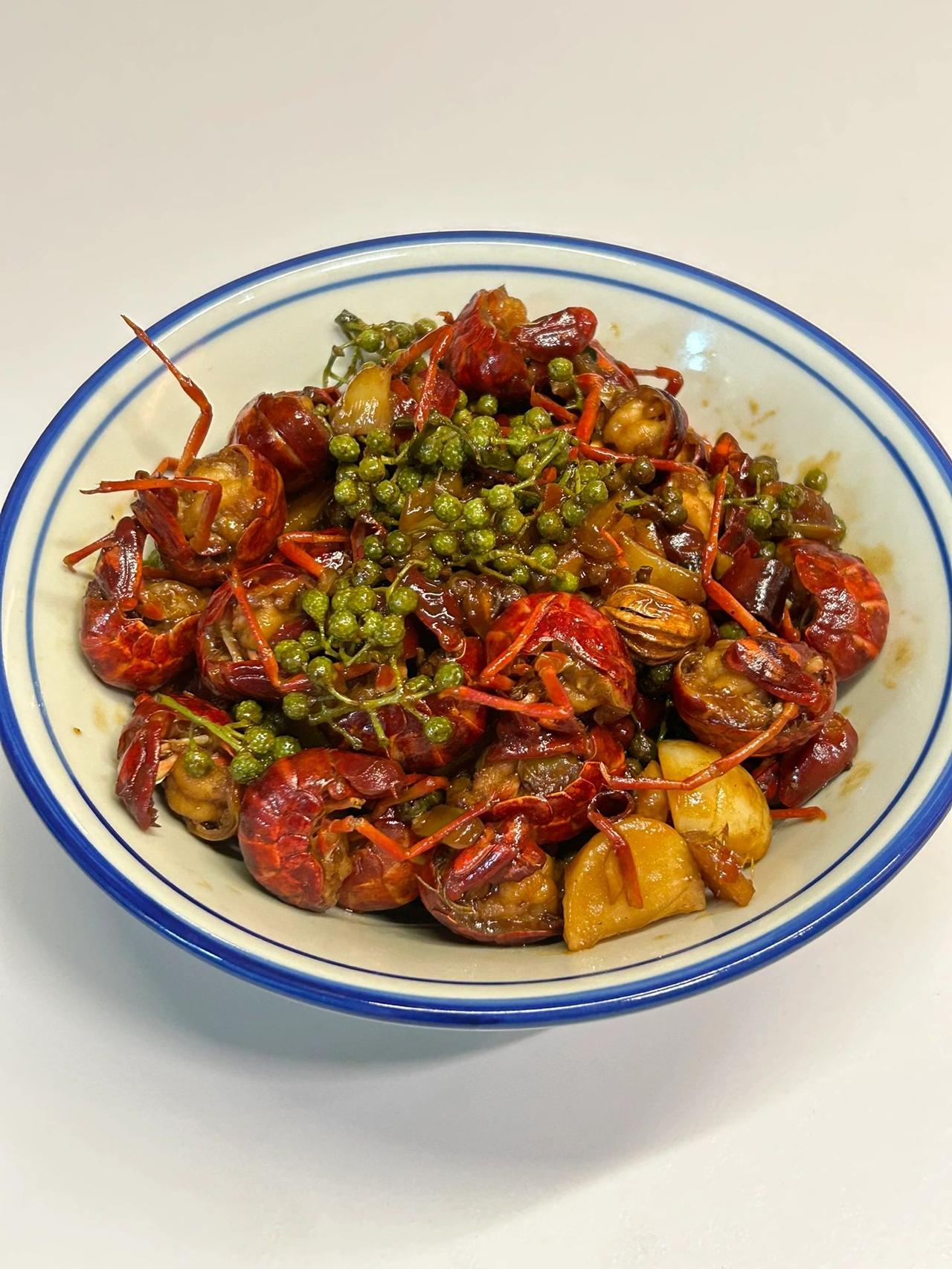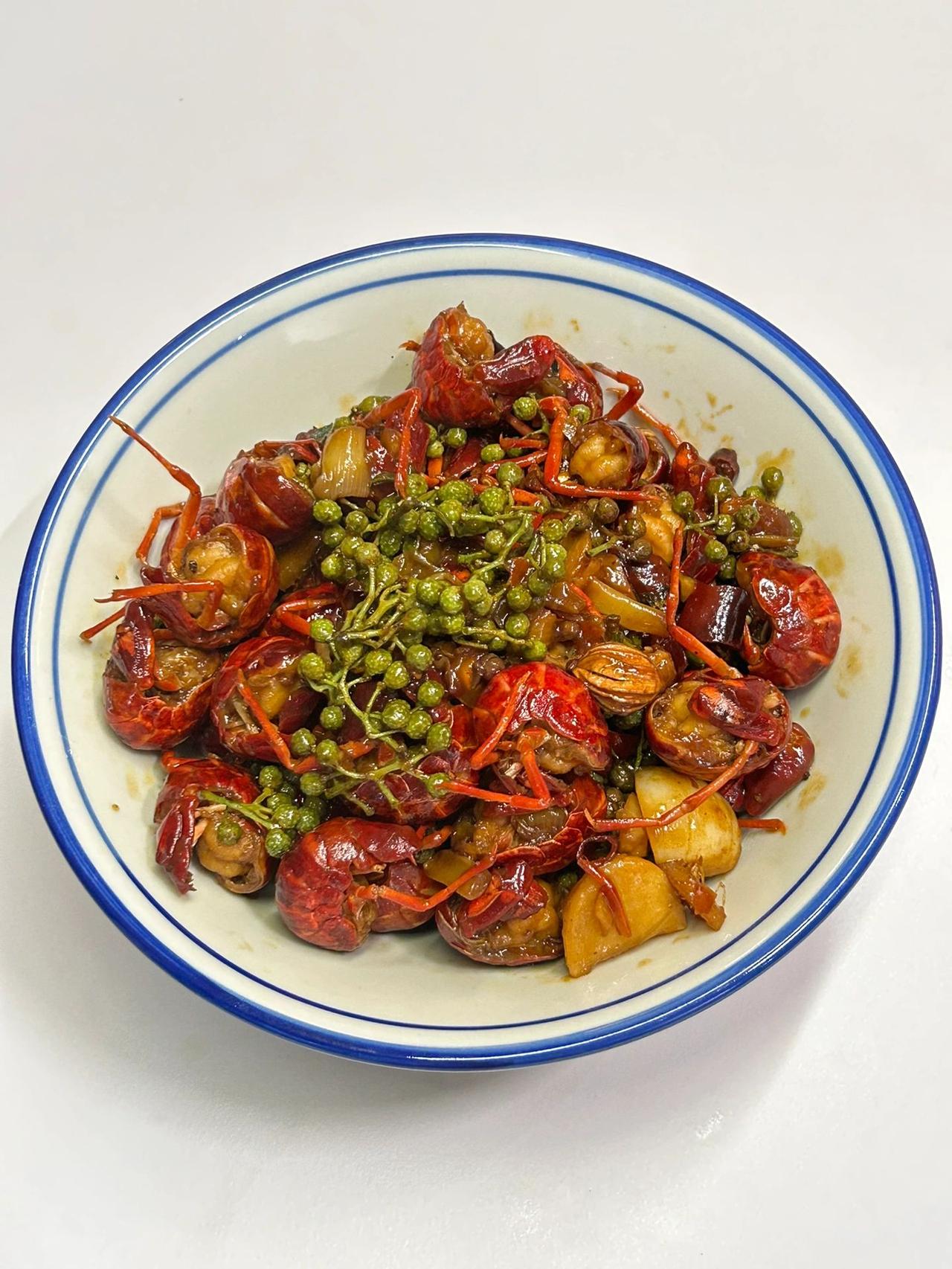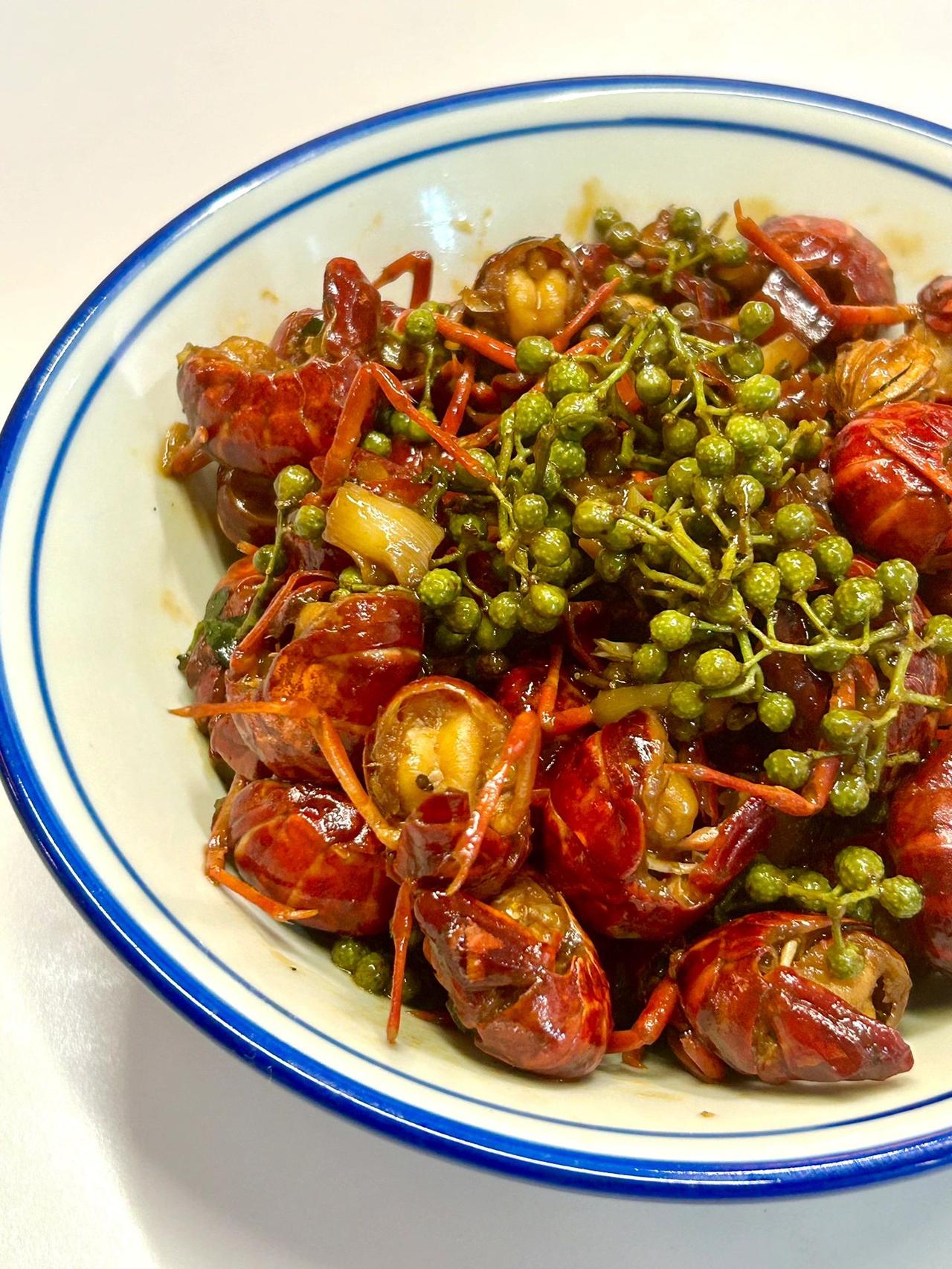 这太绝了!在餐馆绝对吃不到的油焖虾球 你吃过刚从树上摘下来的青花椒没?那种带点清香的麻,用来炒菜简直一绝! 新采摘的花椒不易保存,一般到第二天就发黑变味儿了,所以超级市场里几乎买不到,餐馆也不会用它来做菜。 只有在老家路边的小商贩那,赶早才能买到这样的美味。 今天用它做了油焖虾球,好吃到舔手指。 食材:小龙虾、新鲜的青花椒、大葱、姜、蒜、豆瓣酱、啤酒 步骤:1、小龙虾去头留尾,抽虾线洗干净,青花椒用水冲洗干净,姜蒜切片,大葱横着切成一厘米圆丁。 2、锅中多放油,依次加入葱姜蒜和豆瓣酱,炒出香味后加入小龙虾尾。 3、龙虾尾变色后把青花椒倒入锅中翻炒,再加入两勺生抽,一点糖和盐调味。 4、倒入啤酒,漫过小龙虾即可,小火焖15分钟左右。 5、汤汁快干时,加入少量水淀粉,大概两勺的量。大火翻炒,使汤汁浓稠即可出锅。