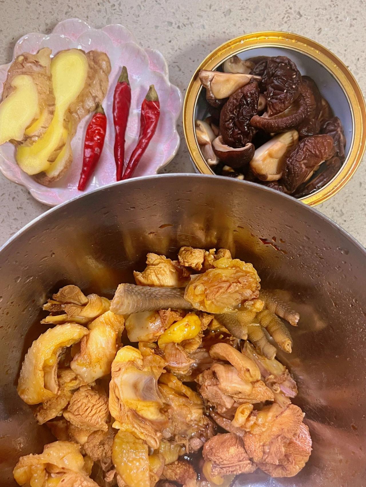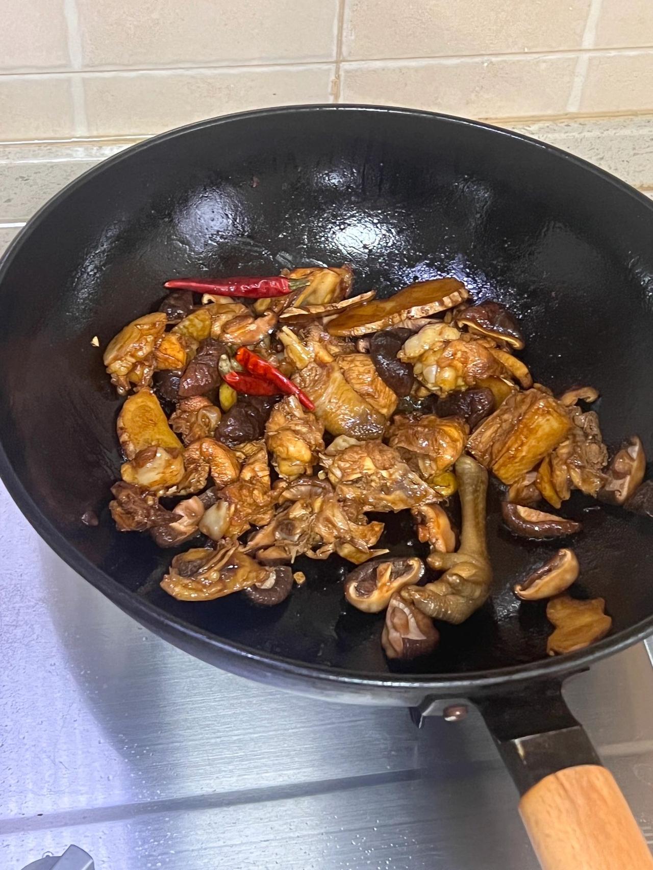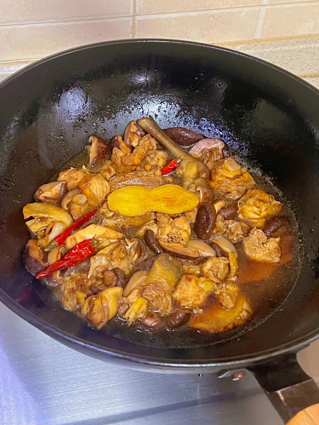 家常黄焖鸡的做法,学会了再也不用点外卖 以前在学校的时候最喜欢吃食堂的黄焖鸡米饭,鸡肉入味,剩下的汤汁拌着米饭简直妙呀,按照我的比例来做这道黄焖鸡米饭一定能满足爱吃黄焖鸡米饭的你,不会翻车,绝对好吃 所需材料:鸡肉、干香菇、生姜、干辣椒 做法如下:1、生姜切片,干香菇泡发后切成片状(泡干香菇的水过滤后保留),鸡肉切块焯水后用料酒、生抽、老抽腌制半小时以上,比例为3:2:1。 2、起锅烧油,把生姜片和腌制好的鸡肉用中火充分炒香、炒出油脂,然后从锅边淋入一瓶盖白酒增香再次翻炒两分钟左右。 3、加入切好的香菇片,炒到香菇微微出汁儿后加入3个干辣椒继续煸炒,炒出辣椒的香味后再将过滤好的香菇水倒入锅中,大火煮开后转入砂锅,用中小火焖煮25分钟,最后开大火收收汁儿,摆盘即可出锅 是不是超级简单,不需要什么花里胡哨的调料,按我这样的比例原汁原味不腥不柴,鲜嫩入味。 这里划重点:“香菇水是精髓千万不要倒了” 怕盐味不够的可以在最后一步适量添一点儿盐,但是切记不要多了,因为香菇特别吸味,总之根据自己的食材来调整用量即可。家里有青椒的也可以在最后收汁的时候时候放一点儿进去煮煮,风味更佳。 个人觉得这方子做出来跟外卖馆子的黄焖鸡米饭没啥区别了,反正好吃两字我是说腻了,只有你们自己试试才知道