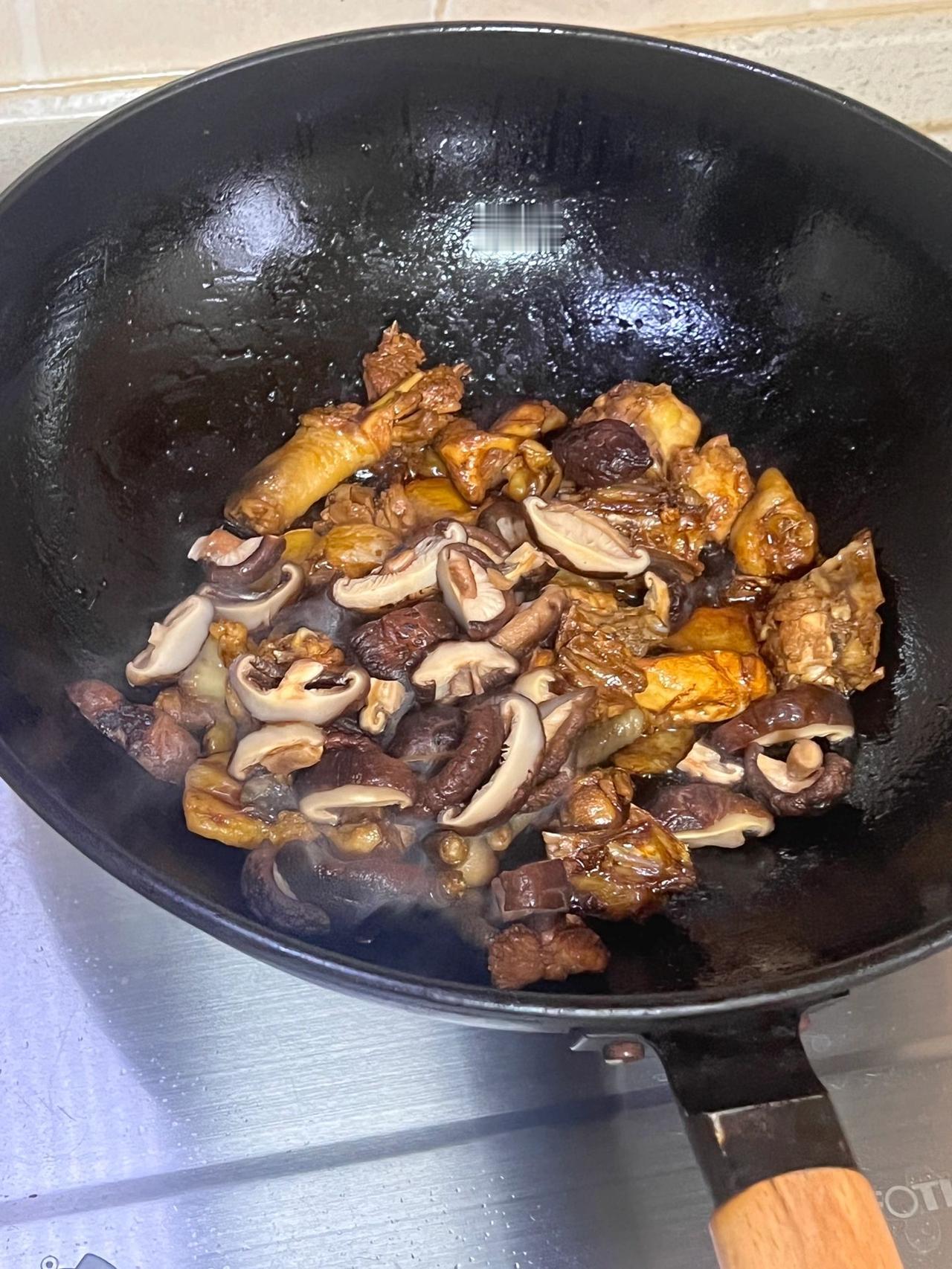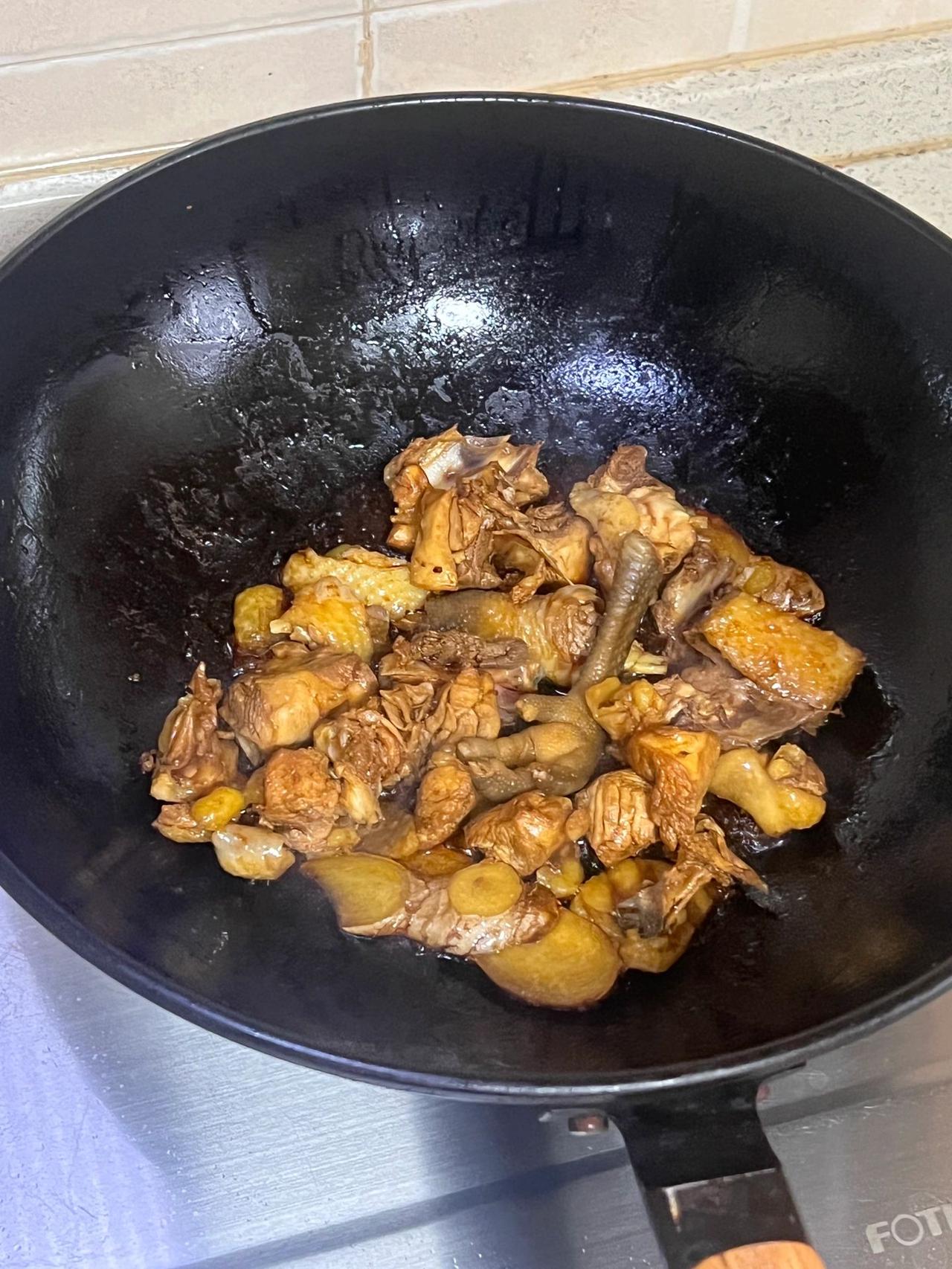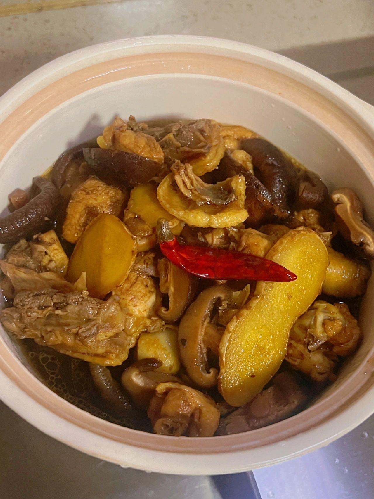 家常黄焖鸡的做法,学会了再也不用点外卖 以前在学校的时候最喜欢吃食堂的黄焖鸡米饭,鸡肉入味,剩下的汤汁拌着米饭简直妙呀,按照我的比例来做这道黄焖鸡米饭一定能满足爱吃黄焖鸡米饭的你,不会翻车,绝对好吃 所需材料:鸡肉、干香菇、生姜、干辣椒 做法如下:1、生姜切片,干香菇泡发后切成片状(泡干香菇的水过滤后保留),鸡肉切块焯水后用料酒、生抽、老抽腌制半小时以上,比例为3:2:1。 2、起锅烧油,把生姜片和腌制好的鸡肉用中火充分炒香、炒出油脂,然后从锅边淋入一瓶盖白酒增香再次翻炒两分钟左右。 3、加入切好的香菇片,炒到香菇微微出汁儿后加入3个干辣椒继续煸炒,炒出辣椒的香味后再将过滤好的香菇水倒入锅中,大火煮开后转入砂锅,用中小火焖煮25分钟,最后开大火收收汁儿,摆盘即可出锅 是不是超级简单,不需要什么花里胡哨的调料,按我这样的比例原汁原味不腥不柴,鲜嫩入味。 这里划重点:“香菇水是精髓千万不要倒了” 怕盐味不够的可以在最后一步适量添一点儿盐,但是切记不要多了,因为香菇特别吸味,总之根据自己的食材来调整用量即可。家里有青椒的也可以在最后收汁的时候时候放一点儿进去煮煮,风味更佳。 个人觉得这方子做出来跟外卖馆子的黄焖鸡米饭没啥区别了,反正好吃两字我是说腻了,只有你们自己试试才知道