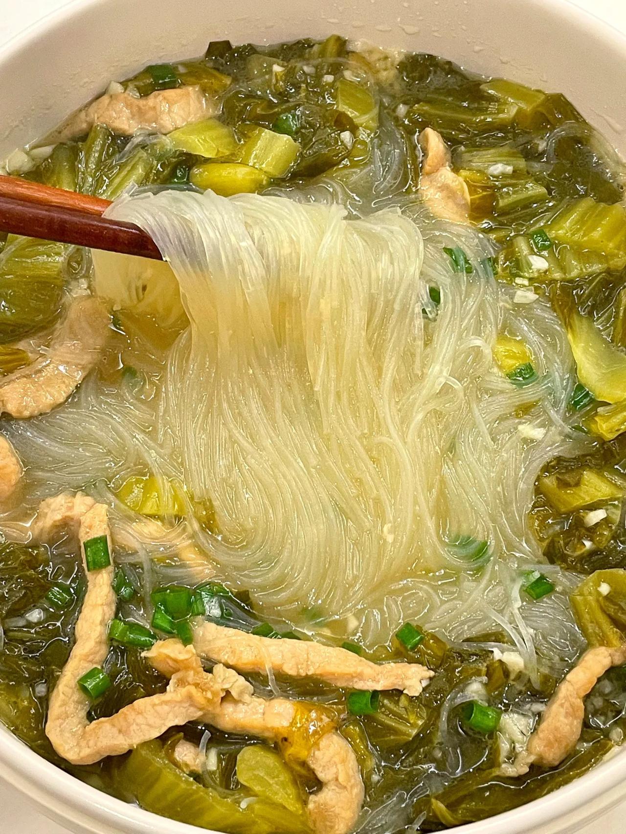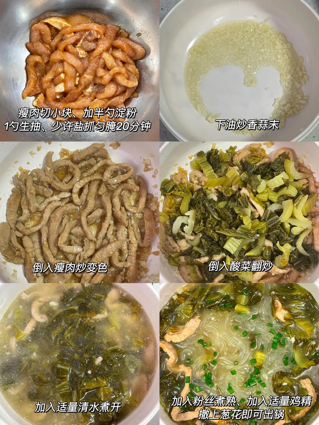 只要八块钱,酸辣开胃的酸菜粉丝肉片汤,绝了 夏天一定要试试这个酸辣粉丝肉片汤!酸酸辣辣的巨开胃!肉片滑嫩,粉丝酸辣爽口一定要试试! 做法: 1、瘦肉切小块、加半勺淀粉、1勺生抽、少许盐抓匀腌20分钟; 2、锅中放油炒香蒜末 ,倒入瘦肉炒变色,再倒入酸菜翻炒; 3、加入适量清水,再加入粉丝煮熟、最后加入适量鸡精,煮开撒上葱花即可。