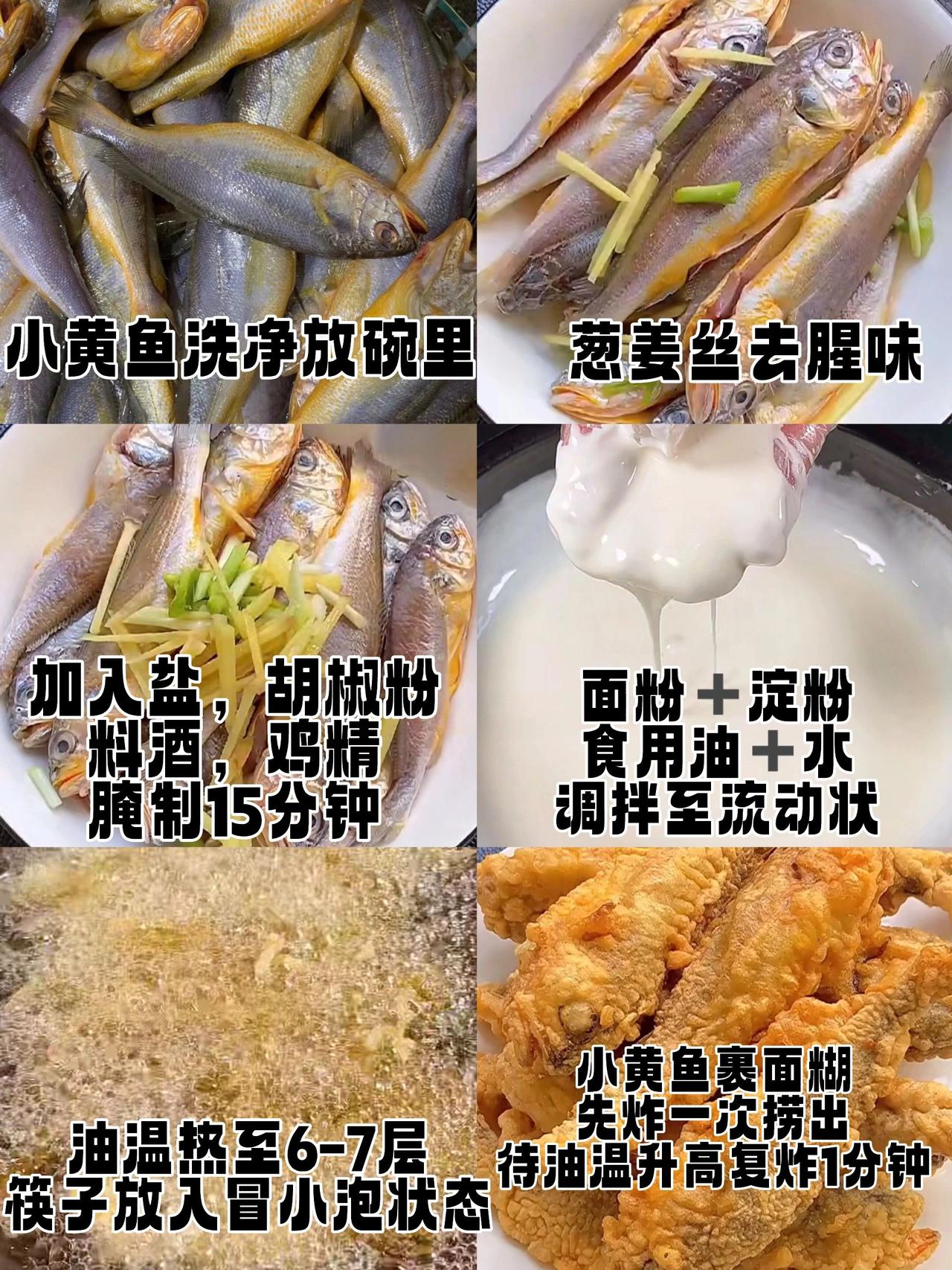 下酒停不下来的酥脆小黄鱼,一口一口太香了 下酒菜酥脆黄鱼,决绝子;老爹每一口都赞不绝口,停不下来!! 食材:小黄鱼 葱姜 料酒 胡椒粉 面粉 淀粉 制作:1、小黄鱼洗净放入碗中备用 2、姜切丝,葱切段,适量盐、胡椒粉、料酒、鸡精用手抓匀腌制十五分钟左右去腥 3、面粉和淀粉倒入碗中,一比一比例,加入食用油和清水搅拌均匀,面糊成流动状即可 4、烧油至油温达到六—七成,筷子放入油锅周围冒小泡就可以开始炸了,腌好的鱼放入面糊中裹上面糊,一条条的放入油锅中,不要动待定型之后用筷子稍微抛开防止粘在一起,炸至两面金黄用漏勺捞出 5、捞出第一次炸后的碎渣,再次升高油温,倒入小黄鱼复炸半分钟到一分钟左右沥干油,放凉就可以食用啦 喜欢吃麻辣味的可以把炸好的鱼倒入锅中,倒入辣椒面和花椒面翻拌均匀超级好吃