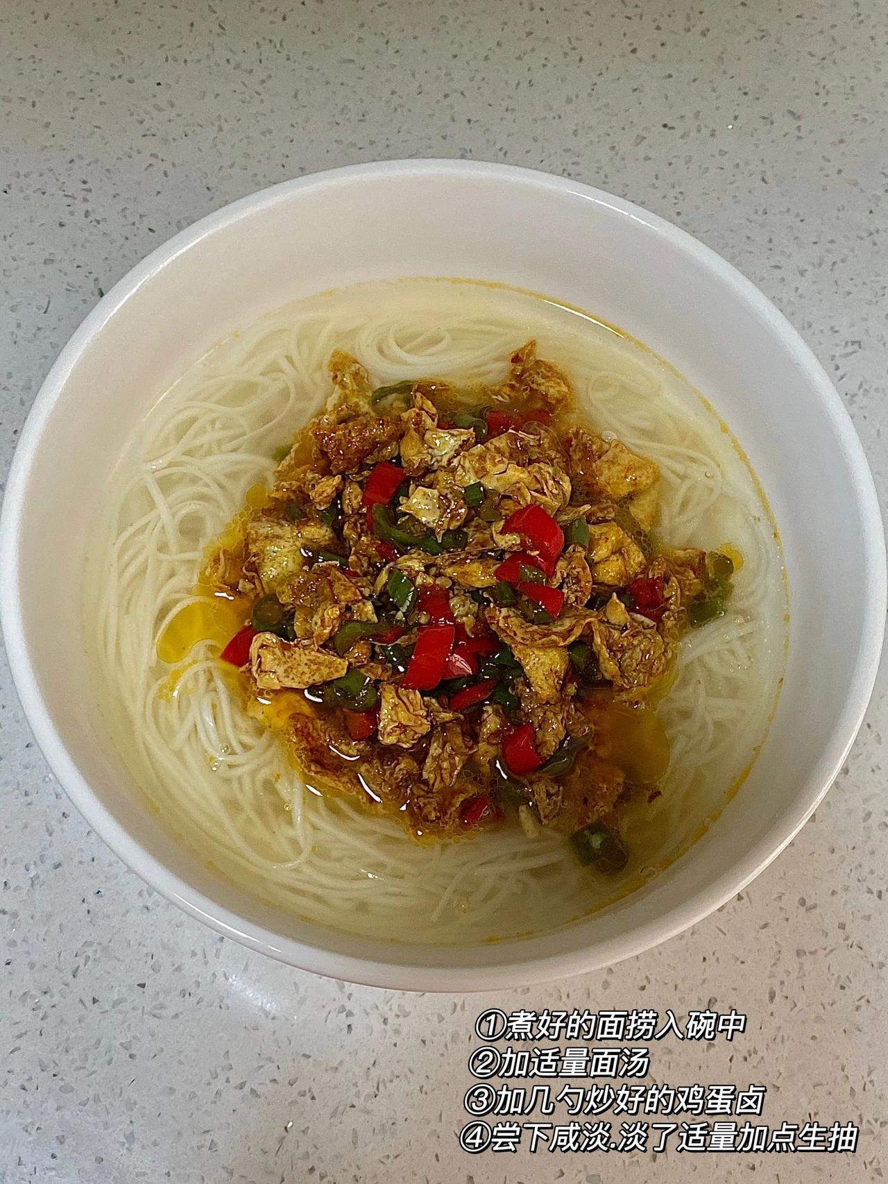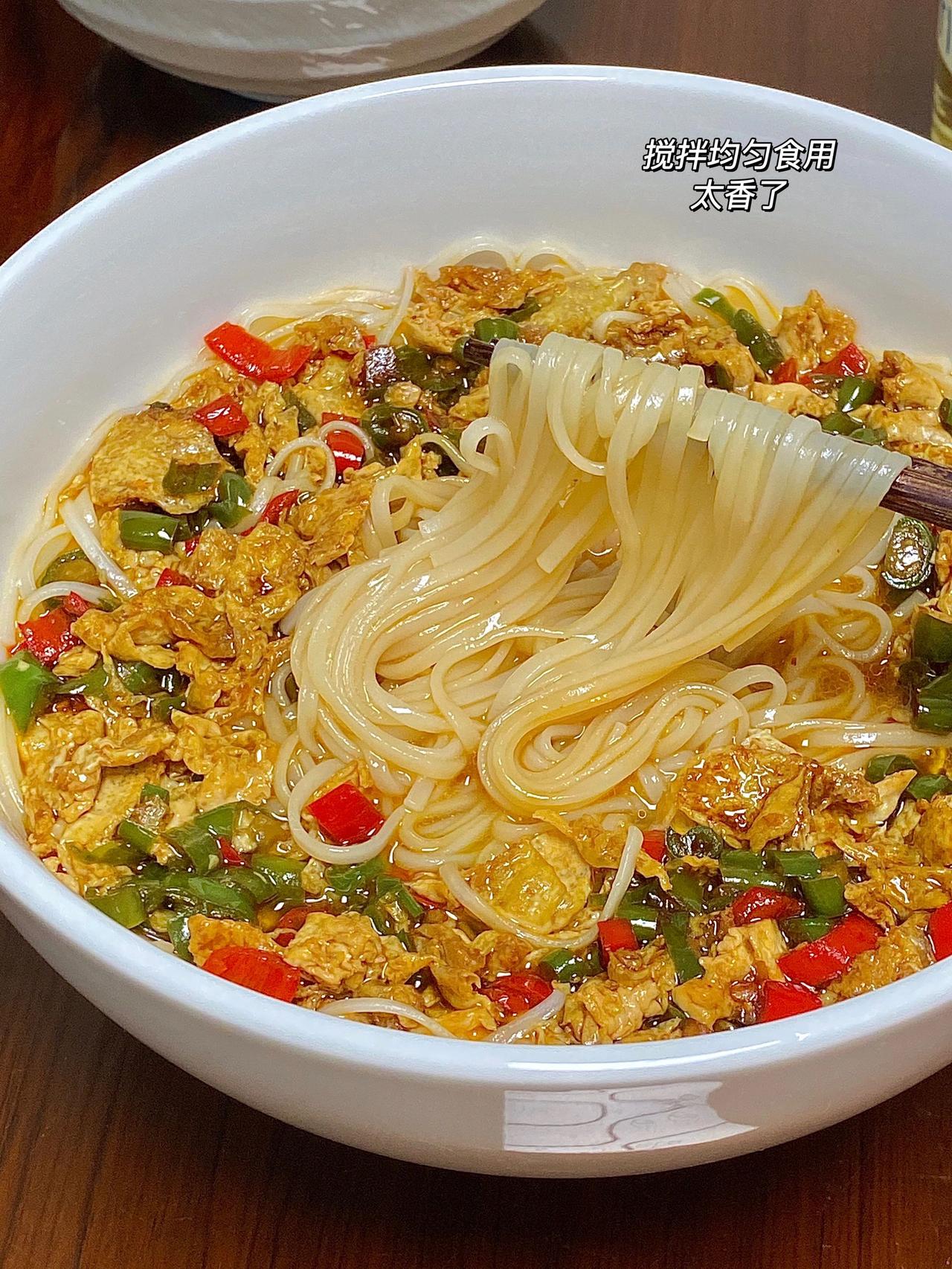又是吃面的一人食餐,今天这个面我都佩服我自己 尝了一口内心想:自己手艺杠杠的,还去啥面馆呀,想吃就自己做! 青椒鸡蛋面(可以汤面也可以干拌) 1、两个鸡蛋打散.青红椒切小粒. 2、先调一碗料汁备用:2生抽.1勺蚝油.2勺香辣酱.5勺清水.少许胡椒粉.1茶匙鸡精,搅拌均匀. 3、锅里热油将鸡蛋炒至金黄盛出 4、再热油炒青红椒粒.炒至快断生倒入料汁煮开.接着倒入鸡蛋翻炒均匀至入味关火 5、另起锅煮面,煮好的面捞入碗中.倒入适量面汤.加几勺青椒鸡蛋拌匀.尝下咸淡.淡了加适量生抽.搅拌均匀食用.