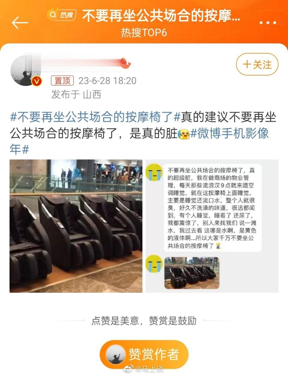 #不要再坐公共场合的按摩椅了# 管理不善我信,但是什么流浪汉其实是在属于散布不实谣言了。商场的按摩椅基本都定期消杀,中国的商场基本看不到流浪汉,言过其实、炒作焦虑还有人管吗?