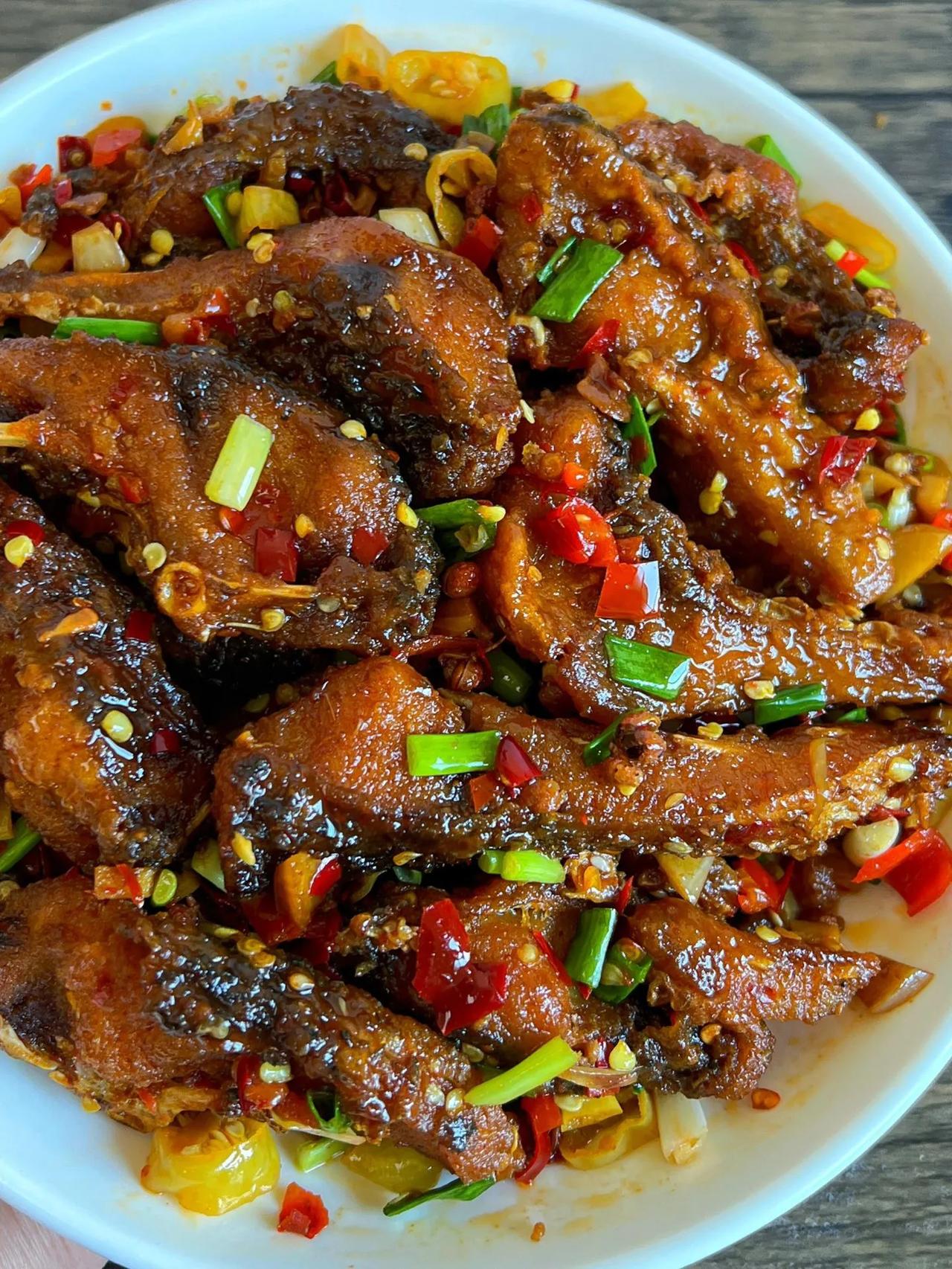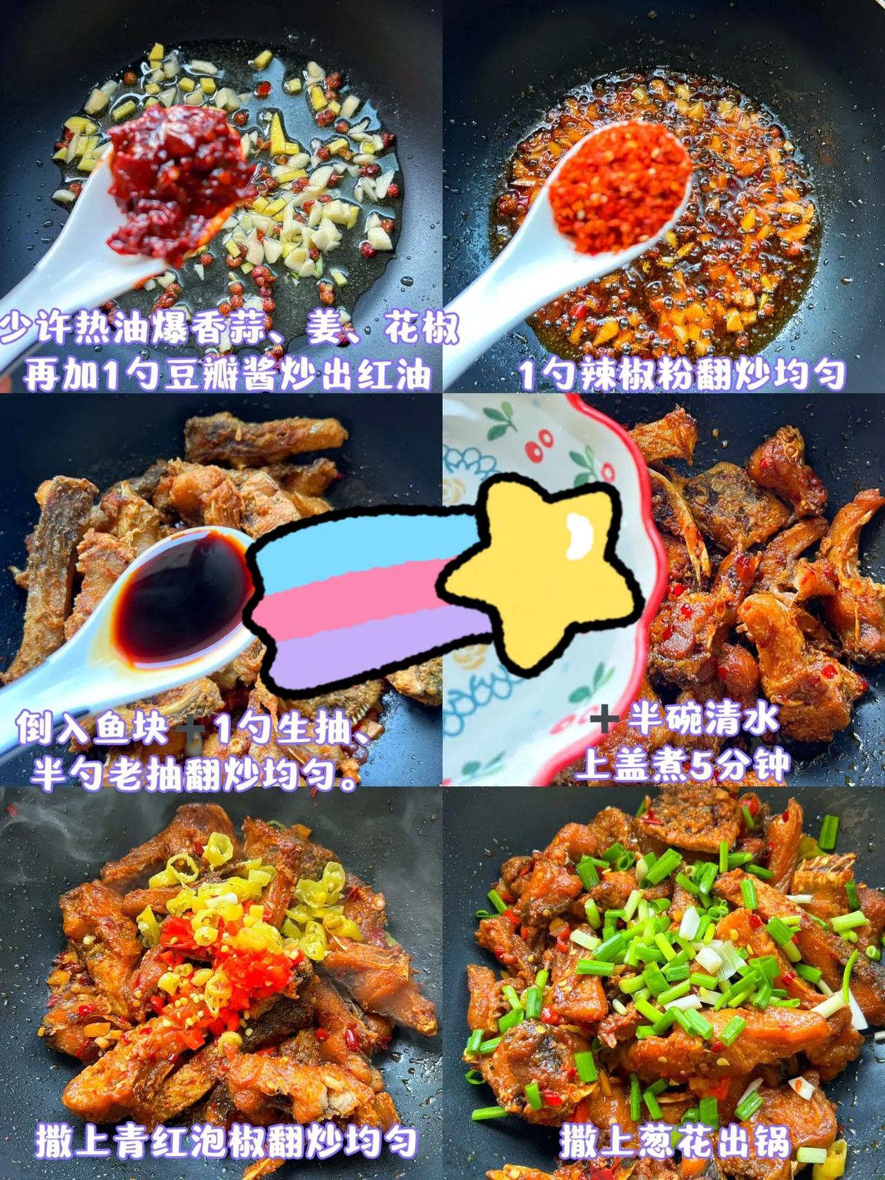 我妈做的这个香辣鱼块,真的太好吃了! 我妈做的香辣鱼块太下饭了!跟外面的一样,做法简单香辣有味! 做法: 1、鱼块加1勺料酒 、盐、胡椒粉、花椒粉少许、1勺淀粉抓匀; 2、热油放鱼块炸至表面微黄捞出,再复炸1次 至金黄捞出; 3、少许热油爆香蒜、姜、花椒,再加1勺豆瓣酱炒出红油,加1勺辣椒粉翻炒均匀; 4、倒入鱼块翻炒一下,加1勺生抽、 半勺老抽翻炒均匀,再加半碗清水 ,盖上盖煮5分钟; 5、撒上青红泡椒翻炒均匀,出锅前撒上葱花即可。