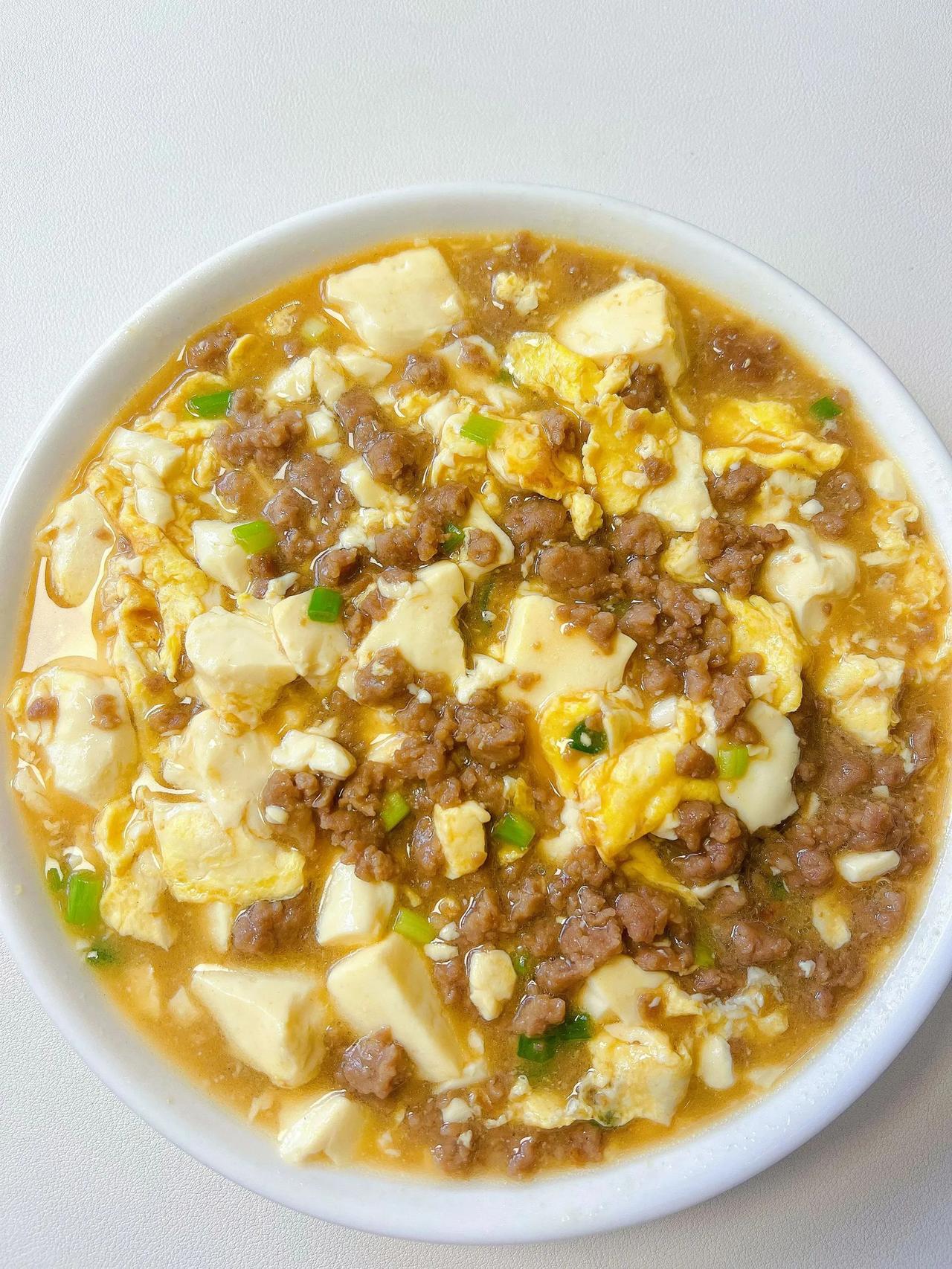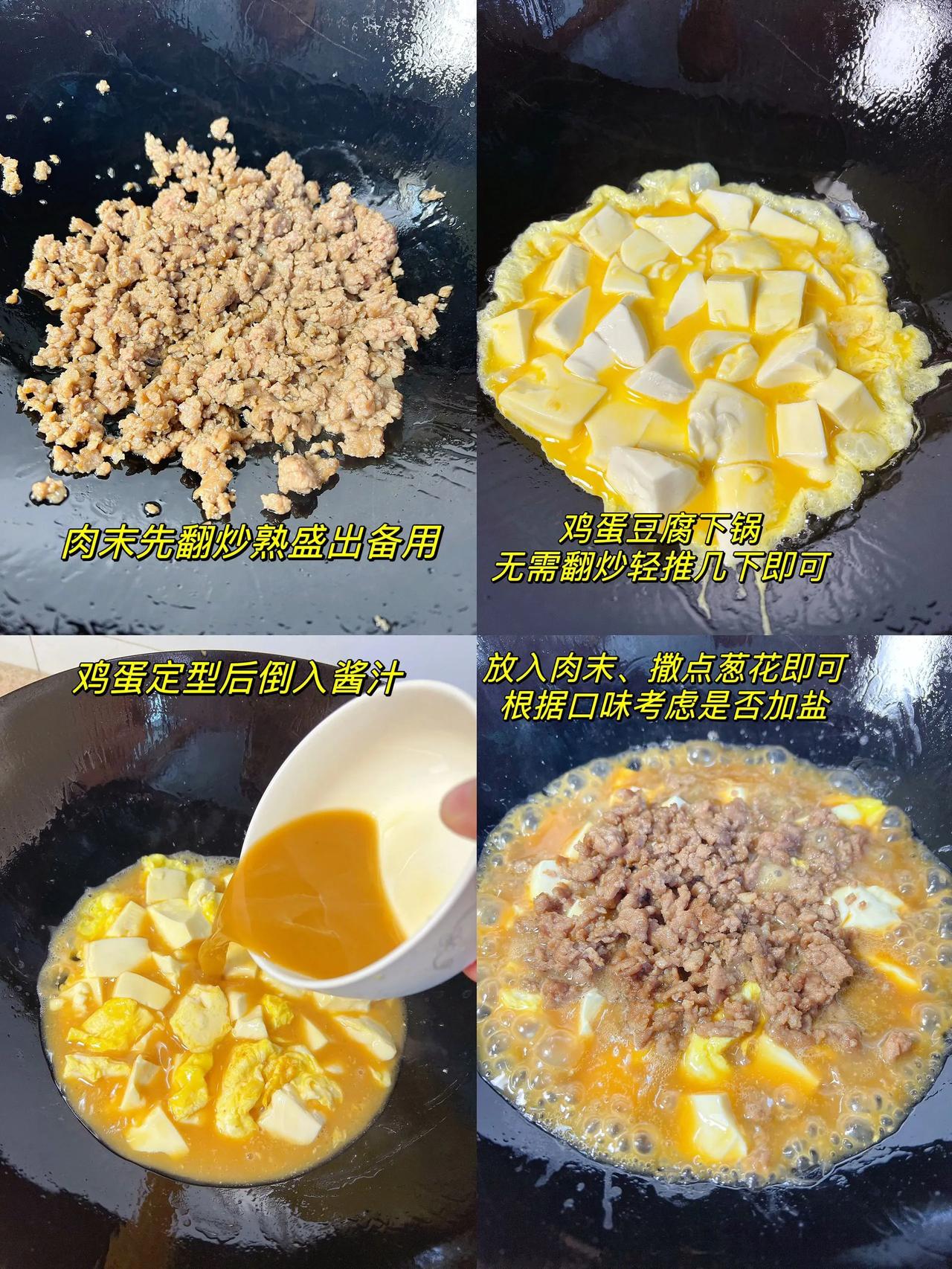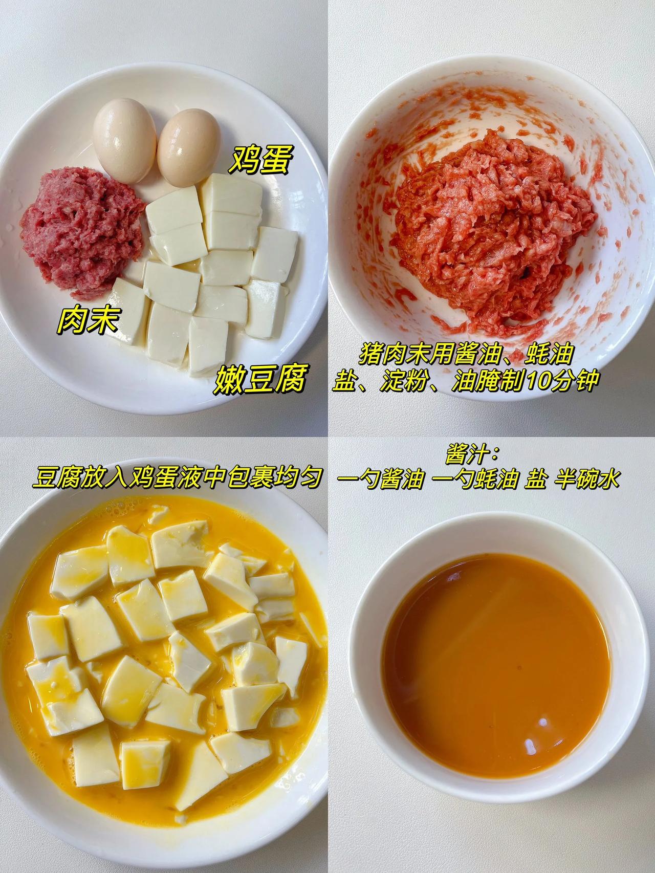 简单零失败!超级无敌下饭的肉沫豆腐! 一个星期要炫几次的菜,巨下饭!快给宝宝安排起来! 做法: 1、猪肉末用酱油、蚝油、盐、淀粉、油腌制10分钟; 2、酱汁: 碗中放一勺酱油、一勺蚝油、盐、半碗水; 3、豆腐放入鸡蛋液中包裹均匀; 4、肉末先翻炒熟盛出备用; 5、鸡蛋豆腐下锅(无需翻炒轻推几下); 6、鸡蛋定型后倒入酱汁,放入肉末、撒点葱花即可(根据口味考虑是否加盐)。