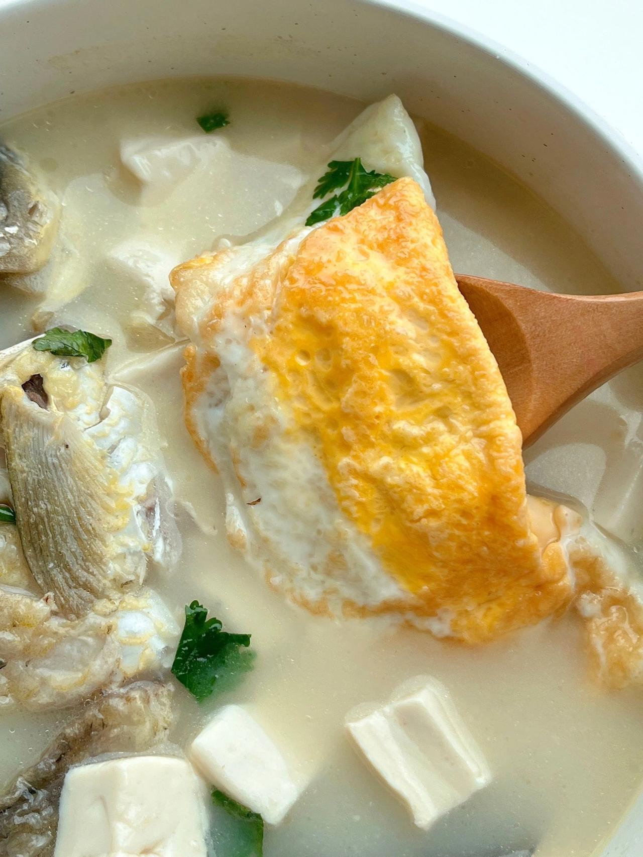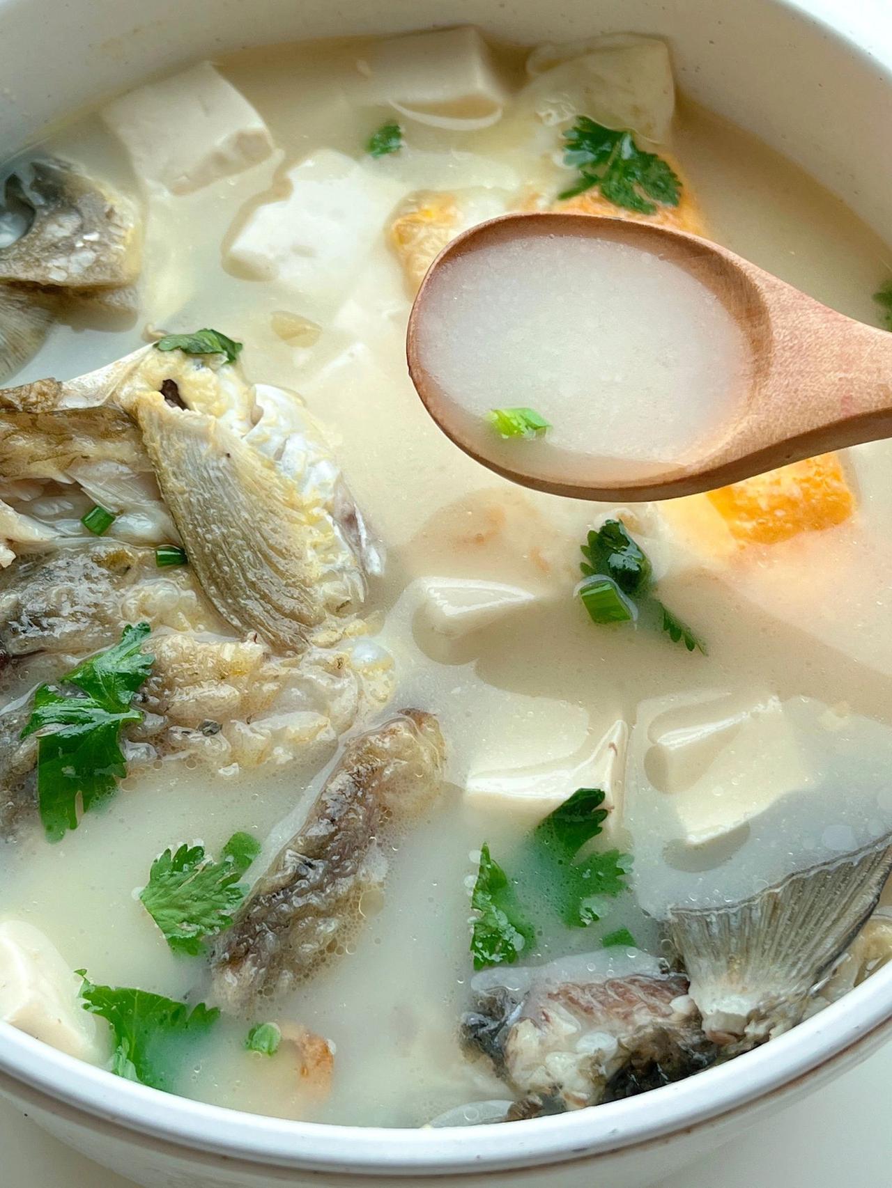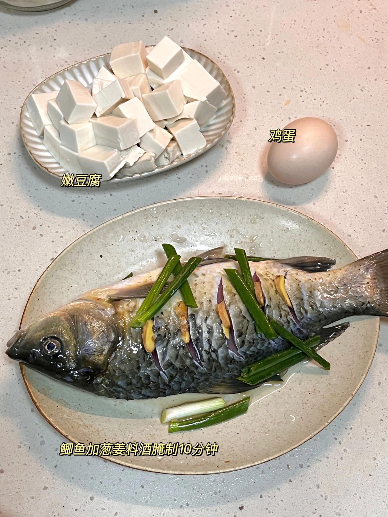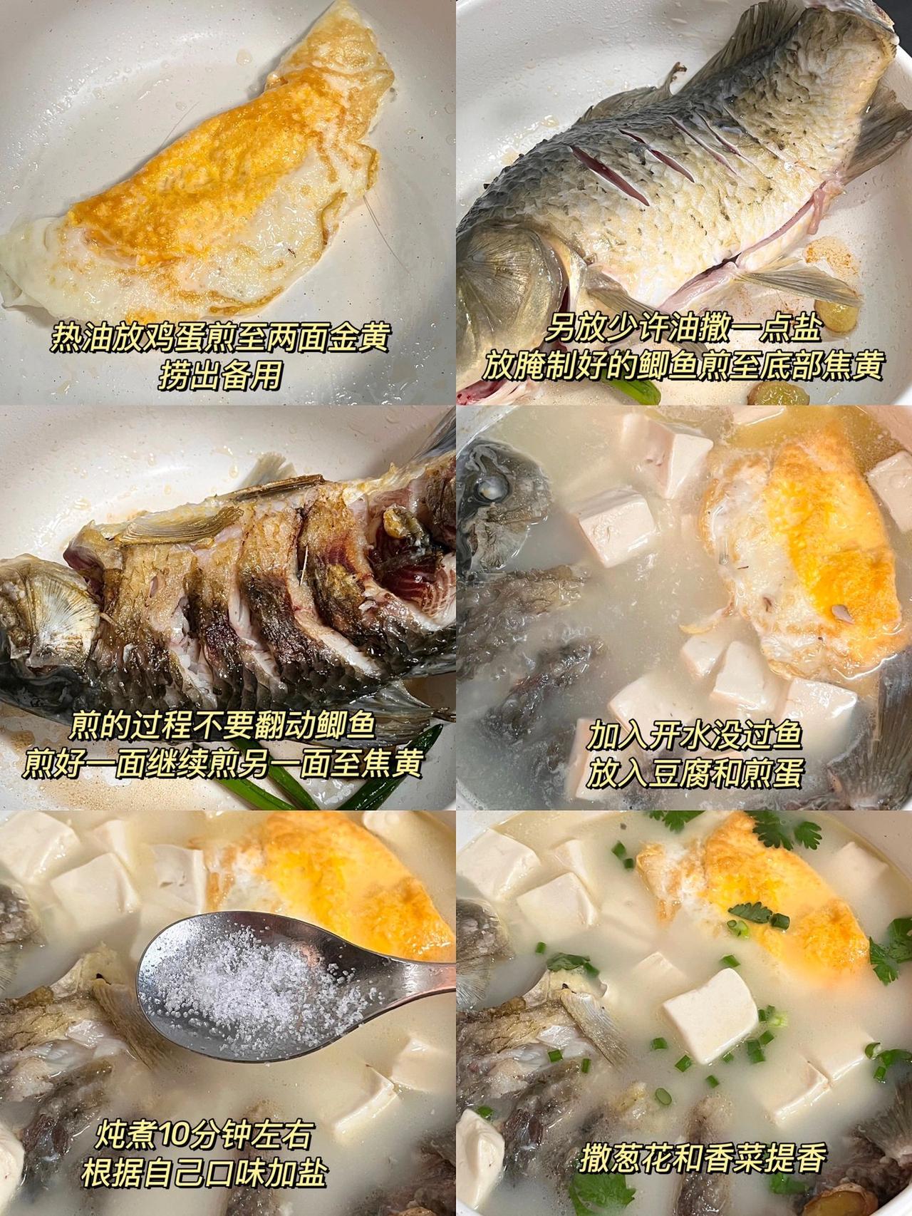 超鲜美!轻松做出奶白奶白的鲫鱼豆腐汤 今天的晚餐是「鲫鱼豆腐汤」作为减脂晚餐 简直不要太棒!鲜美又低卡~蛋白质满满 食材:鲫鱼|豆腐|鸡蛋|葱姜香菜 做法:1、鲫鱼处理好洗干净,鱼身划几刀,放入姜片和葱加一点料酒腌制10分钟 2、热油放鸡蛋煎至两面金黄捞出备用,再加一点油撒一点盐,放鲫鱼煎至底部焦黄(煎的过程中不要翻动)再煎另一面 3、倒入开水没过鲫鱼,放入豆腐和煎蛋 4、炖煮10分钟左右,根据自己口味加盐,撒葱花和香菜提香 让汤奶白的秘诀就是把鱼煎一下再加开水,不需要复杂的调料,简单的盐和葱花就能让汤鲜美无比!赶紧喝起来吧~