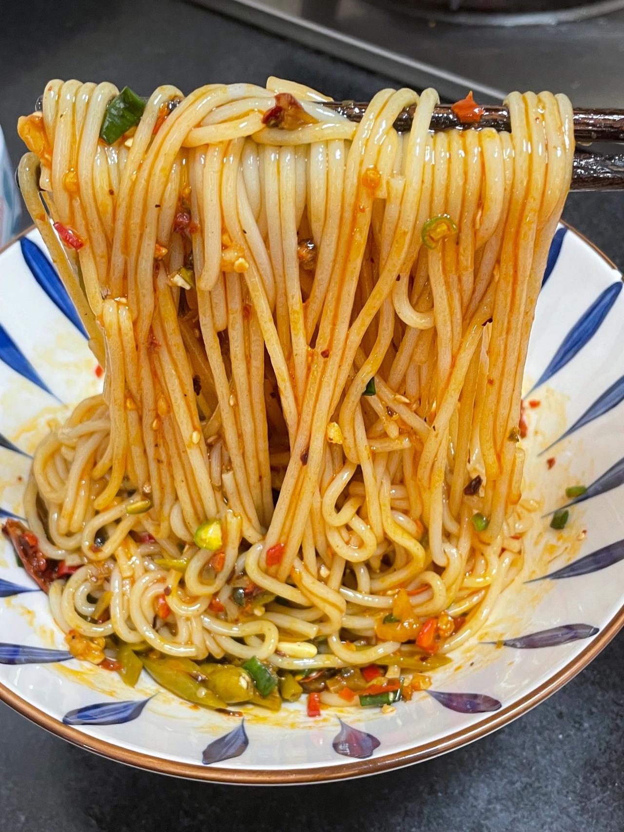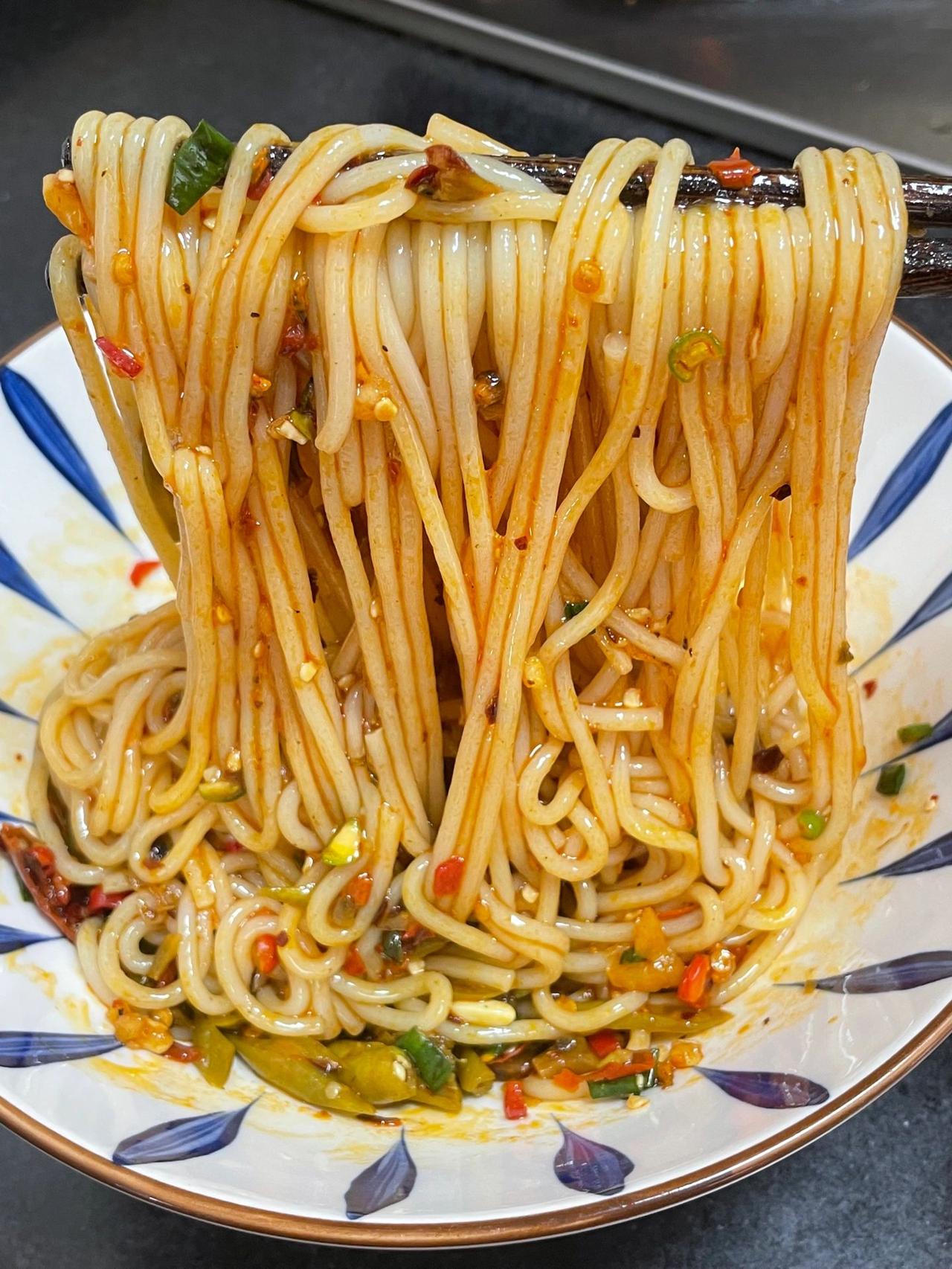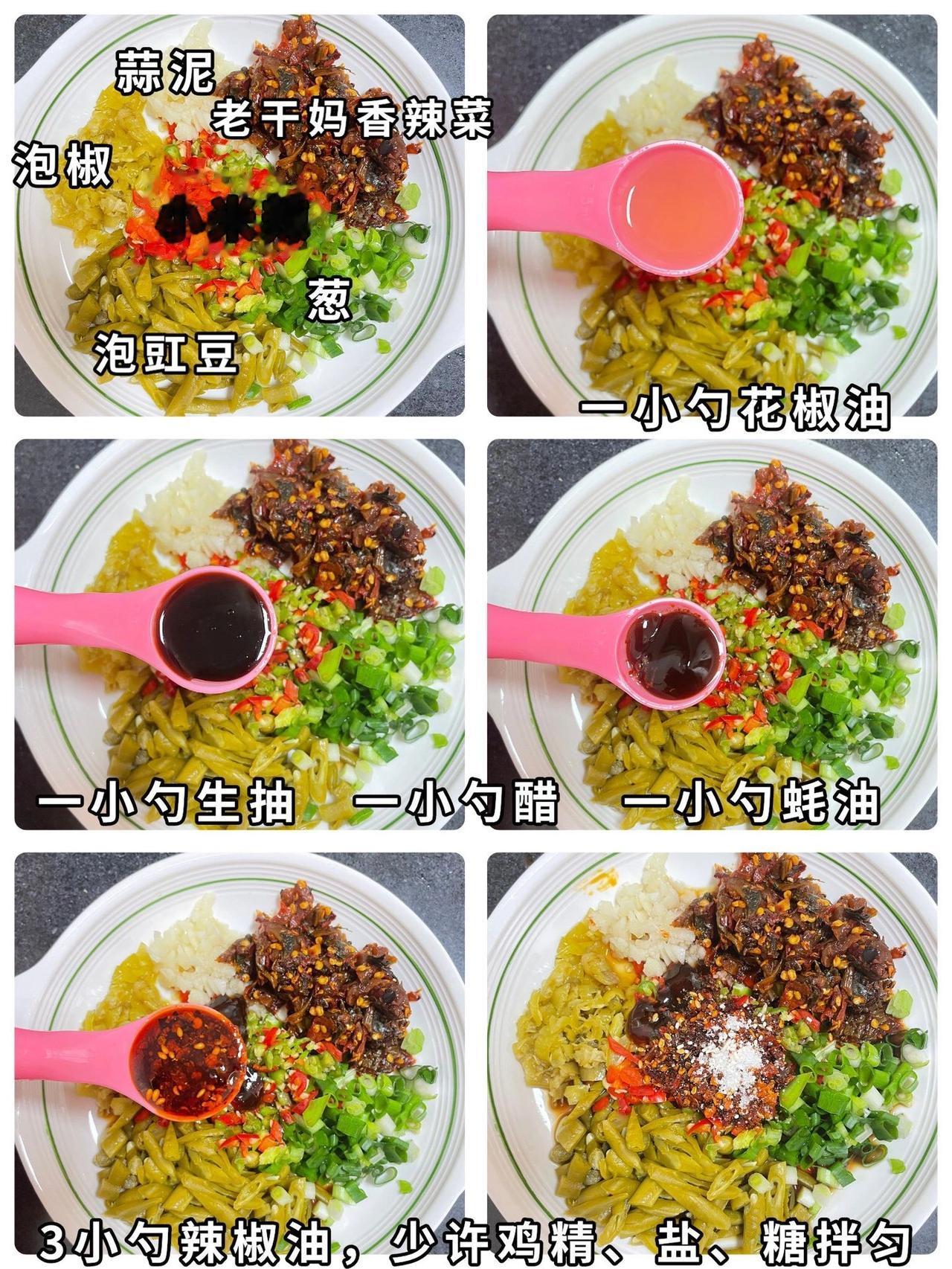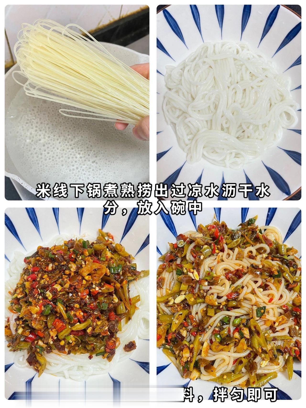 感谢网友的配方,这个真的是流着口水拌出来 我想没有人不爱嗦粉吧。这样做出来的拌粉真的巨巨巨好吃,用我姐们说的话,这个料拌鞋垫都是好吃的,哈哈,这个完全就是一个人可以干一大碗。 食材:米粉 做法:1、首先我们来调一个拌料。嗯,青红小米辣,葱花、泡豇豆,如果没有泡豇豆的话,可以买外面袋装的泡豇豆。老干妈香辣菜(是这个菜的灵魂)蒜泥.泡椒.再来一小勺花椒油,一小勺生抽,一小勺的醋,一小勺蚝油,三小勺辣椒油,少许的鸡精、盐、糖拌匀备用。 2、水开,下入米粉煮熟,煮熟之后过凉水沥干,放入碗中,再倒入我们准备好的拌料,拌匀即可开吃 香味香飘十里,喜欢的姐妹赶紧做起来吧