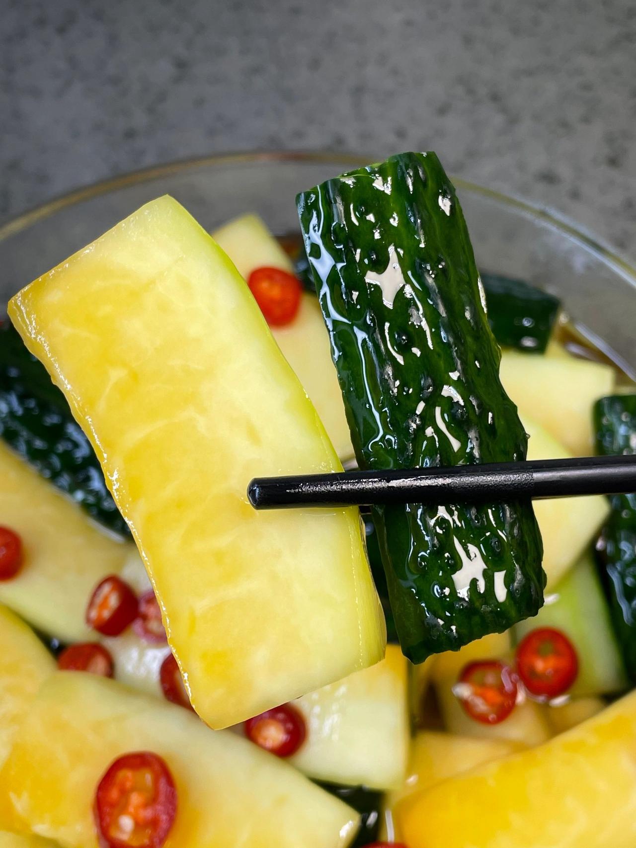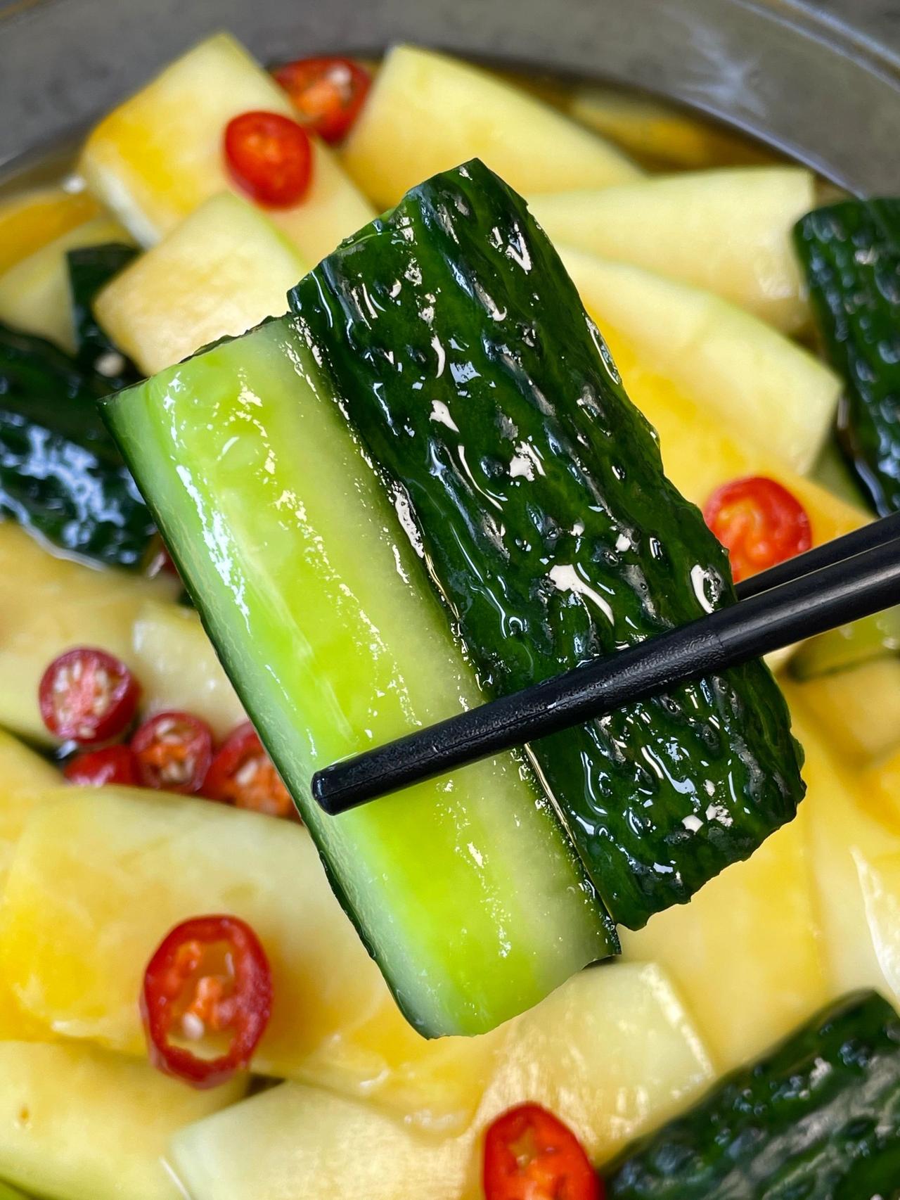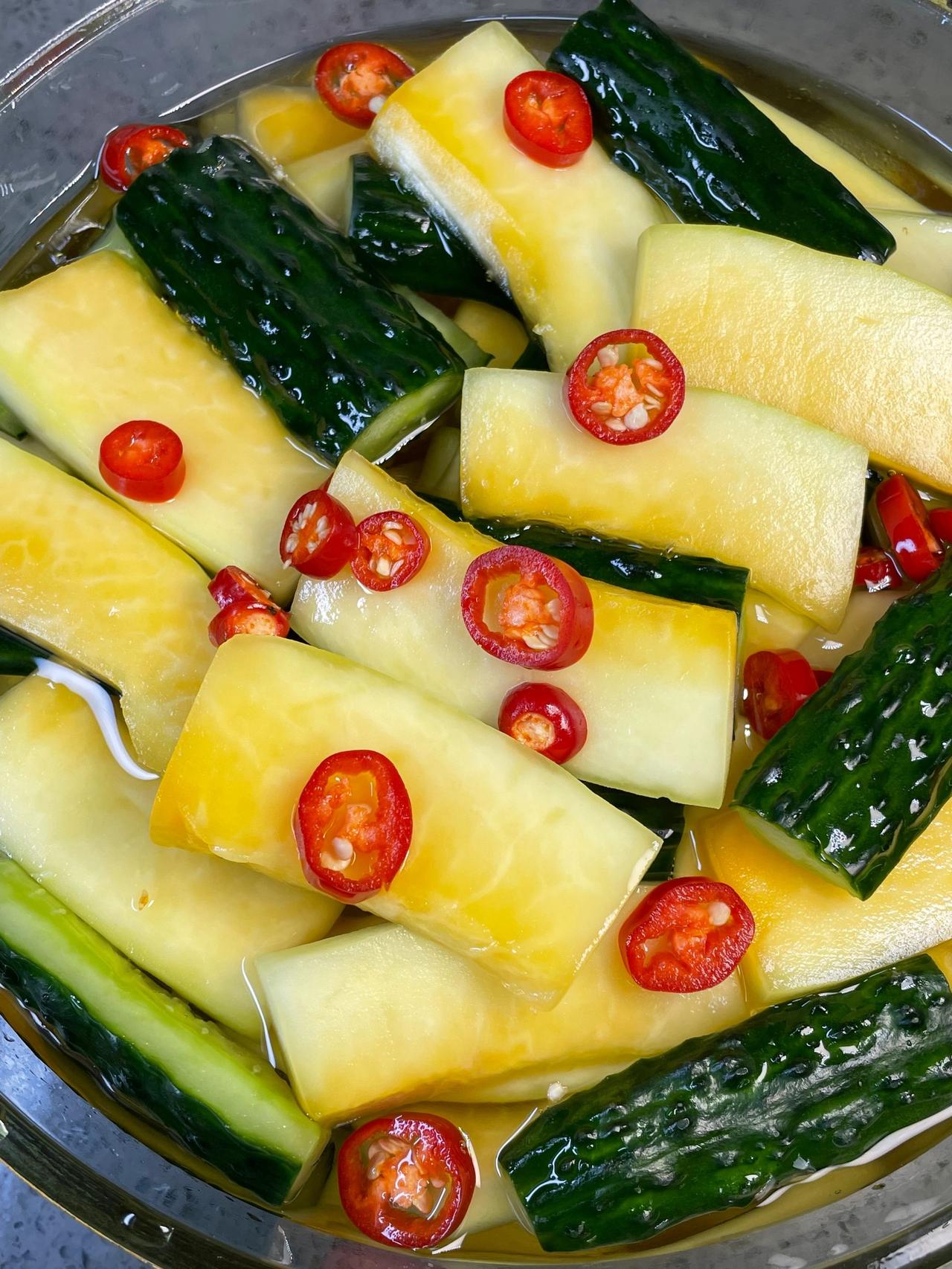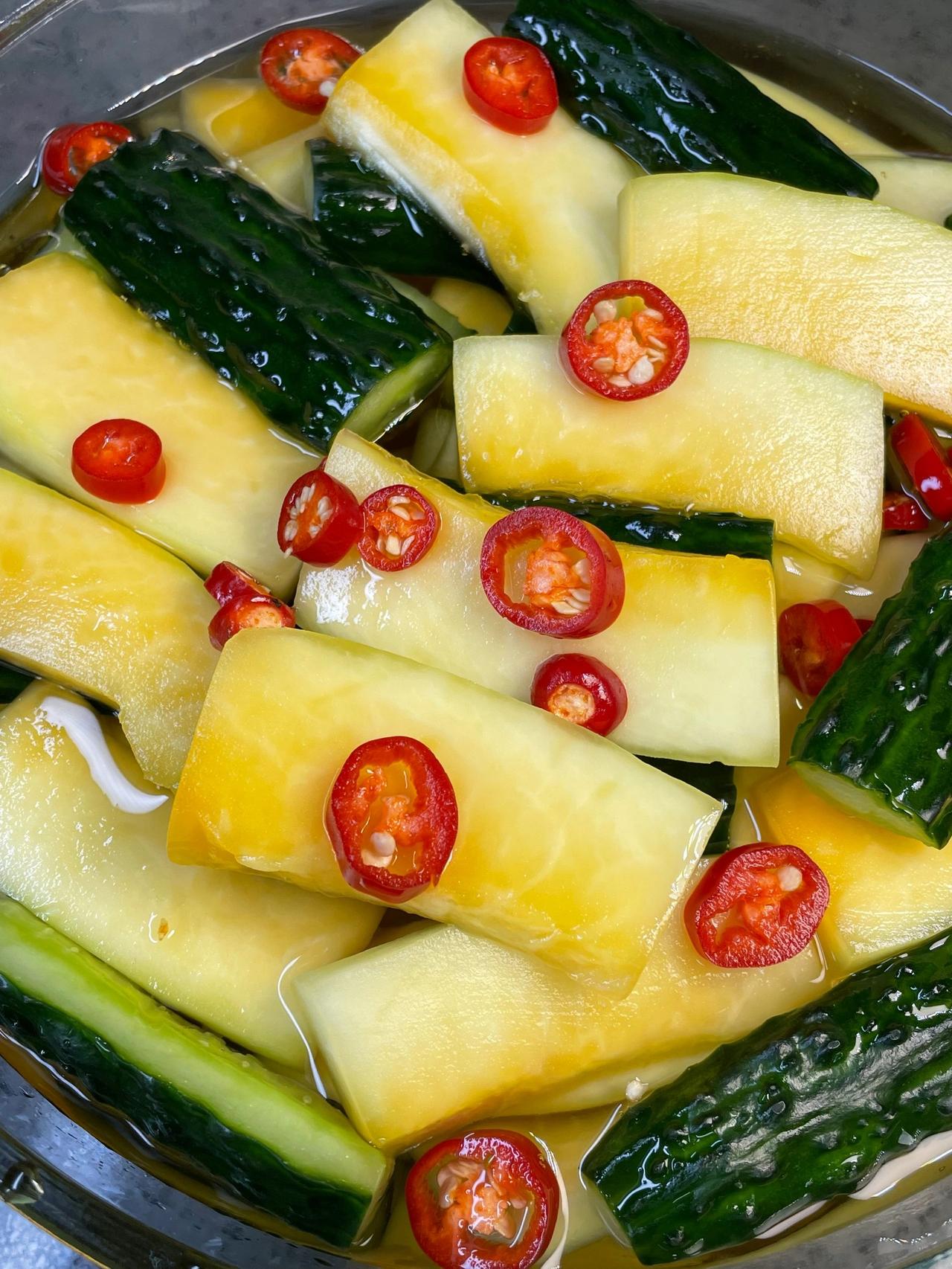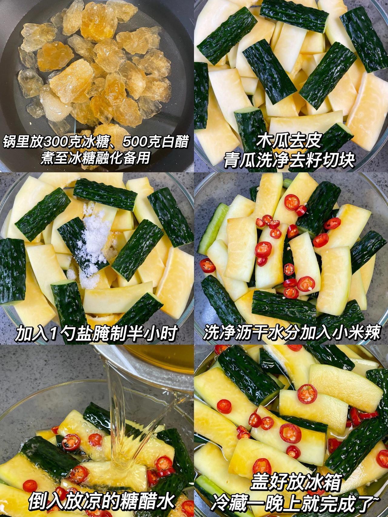 我妈教我的神仙吃法!!好吃到爆 酸爽爽脆!比酸料店还好吃!木瓜酸和青瓜酸搭配,酸辣爽脆,特别开胃,非常解腻,而且做法非常简单,有手就会~ 食材:青瓜、木瓜、小米辣、冰糖、白醋 做法:1、锅里放300克冰糖、500克白醋,煮至冰糖融化备用 2、木瓜去皮,青瓜洗净去籽切块,加入1勺盐腌制半小时,洗净沥干水分,加入小米辣 3、倒入放凉的糖醋水,盖好放冰箱,冷藏一晚上就完成了~ 这个酸爽爽脆简单下饭,多汁解腻,夏天吃真的好开胃,姐妹们快来试一试~