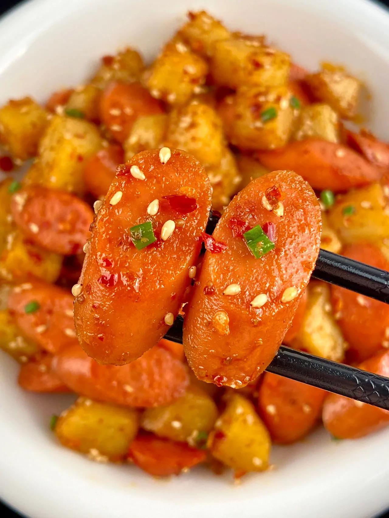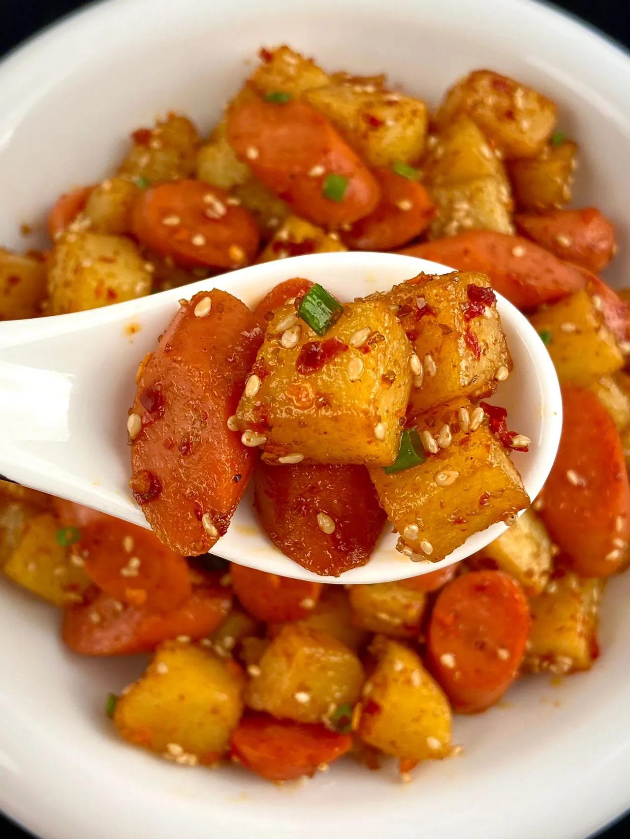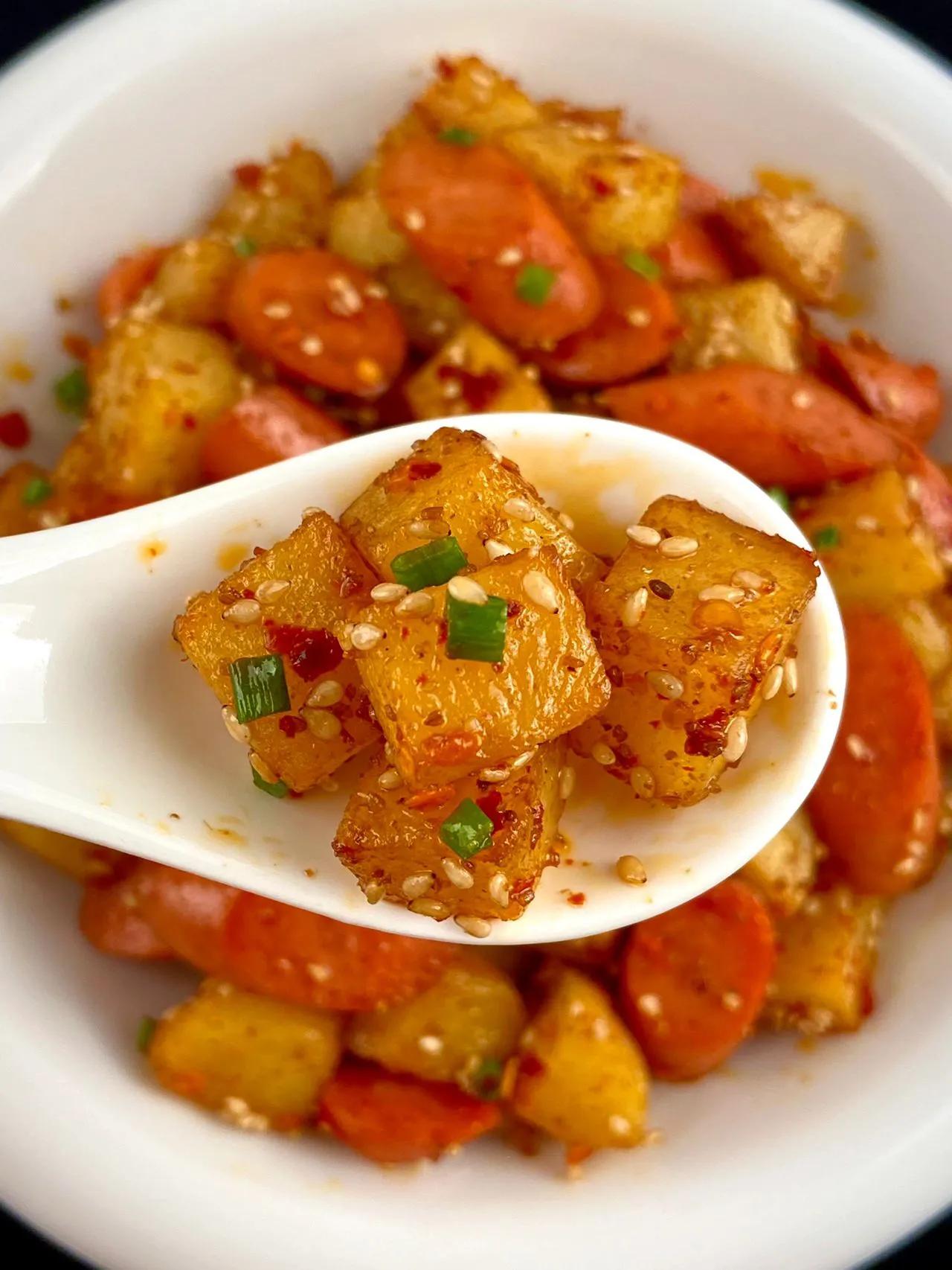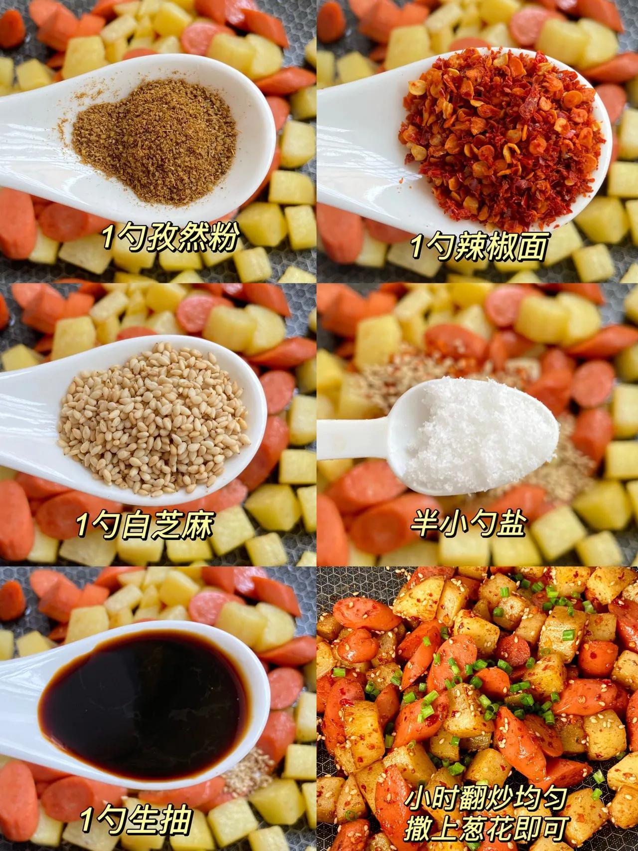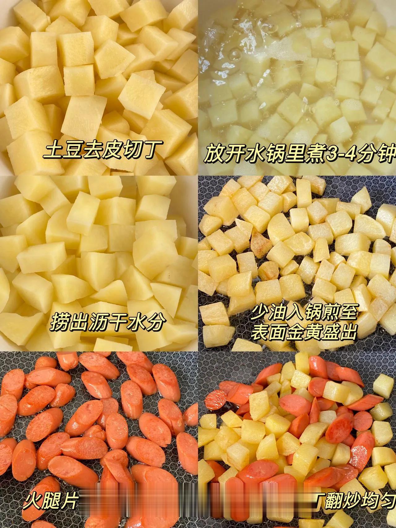 因为这个…我妈在小区出名了! 今天我妈做了孜然火腿土豆丁真的好好吃!巨香!香辣过瘾,比烧烤店的还好吃,简单易做,好吃到停不下来!自己在家做超简单哦! 做法: 1、土豆去皮切丁,放开水锅里煮3-4分钟,捞出沥干水分; 2、少油入锅煎至表面金黄盛出; 3、火腿片再煎至微黄,倒入煎好土豆丁翻炒均匀; 4、加入1勺孜然粉、1勺辣椒面、1勺白芝麻、半小勺盐、1勺生抽翻炒均匀,出锅前撒上葱花即可。
