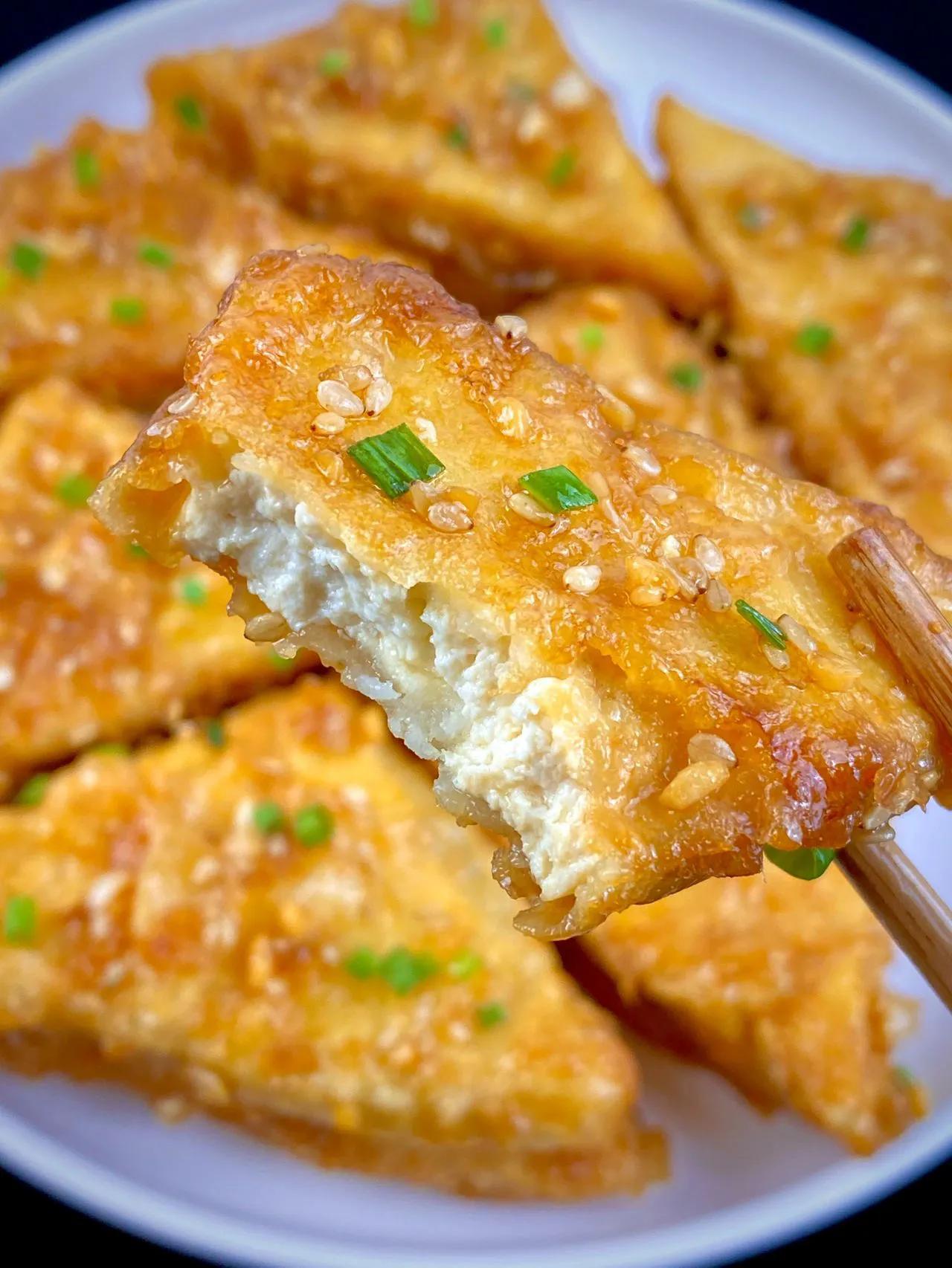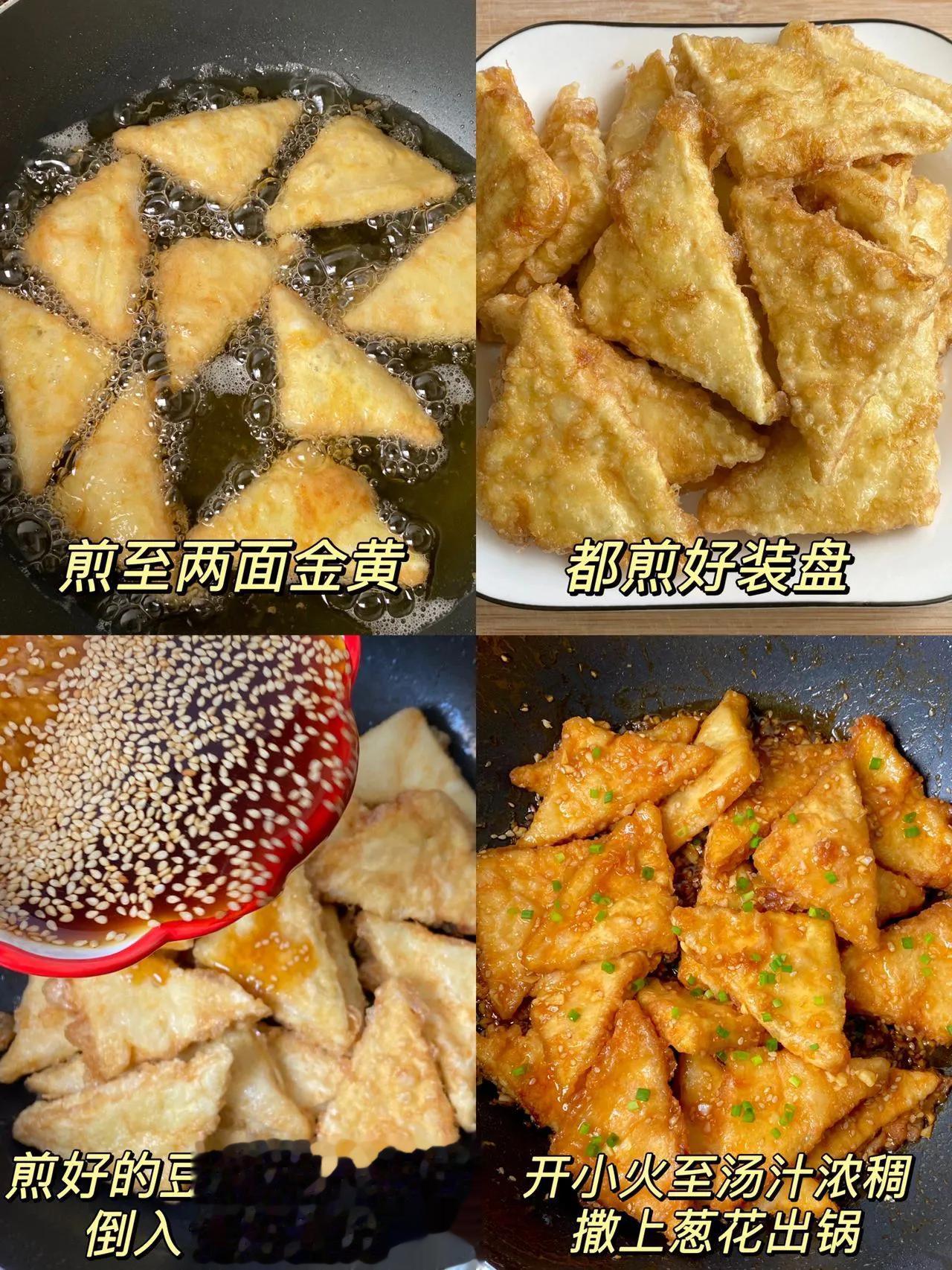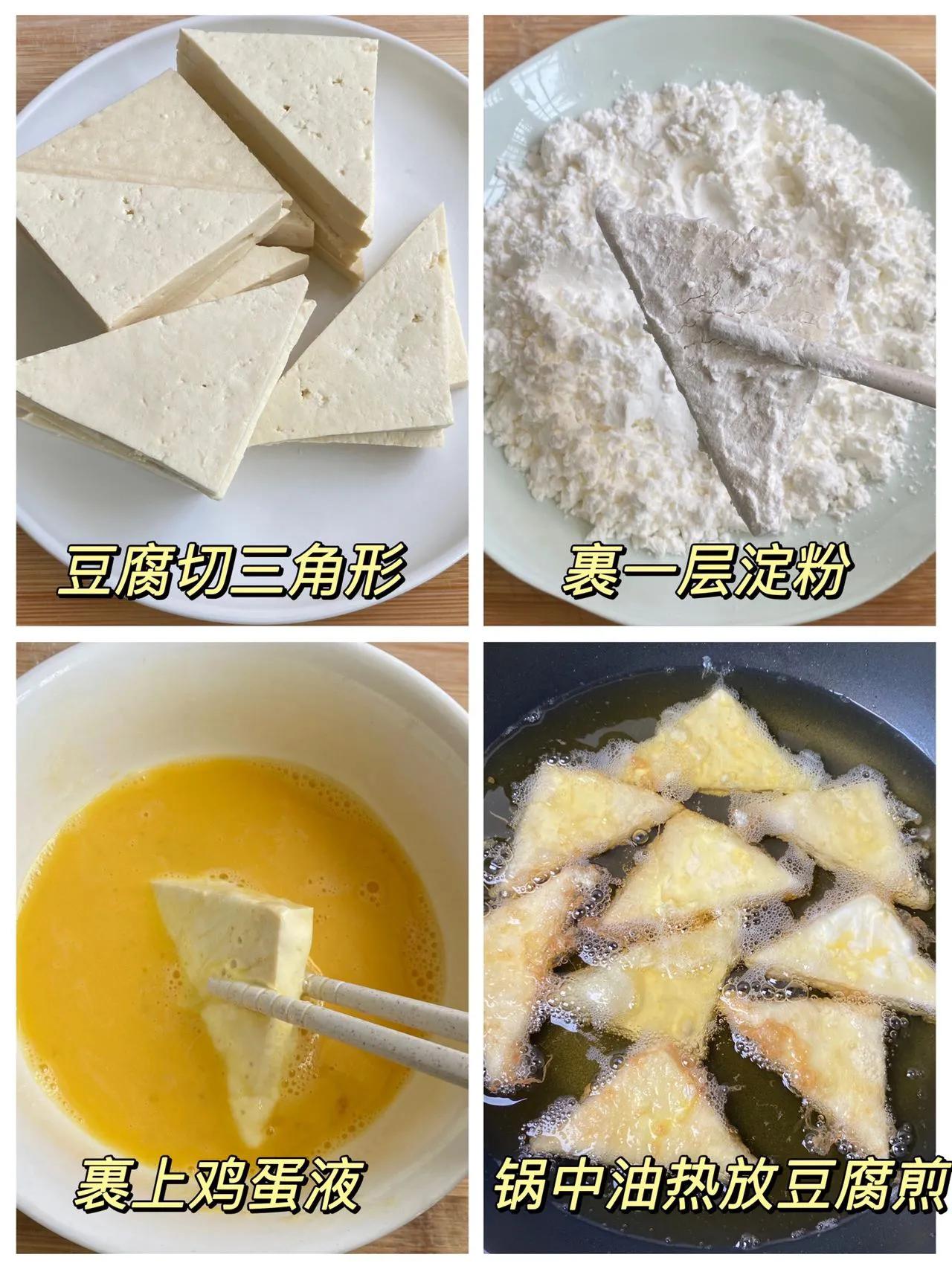 啊!这个香煎豆腐太好吃了亲,含泪推荐! 香煎脆皮豆腐真的好好吃哇!!还没出锅就闻到香味了!每块豆腐都裹满了浓郁的酱汁,拌米饭香喷喷呀外焦里嫩,一上桌秒光盘,家人都夸好吃~ 做法: 1、调酱汁:碗中放1勺蒜末、2勺生抽、1勺蚝油、适量盐、半勺白糖、1勺淀粉、1勺芝麻、半碗水搅拌均匀; 2、豆腐切三角形,裹一层淀粉,再裹上鸡蛋液; 3、锅中油热放豆腐煎至两面金黄,都煎好装盘; 4、煎好的豆腐放入锅中,倒入调好酱汁,开小火煮至汤汁浓稠,出锅前撒上葱花即可。