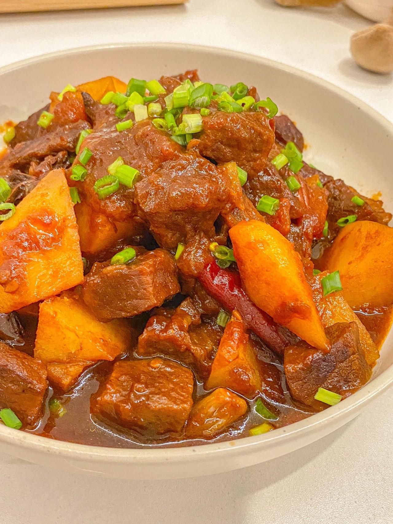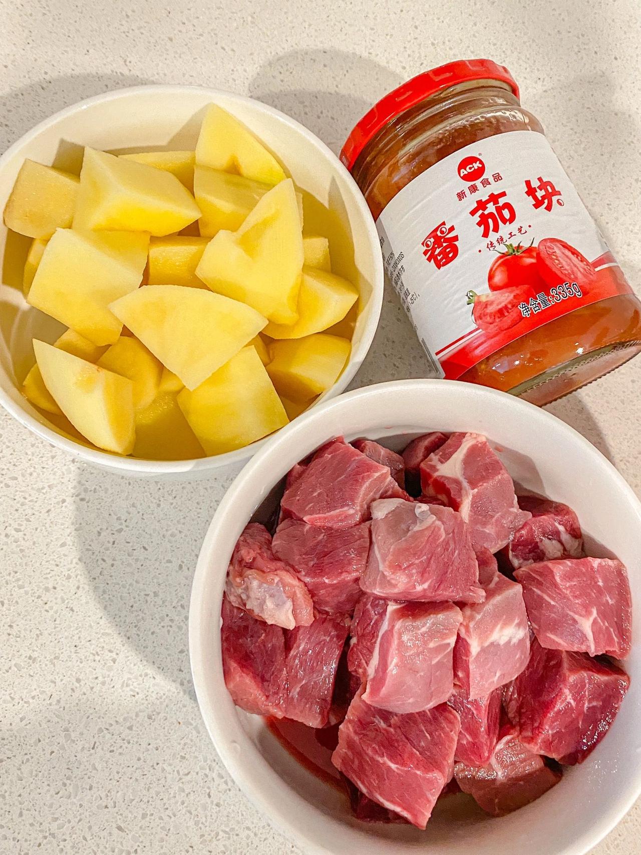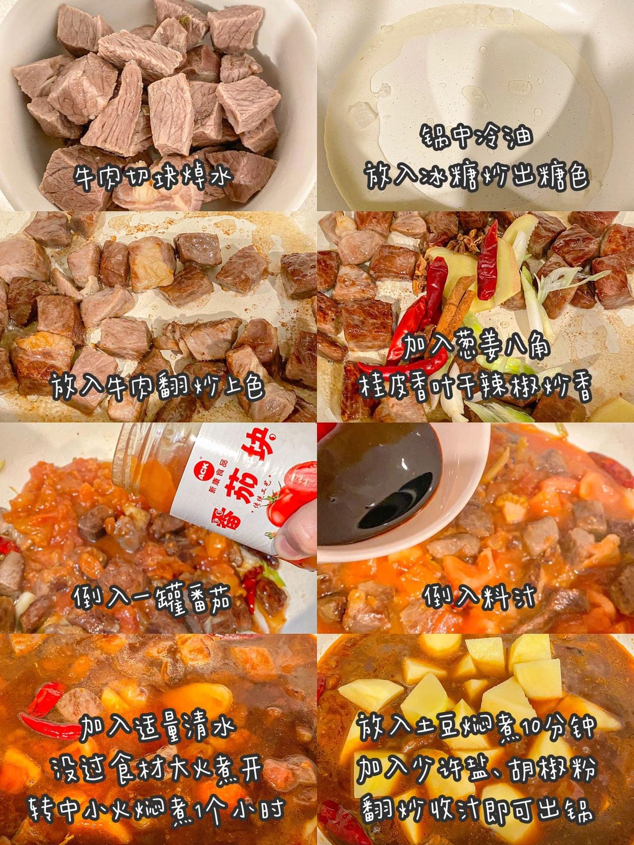 零失败番茄土豆炖牛肉,好吃到汤汁不剩 今日给大家分享一道做法简单巨好吃的番茄土豆牛肉,这样做出来的牛肉鲜嫩入味,土豆软糯,浓郁的汤汁酸甜可口用来拌面拌米饭都很绝,就是一整个爱住 食材:番茄罐头、土豆、牛肉、姜蒜、桂皮,八角、干辣椒 做法: 料汁:2勺生抽、1勺老抽、2勺蚝油搅拌均匀备用 牛肉洗净切块,冷水下锅加入葱姜料酒煮开,捞出冲洗沥干水分 锅中冷油放入冰糖,小火翻炒出糖色,倒入牛肉翻炒上色,加入葱姜八角桂皮香叶干辣椒,炒出香味,倒入一罐番茄,加入料汁,倒入适量清水没过食材,大火煮开转中小火焖煮1个小时,放入土豆块煮10分钟,加入少许盐、胡椒粉翻炒收汁即可出锅