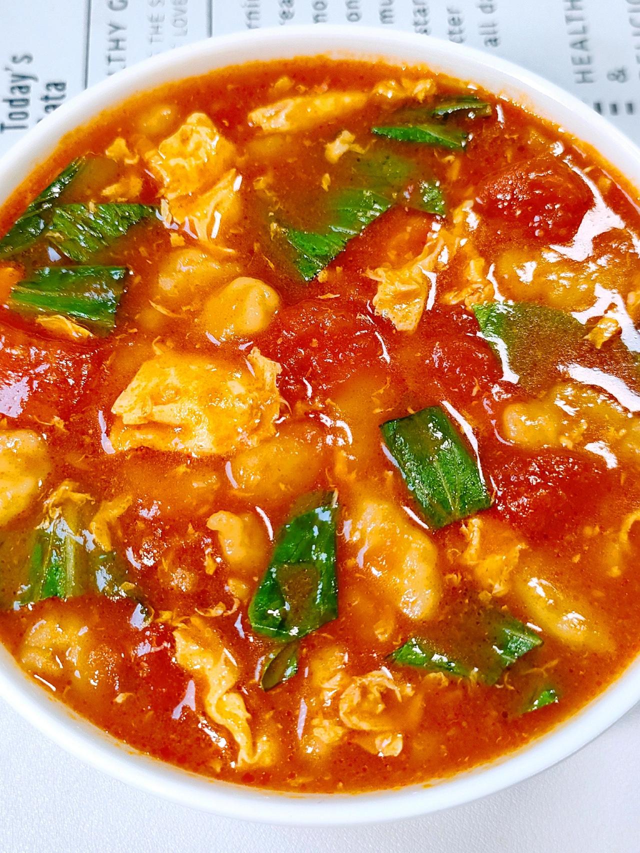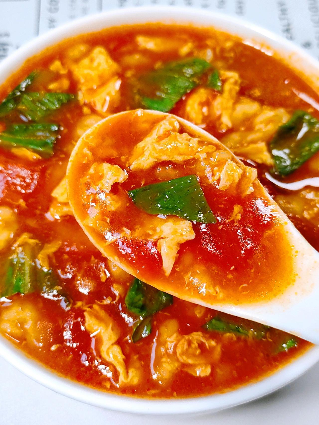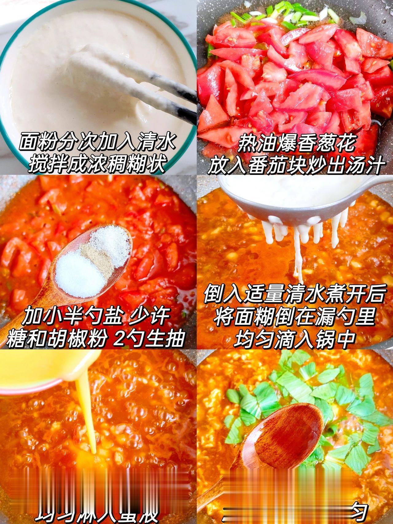快手营养早餐番茄疙瘩汤,巨好吃 不知道做什么的时候就来碗番茄鸡蛋疙瘩汤吧,做法超简单十分钟搞定,营养又美味,家人都爱吃~ 食材:面粉,番茄2个,鸡蛋2个,油菜,葱花。 做法:1、番茄去皮切块,油菜切块,鸡蛋打散,面粉分次加入清水搅拌成浓稠糊状。 2、起锅热油爆香葱花,放入番茄炒出汤汁,加小半勺盐➕少许糖和胡椒粉➕2勺生抽,倒入适量清水煮开。 3、将面糊倒在漏勺里均匀滴入锅中,可以边滴边用勺子在漏勺中轻轻搅拌。 4、面疙瘩煮至成型后均匀淋入蛋液,放入青菜、淋少许香油搅匀即可。