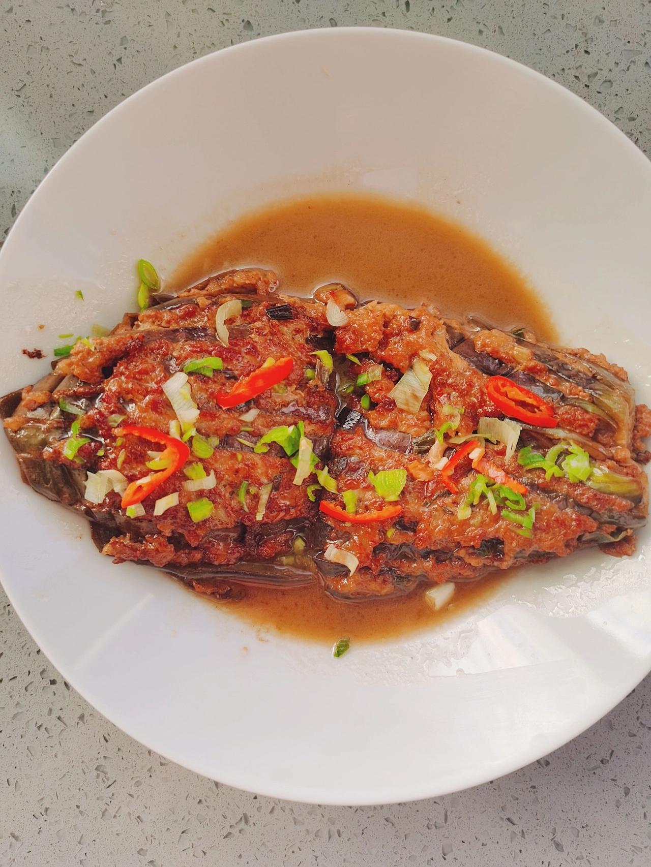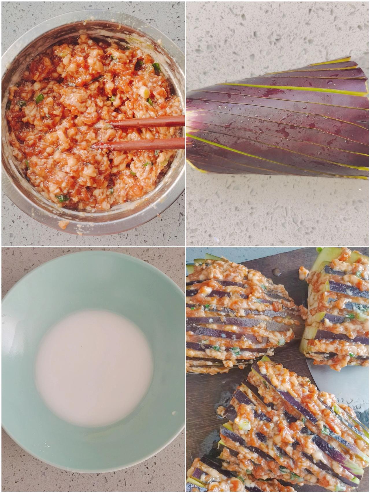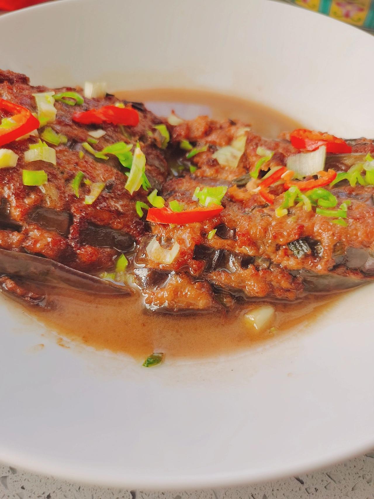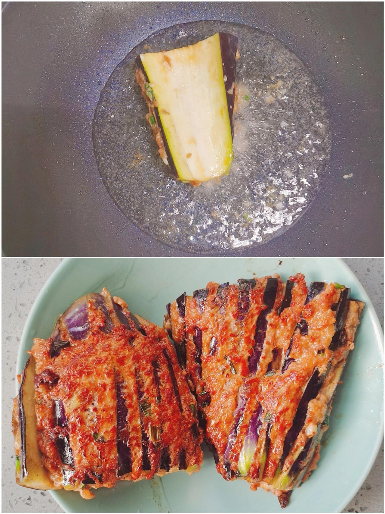 茄子时令蔬菜,最近吃再合适不过了~ 鱼香茄盒又是婆婆的一道拿手菜,快手且下饭,非常适合我们的日常餐桌。 食材:茄子、猪肉糜、盐、生抽、老抽、糖、五香粉、味精、葱花、油、料酒、清水、小米辣、青蒜叶、醋。 做法教程:1、选果实粗圆的茄子,去头,一切两段,然后再对半切开,在茄子光面打上花刀(注意这边不能切到底,另外一面要看不出刀纹) 2、猪肉糜放适量盐、味精、五香粉、老抽、葱花、料酒,搅拌均匀。 3、把搅拌好的肉均匀的塞进茄子的刀缝中,将茄子面上多余的肉抹去。 4、半碗水内放适量淀粉化开,将茄子面朝下浸入淀粉水中,然后取出。 5、起锅烧油,油稍微多一点,油热之后,将茄子刀面朝下煎,煎至茄盒微微焦,盛出备用。 6、锅内留些底油,茄盒回到锅内,加清水没过茄子,加一点生抽、糖、用剩的薄芡水(一点点不用多),大火煮10分钟左右,等到茄子变软,收汁5分钟,关火前沿锅边淋上少量陈醋,出锅撒上小米辣和青蒜叶即可。
