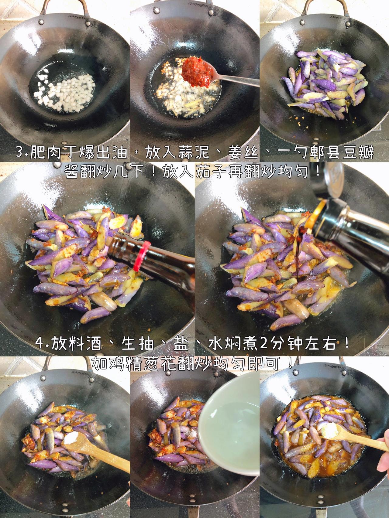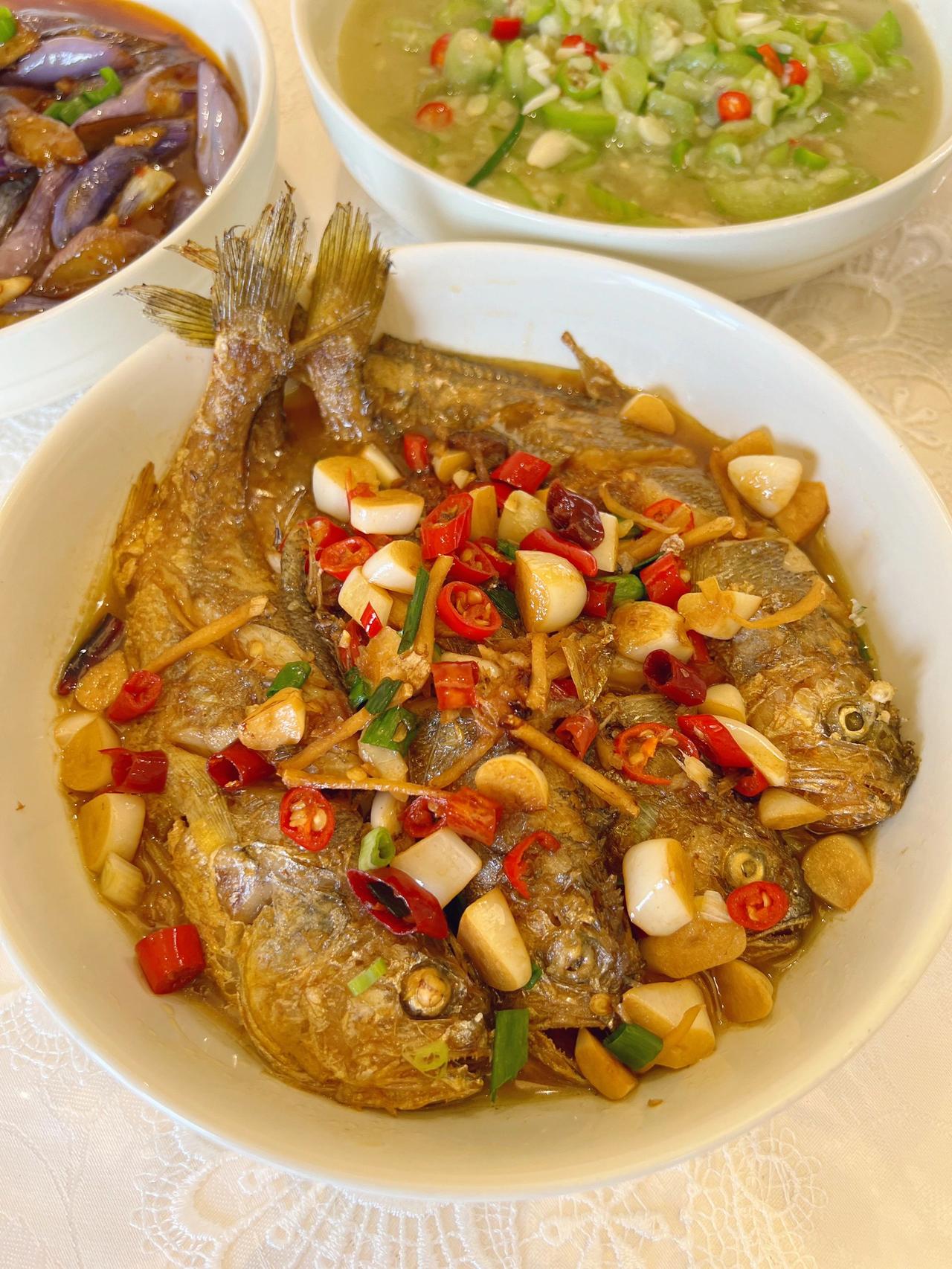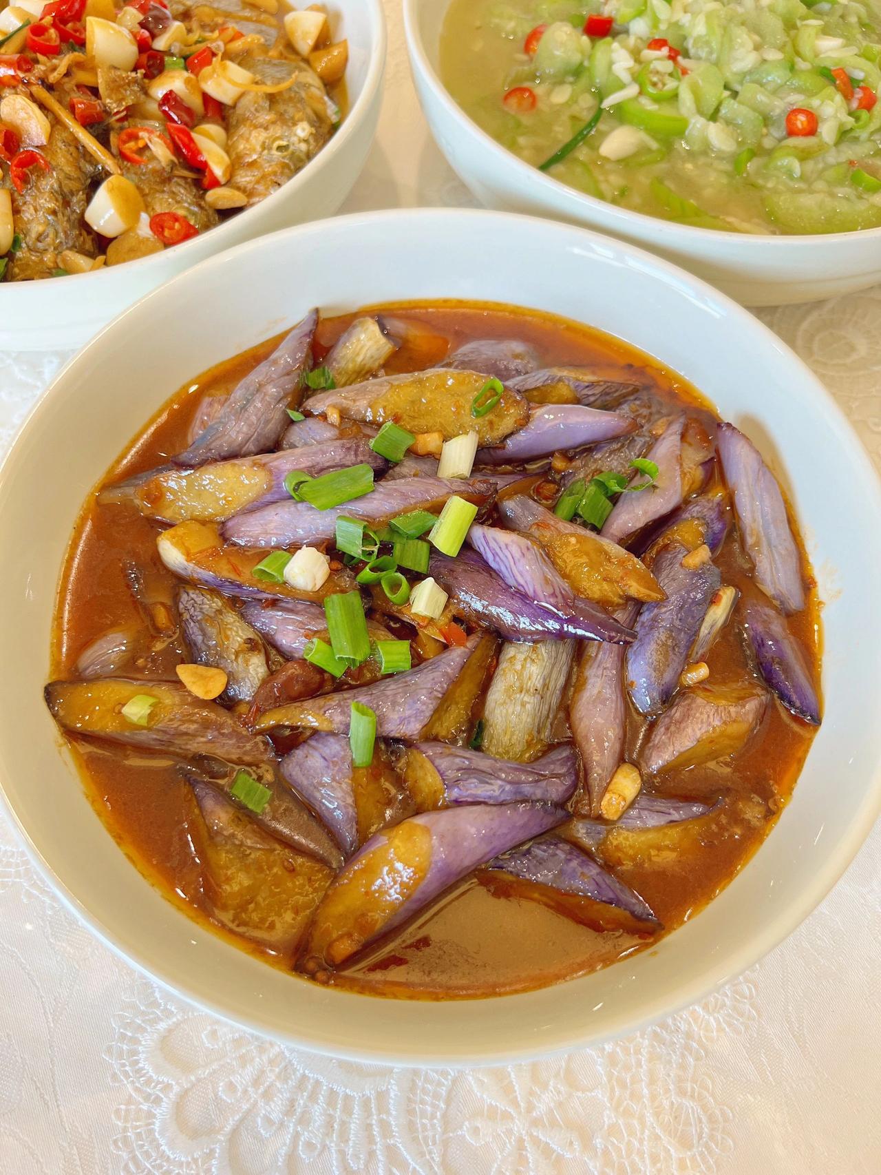愿七月的你不纠结,少俗虑,随遇而安。 以一颗初心,安静地慢煮生活。口号还是茄子、豆角、丝瓜、葫芦和蕃茄!今天茄子换烧法了! 今日菜单! 酱爆茄子 主料:(茄子) 配料:(肥肉丁+蒜泥+姜丝) 1.茄子切滚刀块放生粉抓拌均匀! 2.油热放入炸8-10秒左右捞出备用! 3.肥肉丁爆出油放蒜泥、姜丝、一勺郫县豆瓣酱翻炒几下! 4.放茄子翻炒均匀,加料酒、盐、生抽、水焖煮3分钟左右 5.收汁放鸡精葱花即可! 盐要不要放根据自己的口味来,放了生抽和豆瓣酱咸度也差不多了!还有茄子可以不放生粉直接炸,我是放了,但炸之后看着感觉放了个寂寞,如果不放生粉,煮好收汁的时候放点红薯粉水芶个薄芡会看着味道更浓郁!我是炸的时候拌了生粉,所以煮好汤汁已经挺浓了,就不要再芶芡! 炒丝瓜 主料:(丝瓜) 配料:(青红椒+蒜泥) 1.丝瓜切薄片,猪油热放入丝瓜翻炒2分钟左右! 2.加盐、水煮3分钟,加青红椒、蒜泥、鸡精翻炒熟透即可 我个人烧菜喜欢放肥肉丁或猪油,不喜欢的直接换油即可!还有关于丝瓜放水煮的问题,可以直接炒熟不放水,我喜欢放是因为家里人喜欢用丝瓜汤拌饭,所以基本次次都加水煮一会! 红烧黄鱼 主料:(四条小黄鱼 ) 配料:(蒜仔+姜+干辣椒段+小米椒+葱花) 1.油热鱼煎至两面金黄!放入所有配料(除葱花外) 2.加料酒、盐、生抽、老抽焖半分钟! 3.加水煮 7-8分钟,收汁加鸡精、葱花! 今天鱼超市里买的29.8一斤,四条31块钱!鱼肉很嫩滑!煎鱼不碎,记得油热撒点盐,鱼放下去不要着急翻面!煎一两分钟动锅鱼动再翻面!