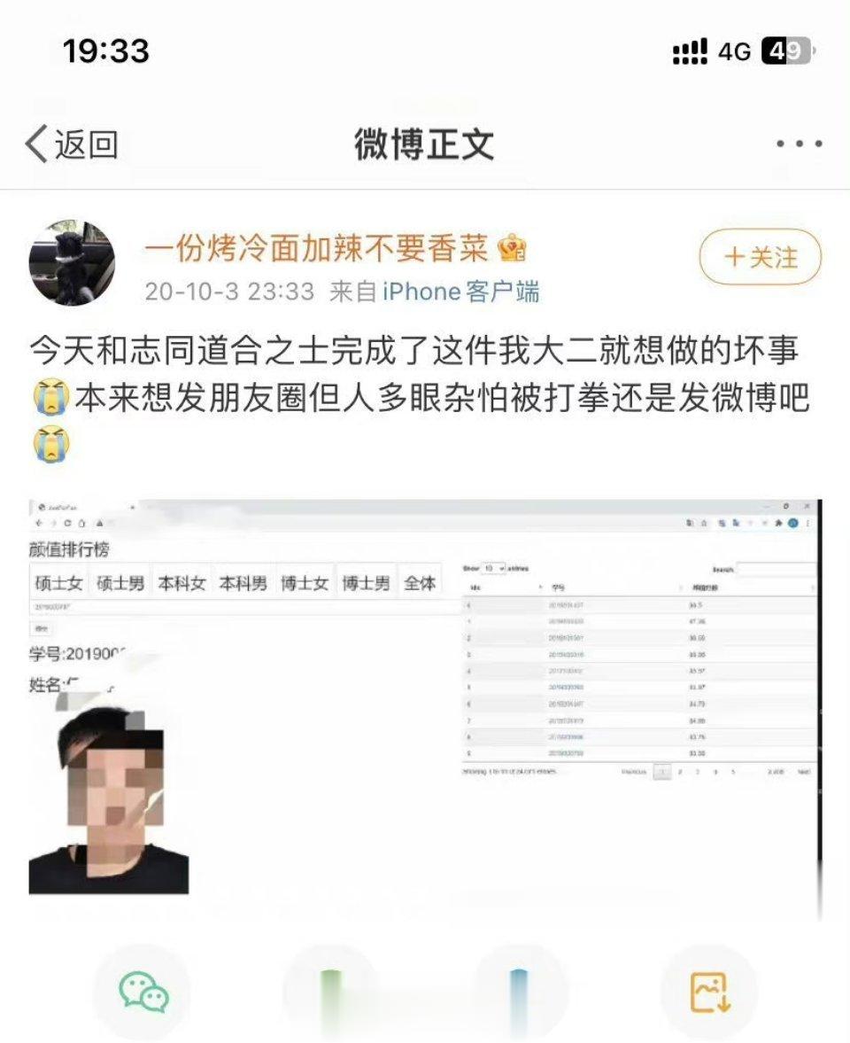 #人大 学生信息#爬取全校女生学生卡信息,做了个颜值打分系统,还在微博上炫耀,如今疑似入职字节跳动…看聊天记录,他技术似乎真的厉害,但直男加法盲太可怕了,这怕是要把自己送进去…[允悲][允悲][允悲]