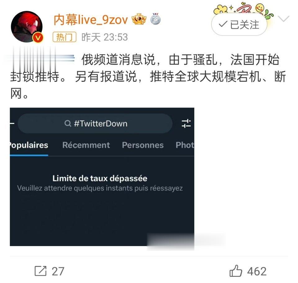 #推特崩了# 的确崩了…一说因为法国骚乱,一说推特全球宕机…总的来说,都不是推特好苗头,用的人越来越少,问题却越来越多。照理如今流量最大的应该TikTok和Instagram,也没出现啥问题啊?