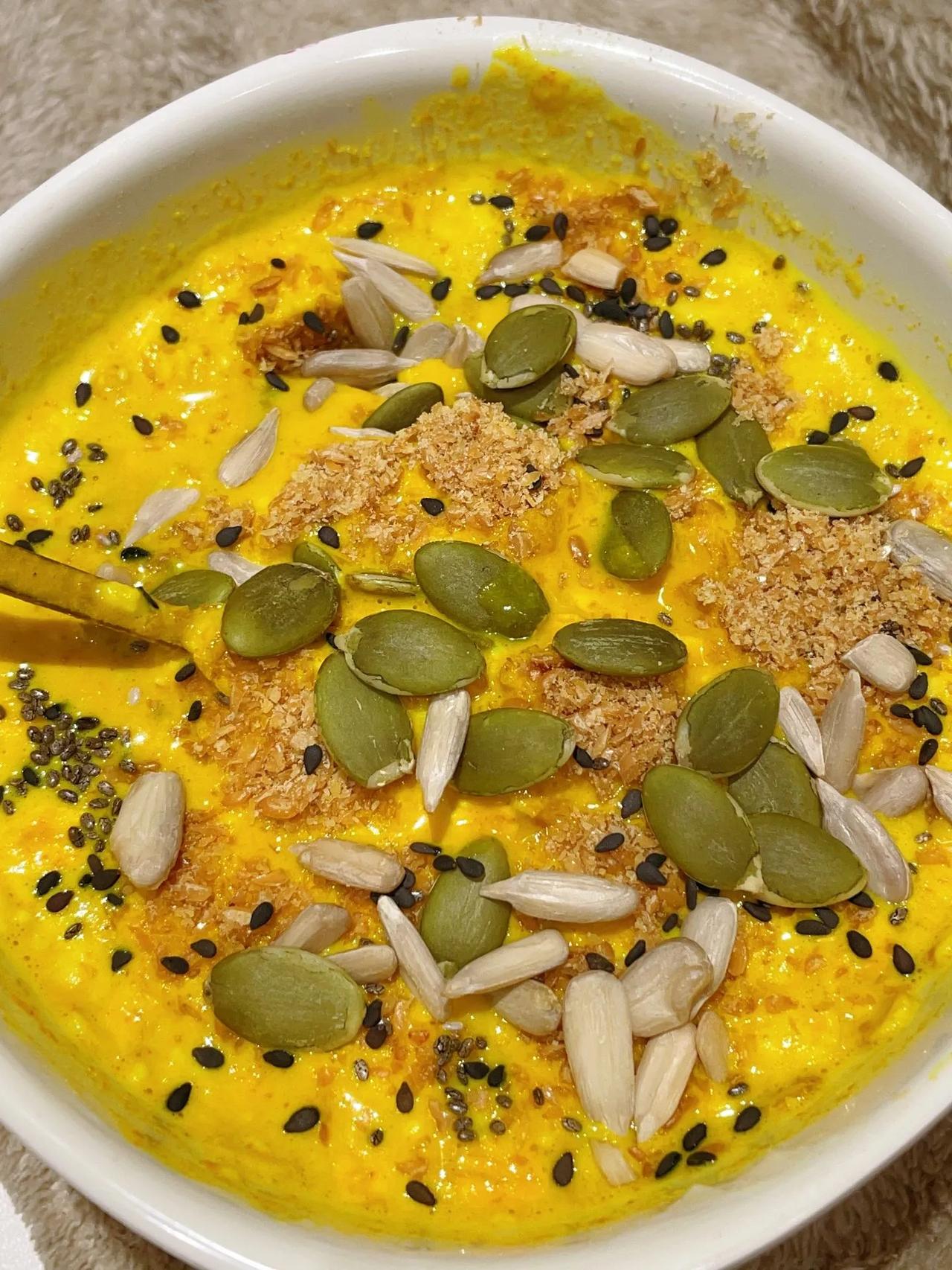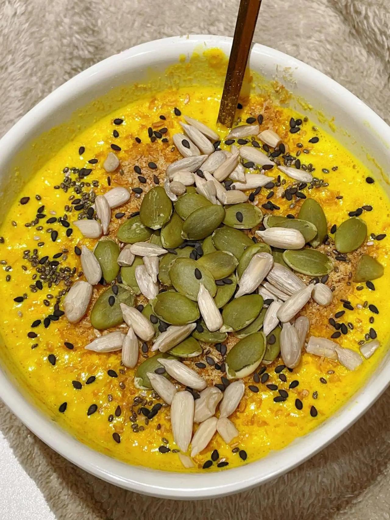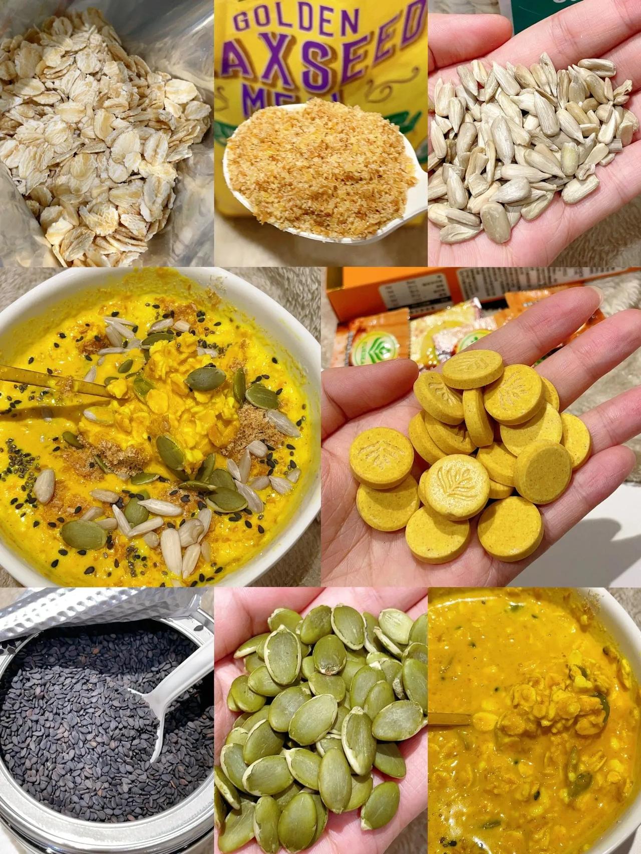 多囊亲测种子循环法,例假来势汹汹! 第1⃣阶段:1-14天:亚麻籽➕南瓜籽仁(从例假第一天开始吃) 第2⃣阶段:15-28天:芝麻➕葵花籽➕亚麻籽 都是吃生的种子,亚麻籽的话建议吃熟的亚麻籽,生的吃多了容易中毒,每种我是每天吃25克,有时打成豆浆喝,有时加在粥里,煮姜黄奶时会加在姜黄奶里一起喝。 吃了两片姜黄黄金奶片后感觉身子暖了,姜黄片原料跟我们平时煮的姜黄奶差不多,也是除了姜黄粉外还有肉桂粉、黑胡椒粉、椰子油、燕麦奶那些压缩制成的黄金奶片,独立一片片随手放包里,想起来了就吃。 碗里面是我自己煮的姜黄奶➕种子(燕麦、亚麻籽、南瓜籽、黑芝麻、葵花籽)