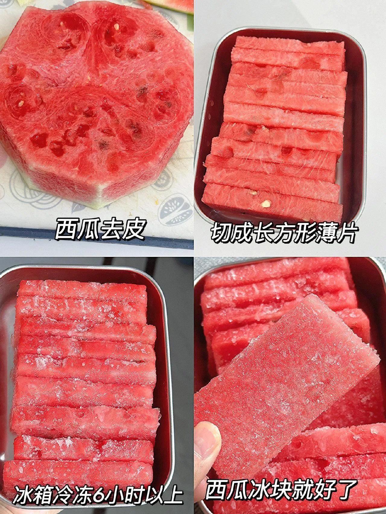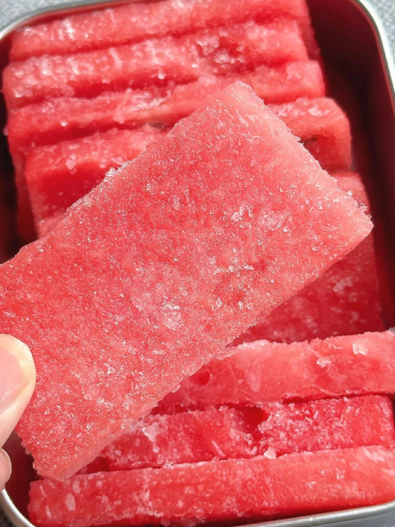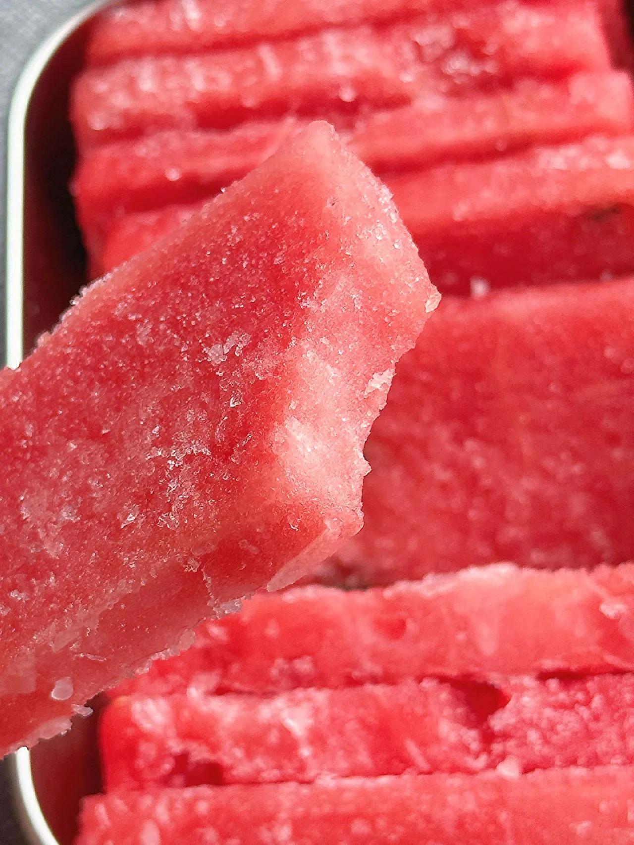 炎热夏天,没什么比咔嚓一口西瓜脆片更爽的! 做法: 1、西瓜去皮,切成长方形薄片; 2、放冰箱冷冻6小时以上。