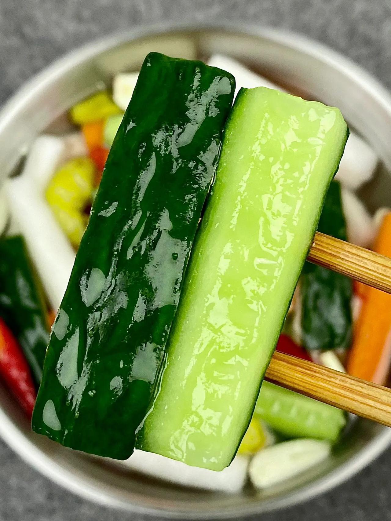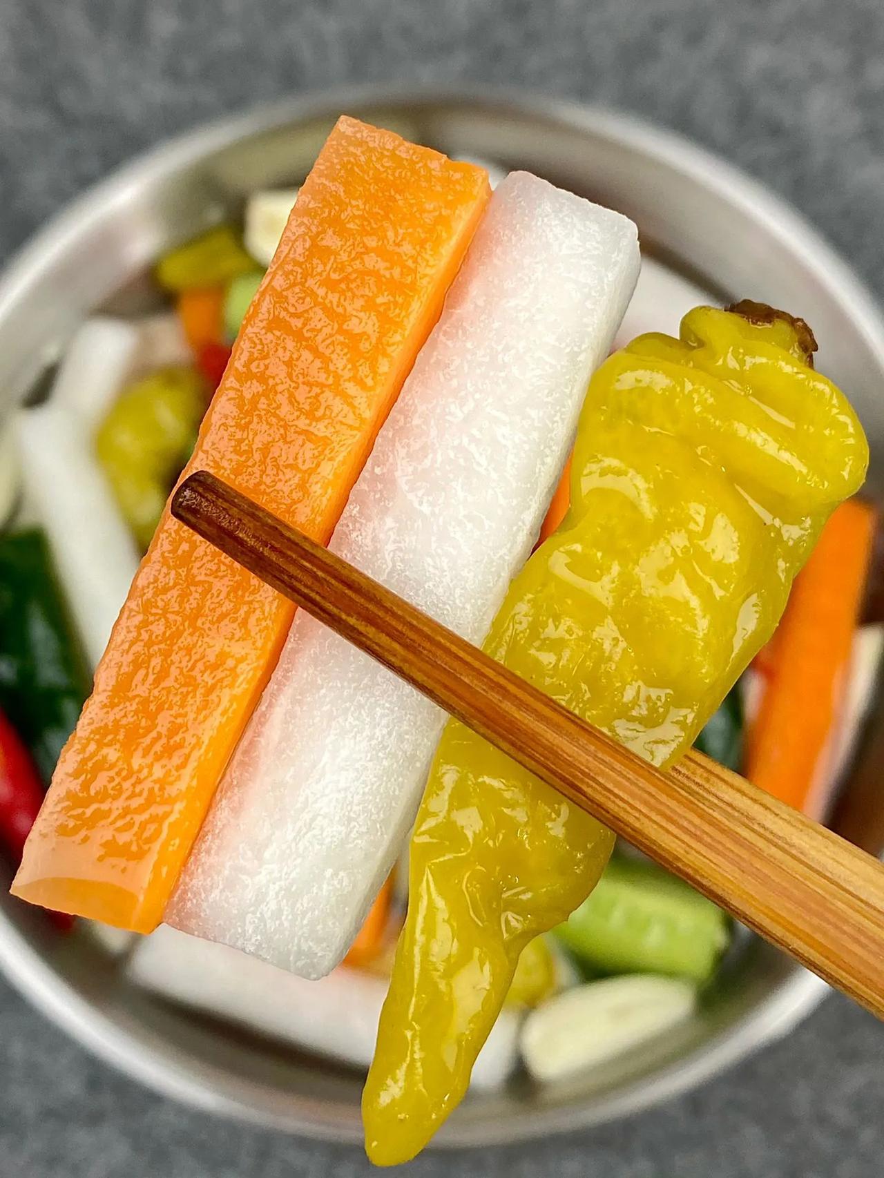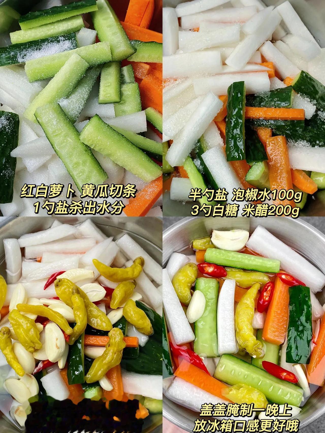 饭店里的泡椒萝卜为什么那么好吃? 这样做的泡椒萝卜,酸辣过瘾清爽脆甜嘎嘣脆!。做法也简单容易上手,大家快来试试吧! 做法: 1、红白萝卜、黄瓜切条加1勺盐杀出水分; 2、加半勺盐、泡椒水100g、3勺白糖、米醋200g,倒入小米辣、蒜片,加凉白开没过食材; 3、盖上盖腌制一晚上 (放冰箱口感更好)。