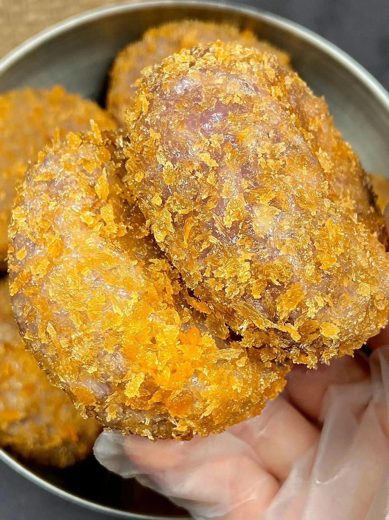 做梦都在做芋泥香酥鸭!是真的好好吃啊!我懂 半夜做梦都是在梦芋泥香酥鸭怎么做!真的好好吃啊! 做法: 1、芋泥加糯米粉揉成面团; 2、烤鸭切小块包起来,压成饼; 3、裹上蛋液和面包糠,放空气炸锅170度烤15分钟,中间翻一次面即可。