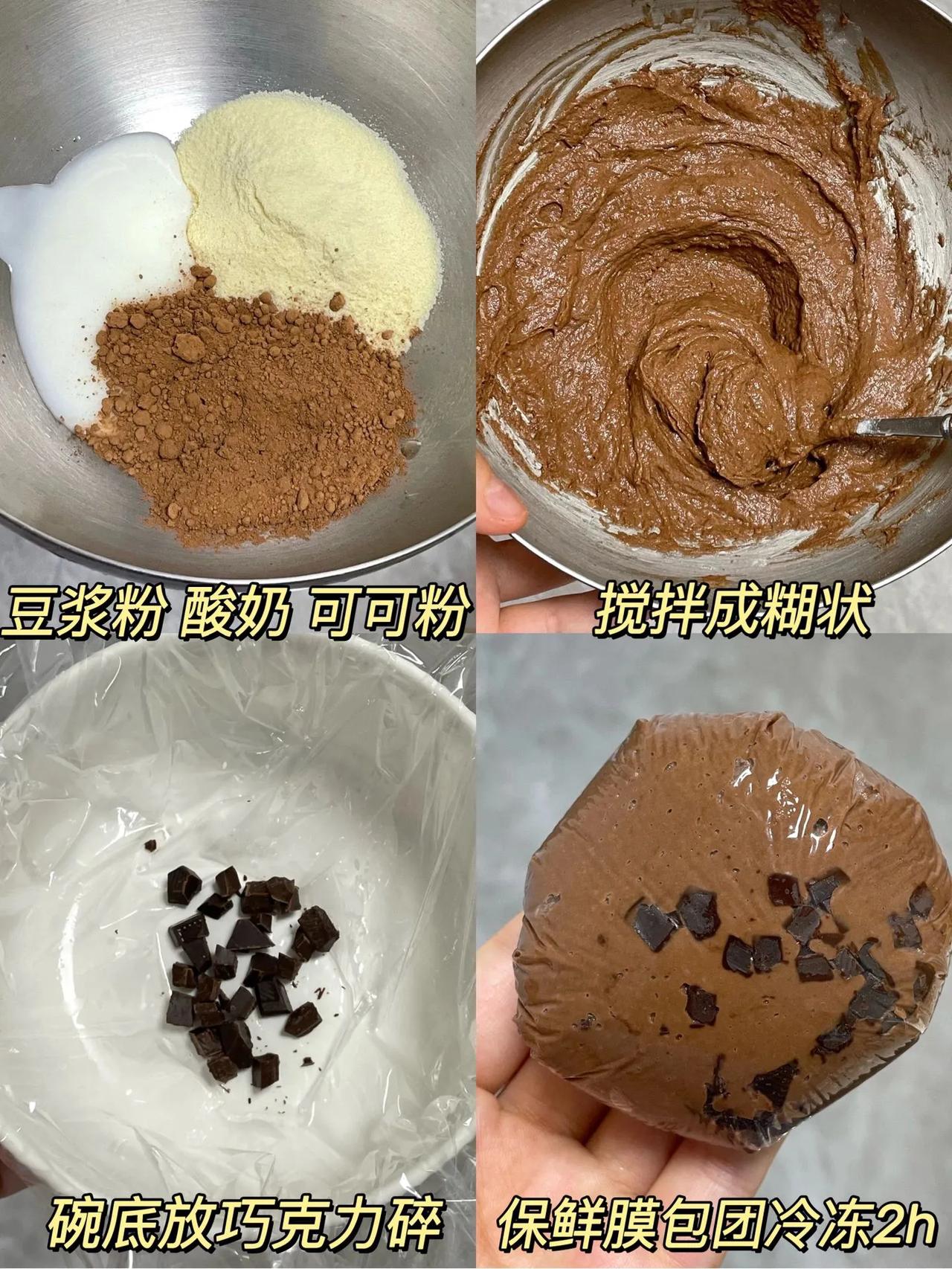 会做的人越多…倒闭的甜品店越多救命…真的好吃晕了! 你们快去做这个低卡的可可酸奶球!只需要三步搞定! 做法: 1、豆浆粉加酸奶加可可粉,搅拌成糊状; 2、碗底放巧克力碎,放上糊糊,用保鲜膜包团冷冻2小时即可。