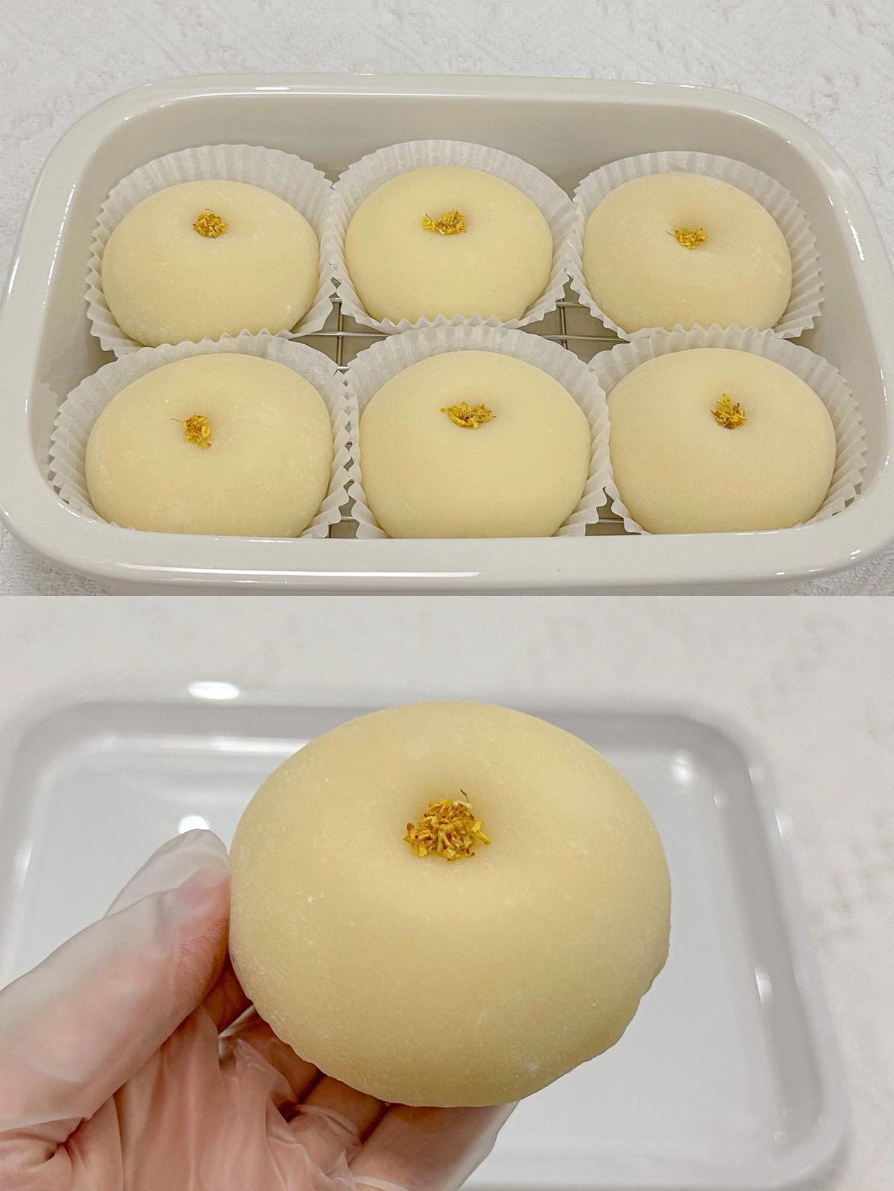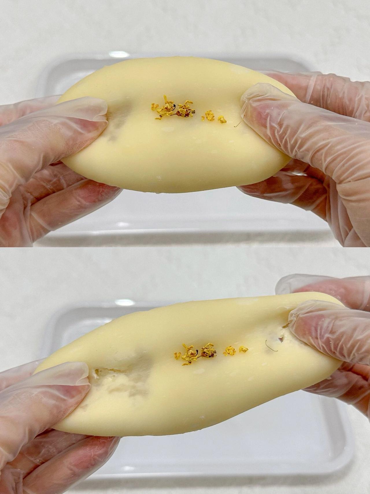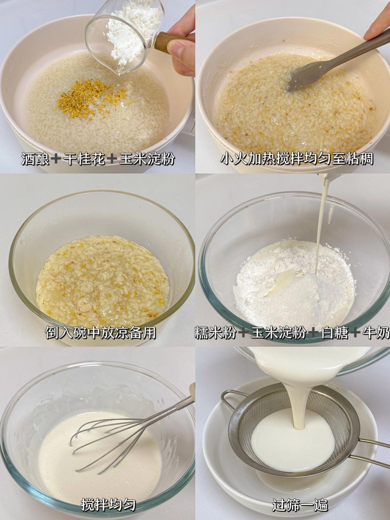 没人能拒绝如此糯叽叽的桂花酒酿冰软酪吧!! Q弹的外皮搭配香甜的桂花酒酿和酸奶奶酪馅 奶fufu,冰冰凉凉,软糯拉丝好吃到停不下来了~ 超级简单,不用烤箱,喜欢的一定要去试试哟~ 食材:糯米皮:糯米粉120g、玉米淀粉30g、白糖20g、牛奶180g、黄油15g 酒酿夹心:酒酿200g、玉米淀粉10g、干桂花1g 奶酪馅:奶油奶酪250g、白糖25g、酸奶120g 做法:1、酒酿+干桂花+玉米淀粉,小火加热搅拌均匀至粘稠后倒入碗中放凉,放凉后装入裱花袋备用。 2、糯米粉+玉米淀粉+白糖+牛奶搅拌均匀,过筛一遍,附上保鲜膜,扎几个小孔,上锅蒸25分钟左右。 3、奶油奶酪+白糖打发至顺滑,加入酸奶搅打至细腻顺滑,装入裱花袋备用。 4、面团蒸熟后加入黄油揉匀,反复拉扯面团更Q弹,整理成光滑面团,取40g面团擀圆,放在模具上,挤入一圈奶酪馅,中间挤入酒酿夹心,再挤上一圈奶酪馅,收口包紧,抹上熟粉防粘,倒扣在纸托上,中间按一个小窝窝,放上干桂花装饰即可。