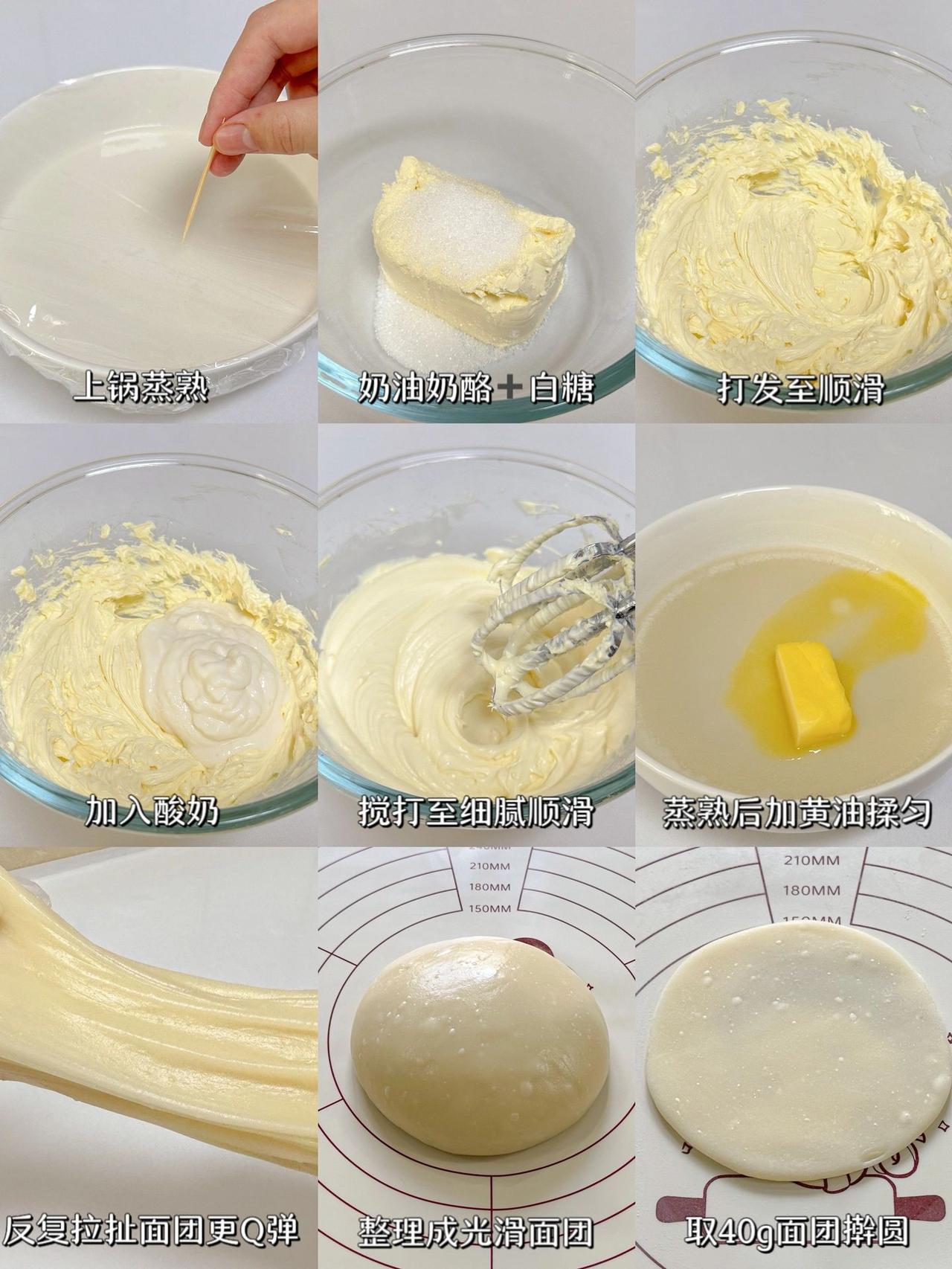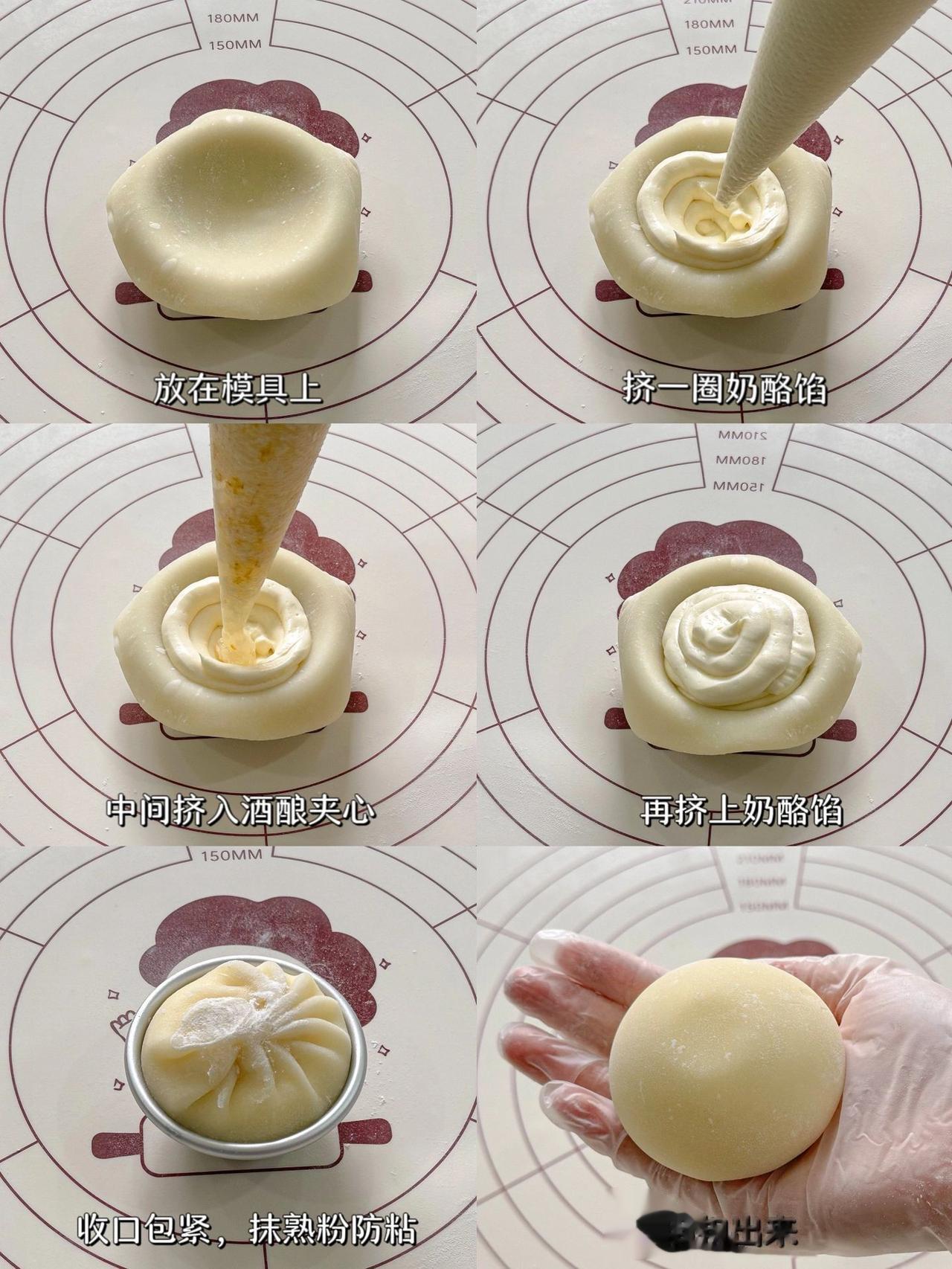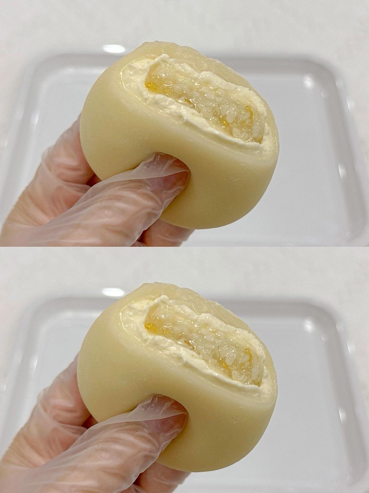 没人能拒绝如此糯叽叽的桂花酒酿冰软酪吧!! Q弹的外皮搭配香甜的桂花酒酿和酸奶奶酪馅 奶fufu,冰冰凉凉,软糯拉丝好吃到停不下来了~ 超级简单,不用烤箱,喜欢的一定要去试试哟~ 食材:糯米皮:糯米粉120g、玉米淀粉30g、白糖20g、牛奶180g、黄油15g 酒酿夹心:酒酿200g、玉米淀粉10g、干桂花1g 奶酪馅:奶油奶酪250g、白糖25g、酸奶120g 做法:1、酒酿+干桂花+玉米淀粉,小火加热搅拌均匀至粘稠后倒入碗中放凉,放凉后装入裱花袋备用。 2、糯米粉+玉米淀粉+白糖+牛奶搅拌均匀,过筛一遍,附上保鲜膜,扎几个小孔,上锅蒸25分钟左右。 3、奶油奶酪+白糖打发至顺滑,加入酸奶搅打至细腻顺滑,装入裱花袋备用。 4、面团蒸熟后加入黄油揉匀,反复拉扯面团更Q弹,整理成光滑面团,取40g面团擀圆,放在模具上,挤入一圈奶酪馅,中间挤入酒酿夹心,再挤上一圈奶酪馅,收口包紧,抹上熟粉防粘,倒扣在纸托上,中间按一个小窝窝,放上干桂花装饰即可。