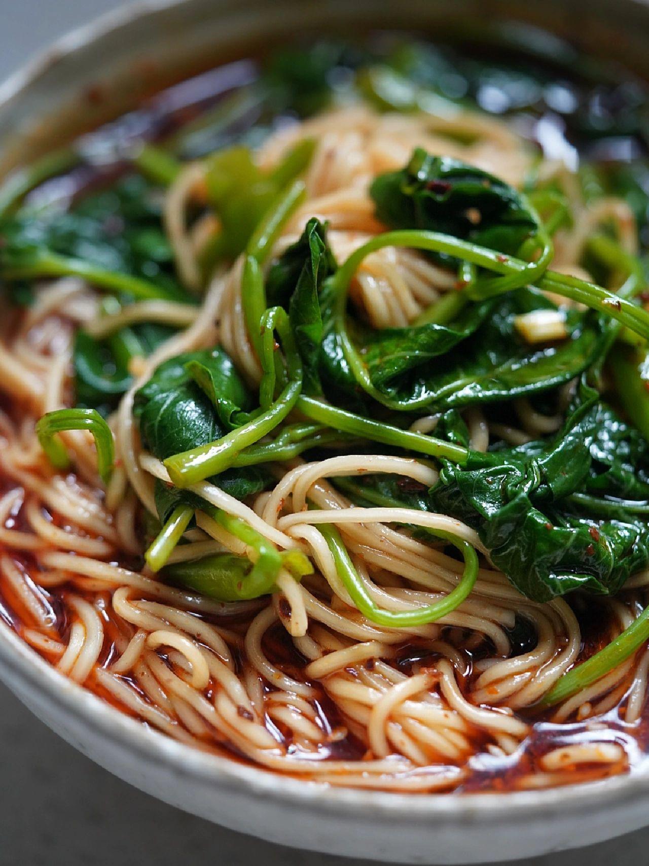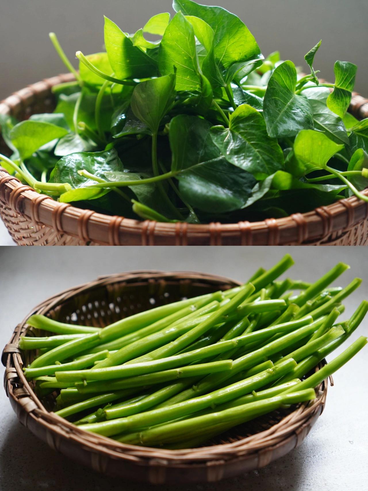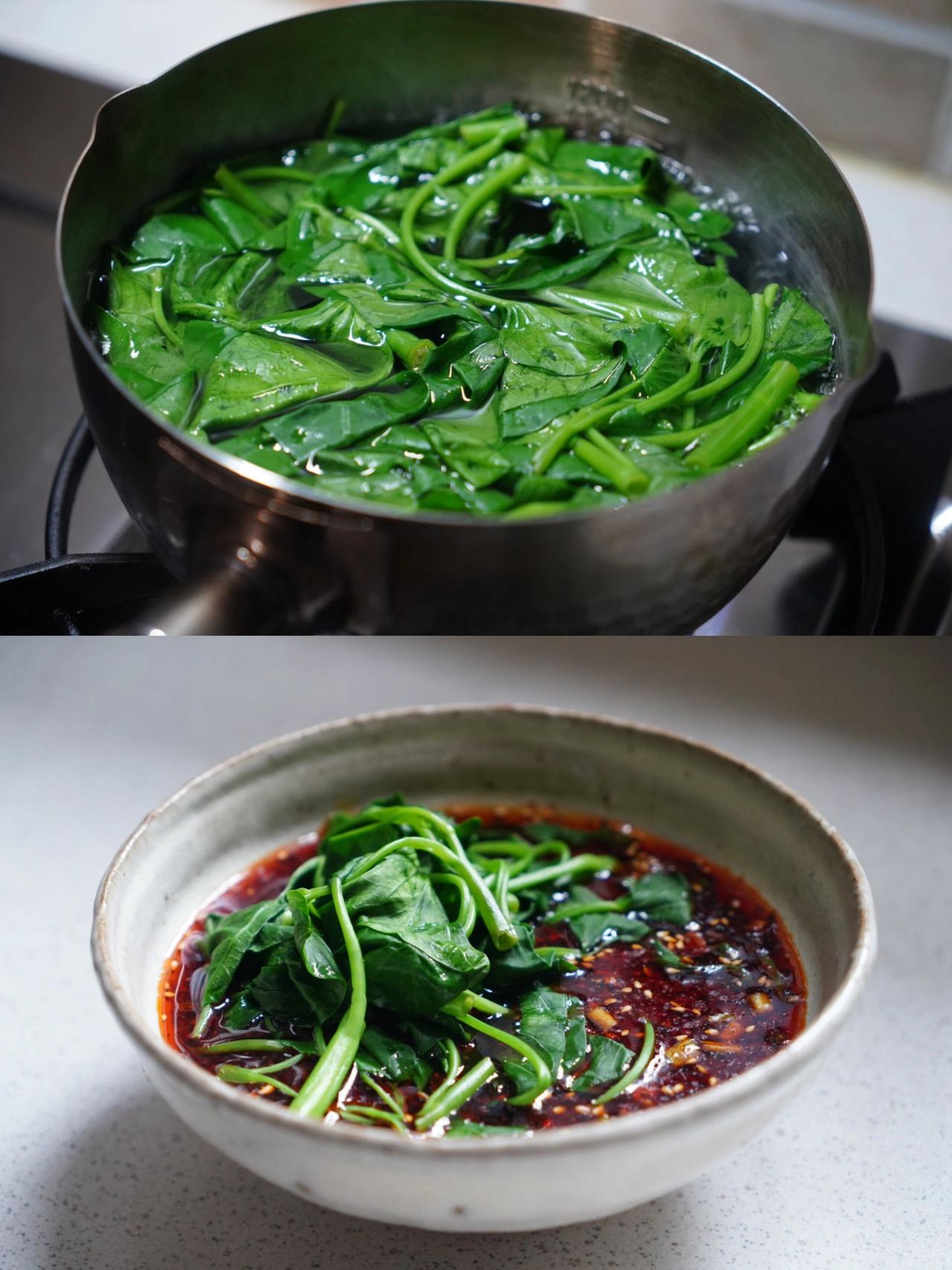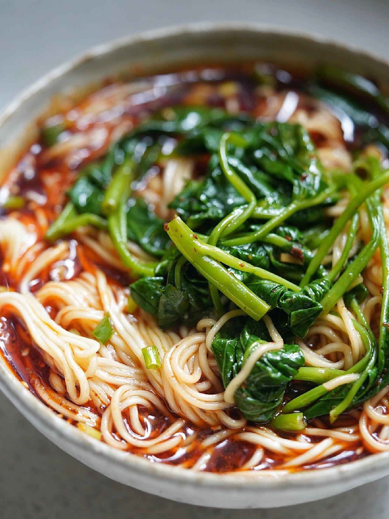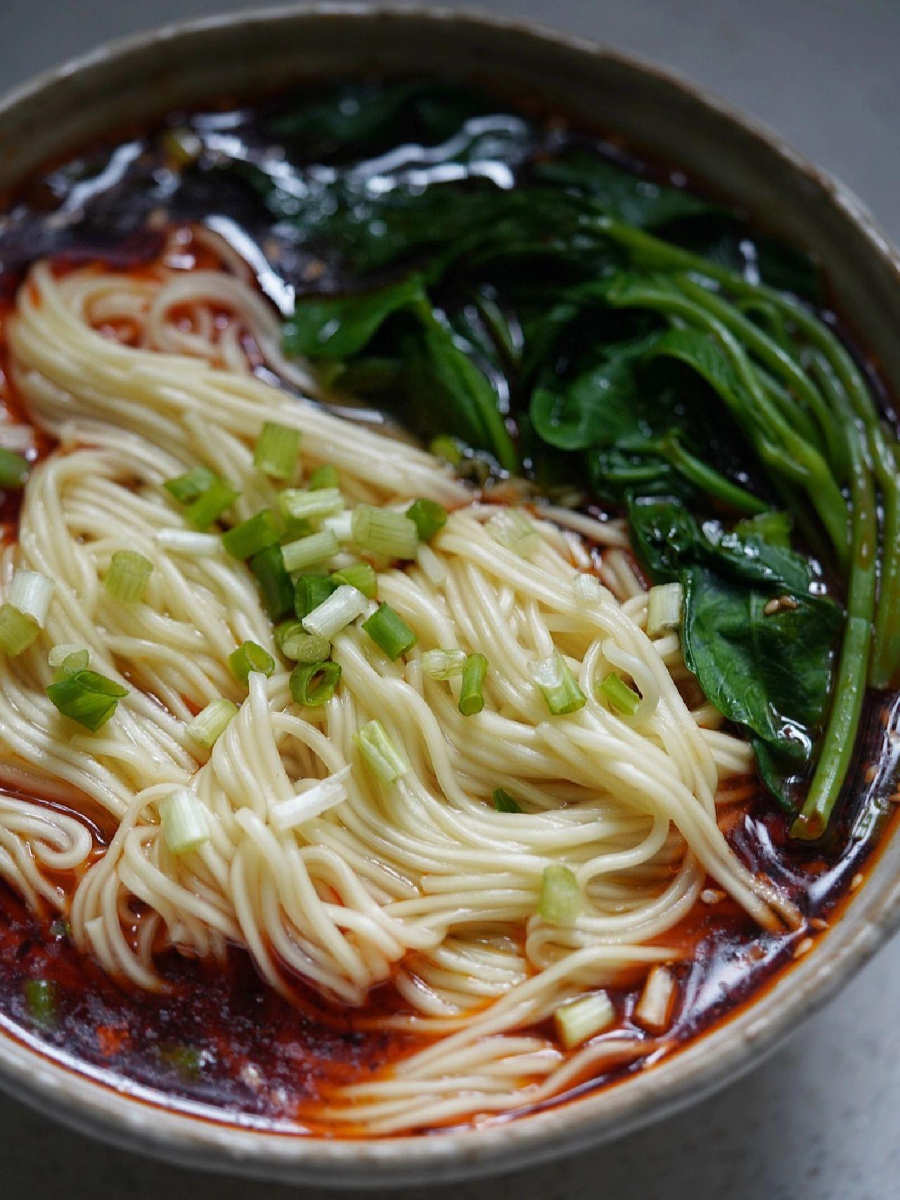 空心菜,在重庆叫藤藤菜,不是北方那种细叶的空心菜 我们爱的是宽叶,梗也很嫩。 大概是重庆人夏天的本命天菜。 当小面馆都把打底蔬菜换成藤藤菜的时候,也就是一年里最值得天天吃小面的季节了~ 自己在家做小面,奢侈一点,只用掐尖的最嫩的一段来配面。 至于剩下的杆子,切小段再呛炒个小素,下稀饭也是极完美的 食谱·重庆小面 1、烧一锅水,等水开的时候先打佐料 2、大勺红油、姜蒜水1勺、花椒粉1小勺+花椒油适量、酱油1勺、榨菜颗颗1小勺、芝麻、花生碎1小勺、一小点猪油、一点点糖,醋和味精随喜、葱花一小把、烧开的水舀几勺进来,把调料化开,尝尝咸淡,根据自己喜好可以再加点盐或者酱油 2.烫菜:也就几十秒,叶子变软变绿就捞起来,加进调料碗里,打底 3.煮面:菜市场、超市到处都能买的碱水面,软软的,不粗不细刚刚好。也可以用挂面、土面、不要太细的,真的会差点意思。 煮好捞出来放碗里,拌匀,开吃吧~ 小面佐料的配比需要根据自己的喜好来;但最最最重要的是红油,红油不一样,味道真的不一样;辣椒选择、火候掌握都至关重要 之后看有机会再出一篇煎油辣子的教程吧